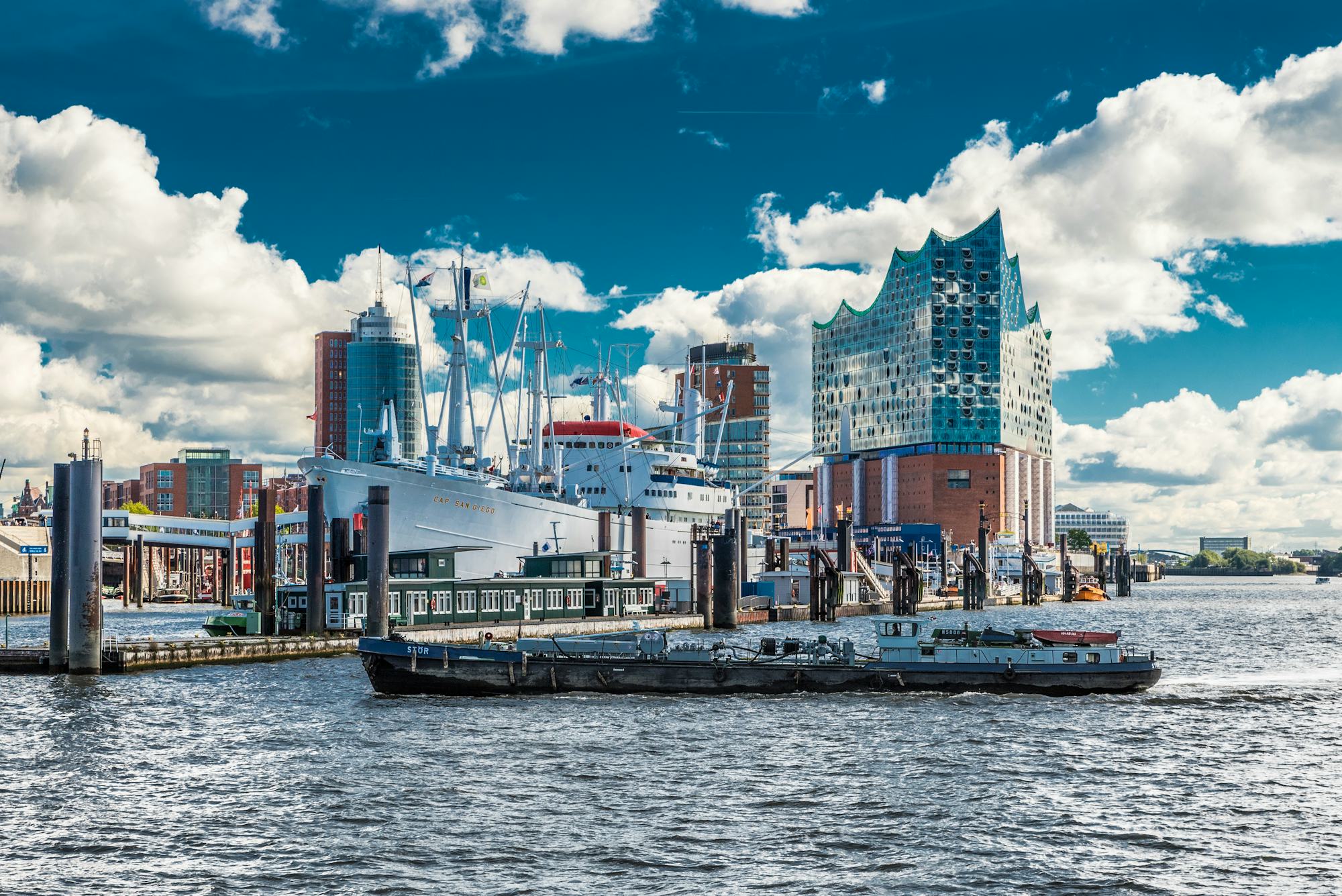 Die Plaza zwischen dem alten Kaiserspeicher und der gläsernen Fassade bietet aus 37 Metern Höhe einen phantastischen Blick über Elbe, Hafen, und die Stadt. Der moderne Aufbau der Glasfassade soll an Wellen oder Segel erinnern und besteht aus mehr als 1.100 unterschiedlich geformten Elementen. Im Inneren befinden sich ein Hotel, Luxus Wohnungen, mehrere Restaurants sowie Konzertsäle.