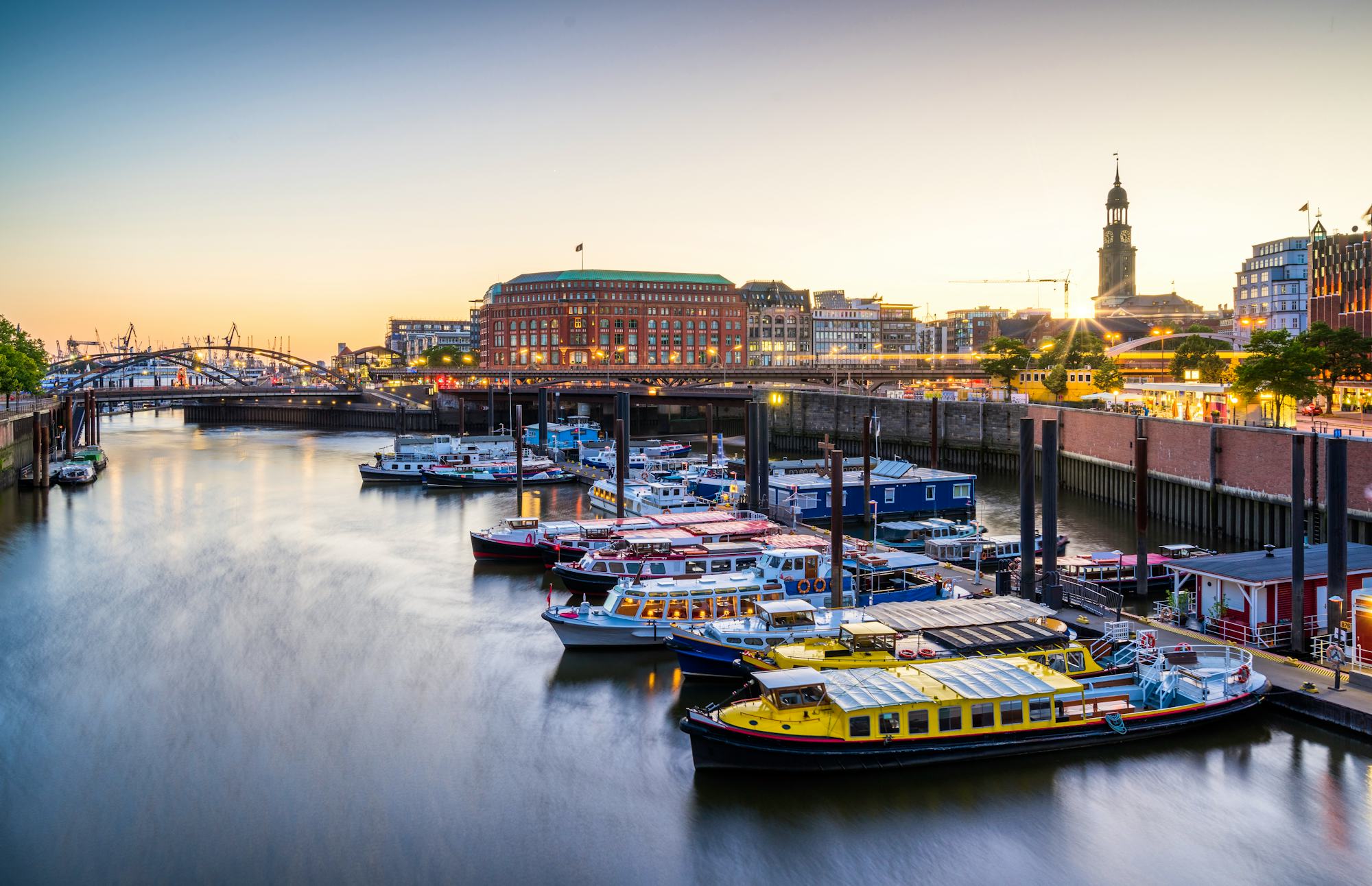 Die Landungsbrücken stellen wohl das beliebteste Motiv Hamburgs dar. Das imposante Gebäudeensemble diente einst als Anlegestelle für Dampfschiffe. Heute starten von dort aus viele Boote zur Hafenrundfahrt und Katamarane nach Helgoland. Besonders beliebt sind der Pegelturm, der Kuppelbau des Alten Elbtunnels und die markanten Brücken zum Schiffsanleger.