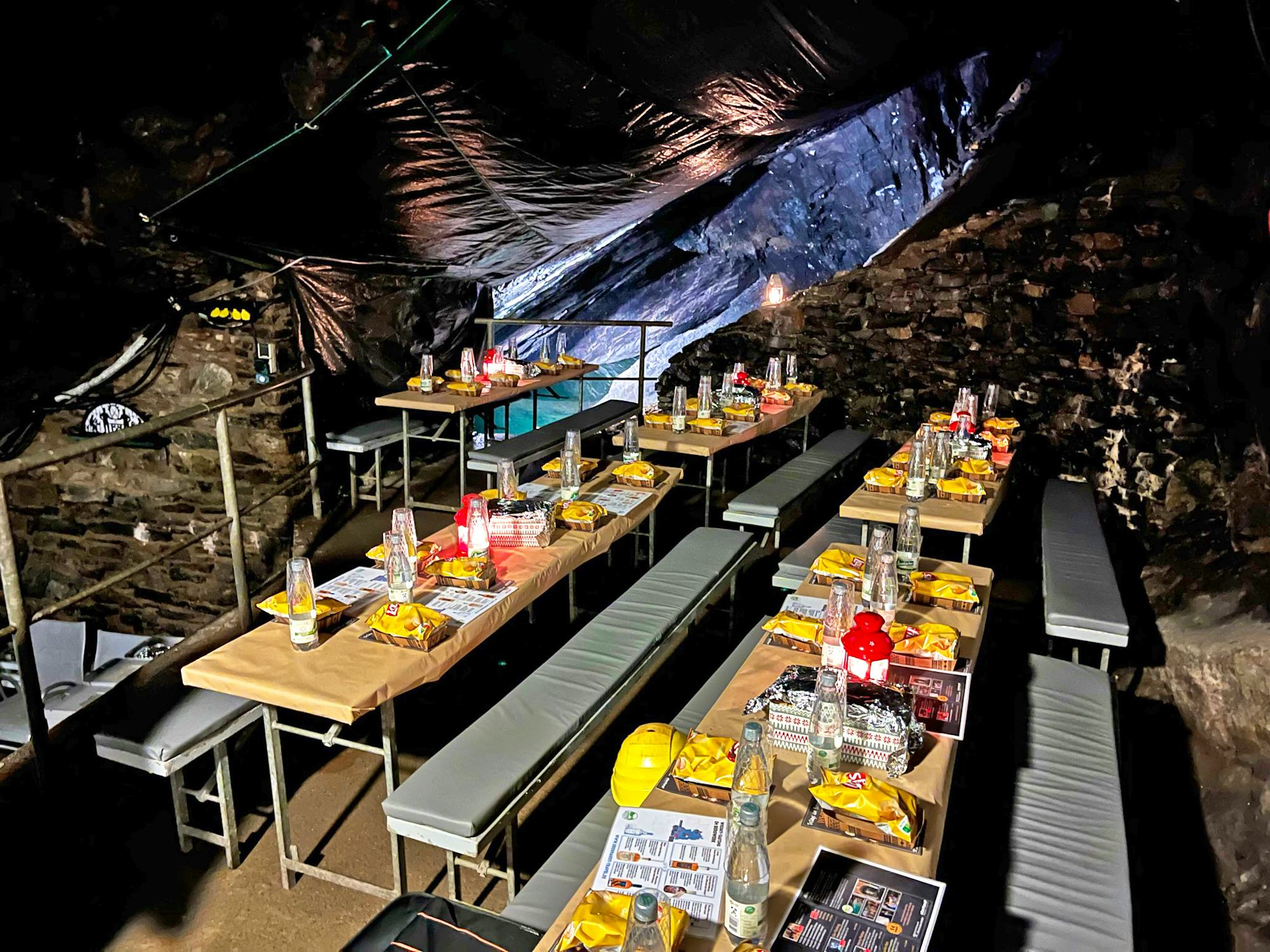 Gegen 19:00 Uhr beginnt unsere Einfahrt in den "Marie Louise Stolln". Dort erwartet uns ein Gin-Tasting von sechs Gins à 0,2 l, begleitet von einem Bildervortrag über die Regionen im Mutter-Gottes-Lager im Inneren des Stollns.