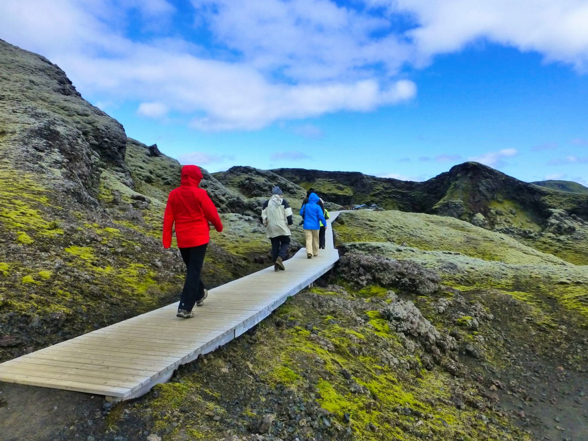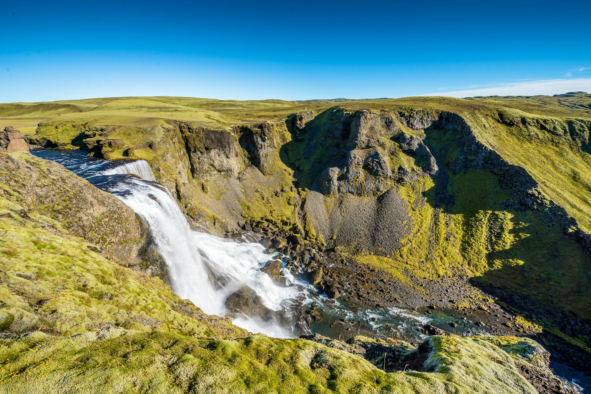 Entlang der Südküste fahren Sie in das isländische Hochland und unternehmen eine Wanderung entlang der Krater in Laki, die auch Lakagigar genannt werden. In diesem recht abgelegenen Ort im Vatnajökull-Nationalpark geschah im Jahre 1783 die größte Naturkatastrophe Islands. Am Pfingstmontag begann die Erde auf einer Länge von über 25 Kilometer aufzureißen und gewaltige Lavaströme bedeckten eine Fläche von insgesamt 600 Quadratkilometern, zerstörten unzählige Ländereien und vergifteten Tiere und Menschen. Weite Teile Europas bekamen die Auswirkungen ebenfalls zu spüren, denn ein dichter Schwefelnebel zog sich bis zum europäischen Festland und brachte Missernten und Hungersnöte mit sich. Die entstandenen Krater sind weltweit ein einzigartiges Phänomen und Sie werden das vulkanische Wunderland auf Ihrer Wanderung genauer betrachten. Im Anschluss besuchen Sie den Fagrifoss, übersetzt der schöne Wasserfall. Nach einem leichten Aufstieg erhaschen Sie einen beeindruckenden Blick auf den 80 Meter hohen Wasserfall.