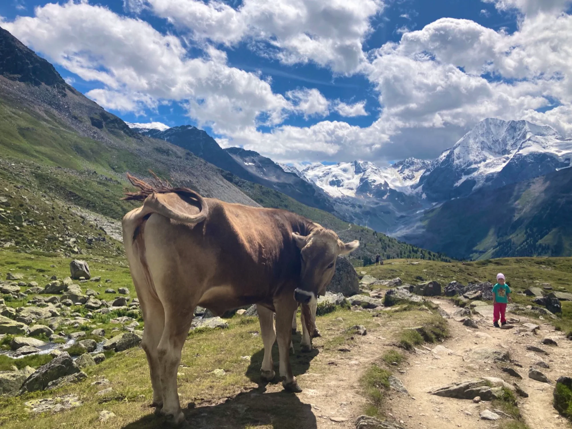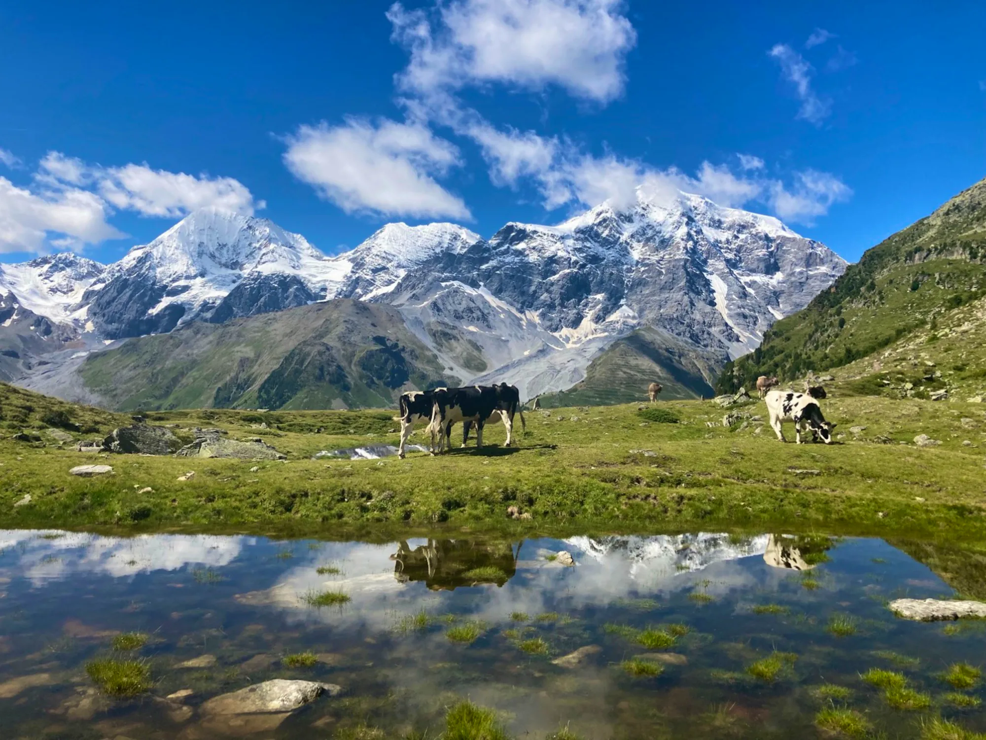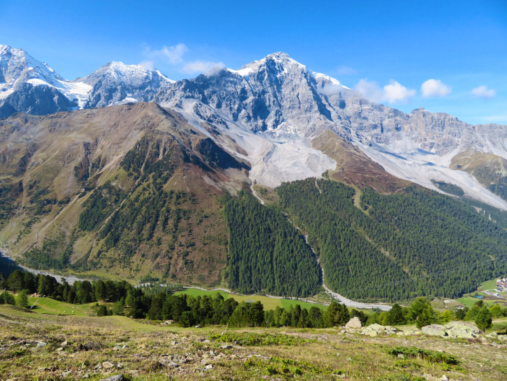 Der Abstieg erfolgt anschließend zunächst auf dem gleichen Weg wie der Aufstieg, zweigt aber dann ab und Sie wandern über Almwiesen und durch den Wald hinunter nach Sulden.
