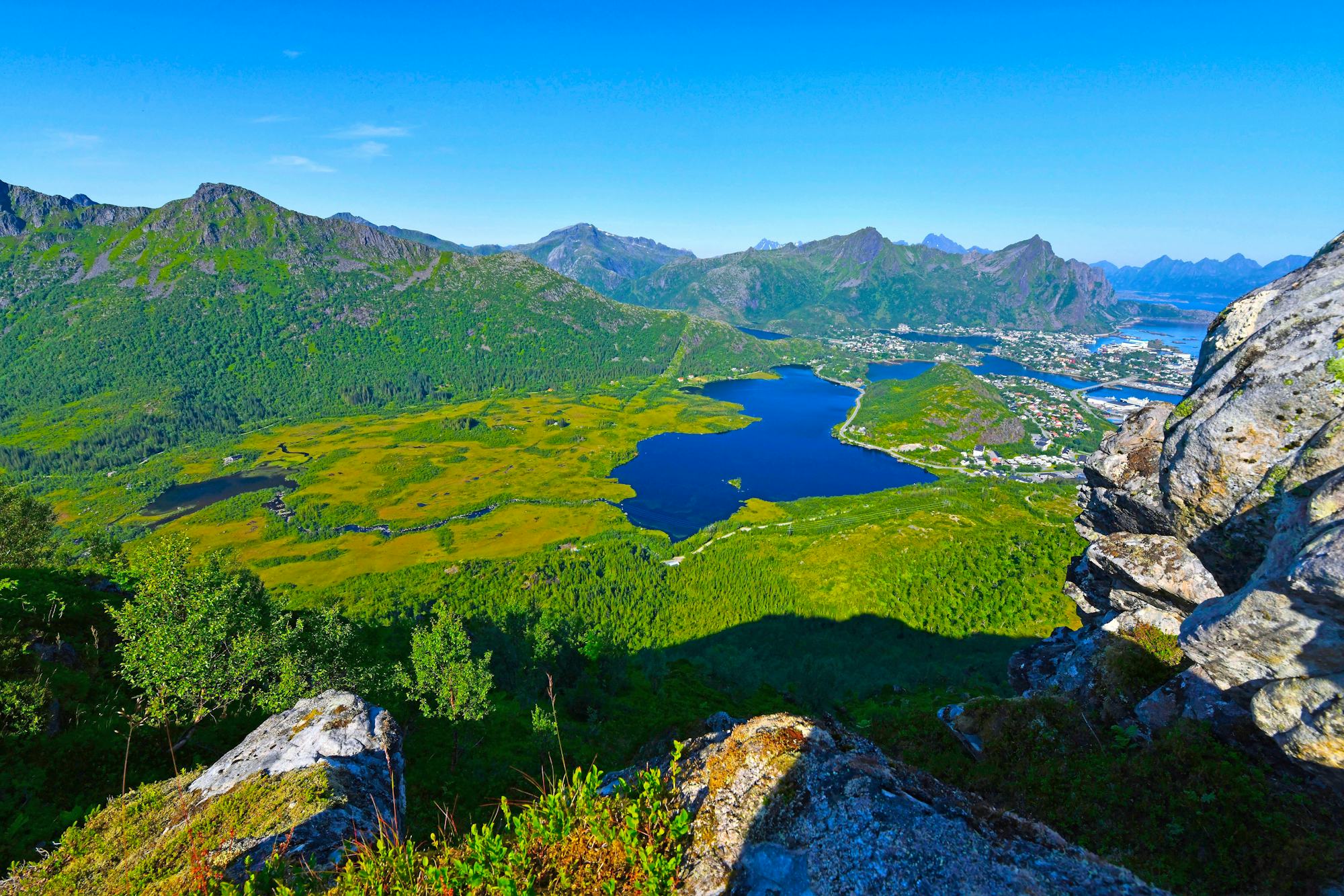 Der Tjeldbergtinden gilt als einer der besten Panoramaberge der Region. Oben angekommen, werden Sie mit einem atemberaubenden 360-Grad-Blick belohnt: Im Süden breitet sich der tiefblaue Vestfjord vor Ihnen aus, während im Norden die dramatische Bergkulisse der Lofoten-Inseln mit ihren schroffen Gipfeln und tief eingeschnittenen Tälern für unvergessliche Ausblicke sorgt.