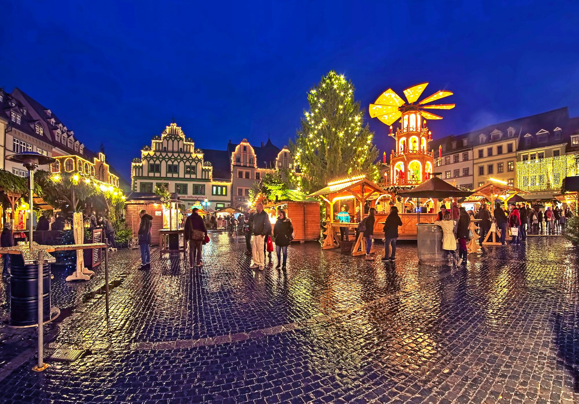 Weimars wunderschöne Altstadt mit ihren liebevoll restaurierten Plätzen, Gassen und klassizistischen Fassaden wird zur Adventszeit feierlich geschmückt. Der Weimarer Weihnachtsmarkt auf dem Marktplatz hat bis in den Januar geöffnet und gehört zu den schönsten in Thüringen: Vor der Kulisse des historischen Rathauses, mit Blick auf die Stadtkirche St. Peter und Paul, bietet er Glühwein, Thüringer Spezialitäten, Kunsthandwerk und einen nostalgischen Lichterzauber. Am Nachmittag fahren Sie zurück nach Hause.