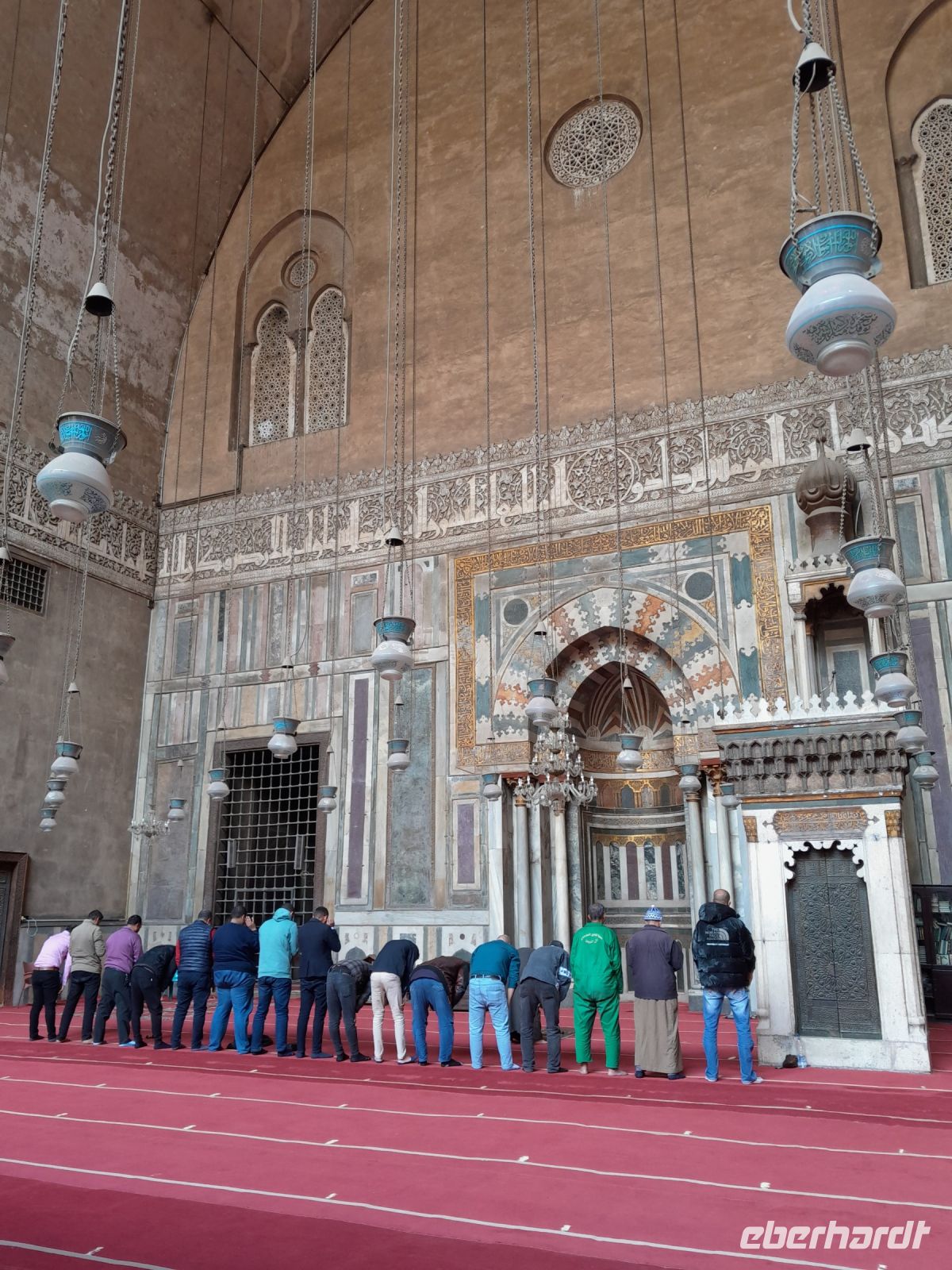 Wir fahren weiter und erblicken bald vor uns die sog. Zitadelle, welche vom Sultan Saladin im 12.Jahrhundert erbaut wurde und ein Bollwerk gegen die Kreuzritter sein sollte. Trutzig sind denn auch die Mauern. Innerhalb der Zitadelle besuchen wir die Muhammad Ali Moschee, auch Alabastermoschee genannt. Sie ist eine von mehreren 100 Moscheen Kairos und heute ein Museum. Sie wurde von Muhammad Ali zu Beginn des 19.Jahrhunderts im osmanischen Stil errichtet. Wir ziehen unserer Schuhe aus und betreten einen großen Raum mit beeindruckender Kuppel. Hoch ragen die hohen Gewölbe in den Himmel.
