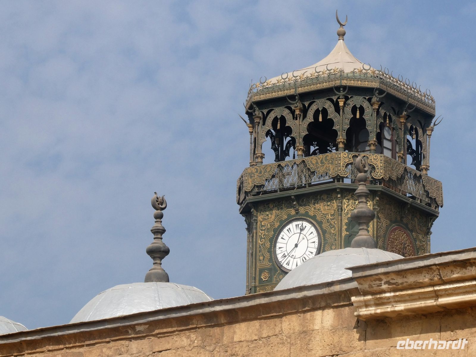 Wir haben von der Zitadelle einen guten Blick über einen Teil der Stadt von riesigen Ausmaßen mit ihren Türmen und Kuppeln. Wir werfen auch einen Blick auf die Uhr welche ein Geschenk von Louis Philippe an Mohamed Ali Pascha war.