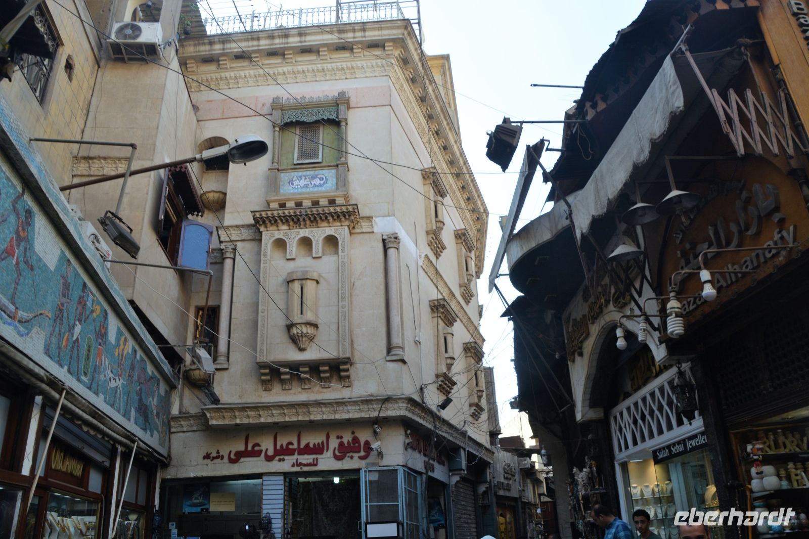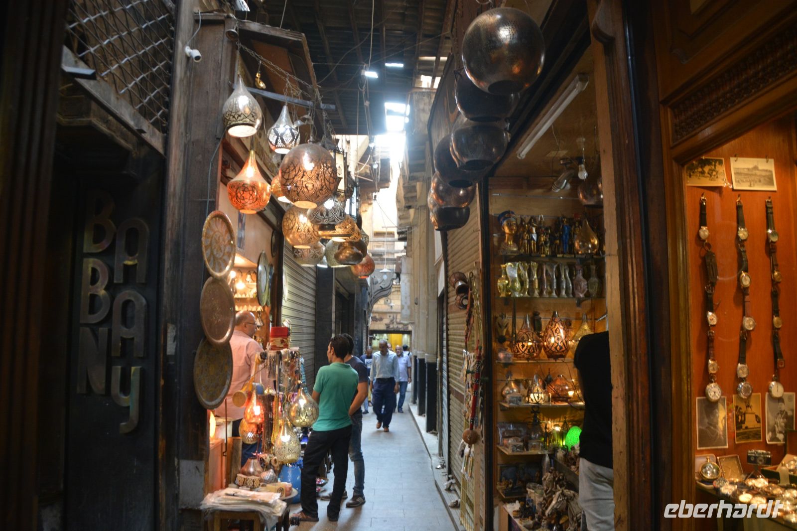 Nun aber nach diesem beeindruckenden Erlebnis fahren wir weiter im großen Verkehrstrubel, vorbei am spektakulären Postamt zu dem größten Bazar des Orients, dem Khan-el-Khalili aus dem 14.Jahrhundert. Wir wollen ihm wenigstens einen Kurzbesuch abstatten,. Er hat gigantische Ausmaße und nimmt uns gleich freundlich auf. In unserer Welt kursieren ja viele Geschichten über die Gefahren auf den Märkten des Orients aber wirklich gefährdet, außer uns zu verlaufen, sind wir hier nicht. Auch besteht die weitere Gefahr etwas zu kaufen, denn die Händler hier sind freundlich aber wollen natürlich ihre Waren an den Mann bzw. die Frau bringen. Aber unsere Reise beginnt ja erst und deshalb sind alle zurückhaltend. Zum Handeln was man in Ägypten tun muss haben wir heute keine Zeit. Wir nehmen noch einen Tee oder einen Kaffee in dem bekannten Caféhaus Fishawy zu uns. Hier kann man auch wieder Nargileh oder Shisha rauchen, was währnd der Coronazeit streng verboten war. Der sog. türkische Kaffee mit Kardamom gewürzt ist stark und süß.