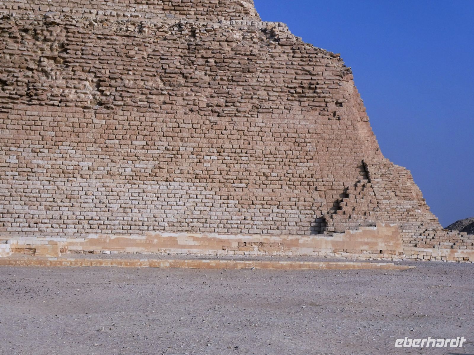 Nach dem Eingang durchqueren wir die Eingangs-Kolonnade. Die Händler warten schon auf uns und jeder versucht, etwas Geld zu verdienen, ist doch der Unterschied zwischen Arm und Reich im Land groß. Wir sind sehr früh und deshalb können wir in Ruhe die Stufenpyramide, welche das Werk des großen Architekten Imhotep war, besichtigen. Eigentlich sollte es eine Mastaba (ein flacher Grabbau) werden, wurde dann aber doch eine Pyramide was zur damaligen Zeit eine Neuerung darstellte. Diese Pyramide des Djoser stammt aus der 3.Dynastie des Alten Reiches (2700 - 2600 v.Chr.) und ist der erste Monumentalbau der Welt aus behauenen Steinen. Man glaubte, dass der Urgott im Wasser existierte und die Menschen aus Tränen erschaffen waren. Ein schönes Bild in einem Wüstenland, in dem der Nil die Lebensader schlechthin bedeutet - ohne Wasser kein Leben. Danach besuchen wir eine angrenzende Mastaba mit wunderschönen Wandreliefs aus dem Alltagsleben am Nil.