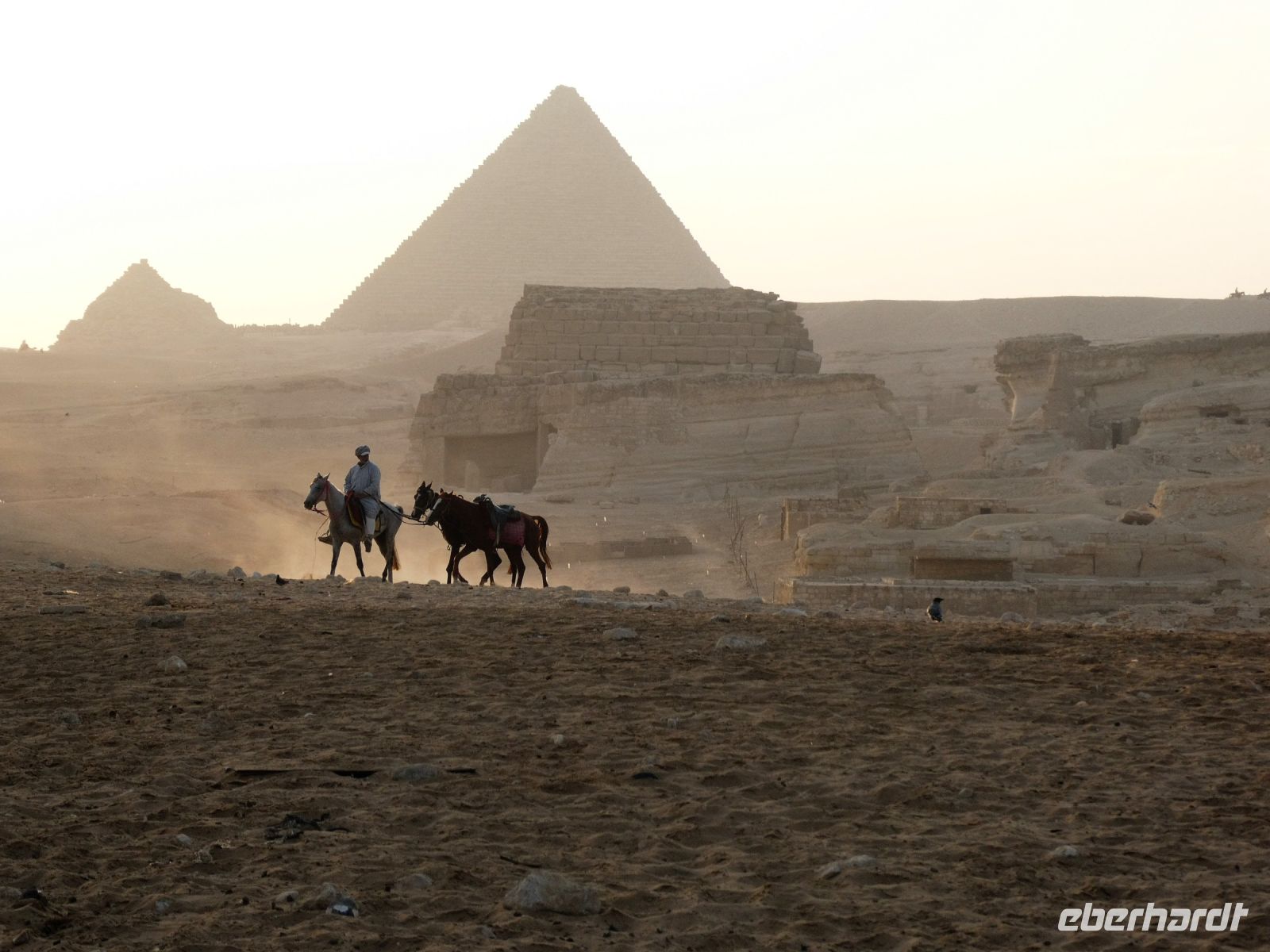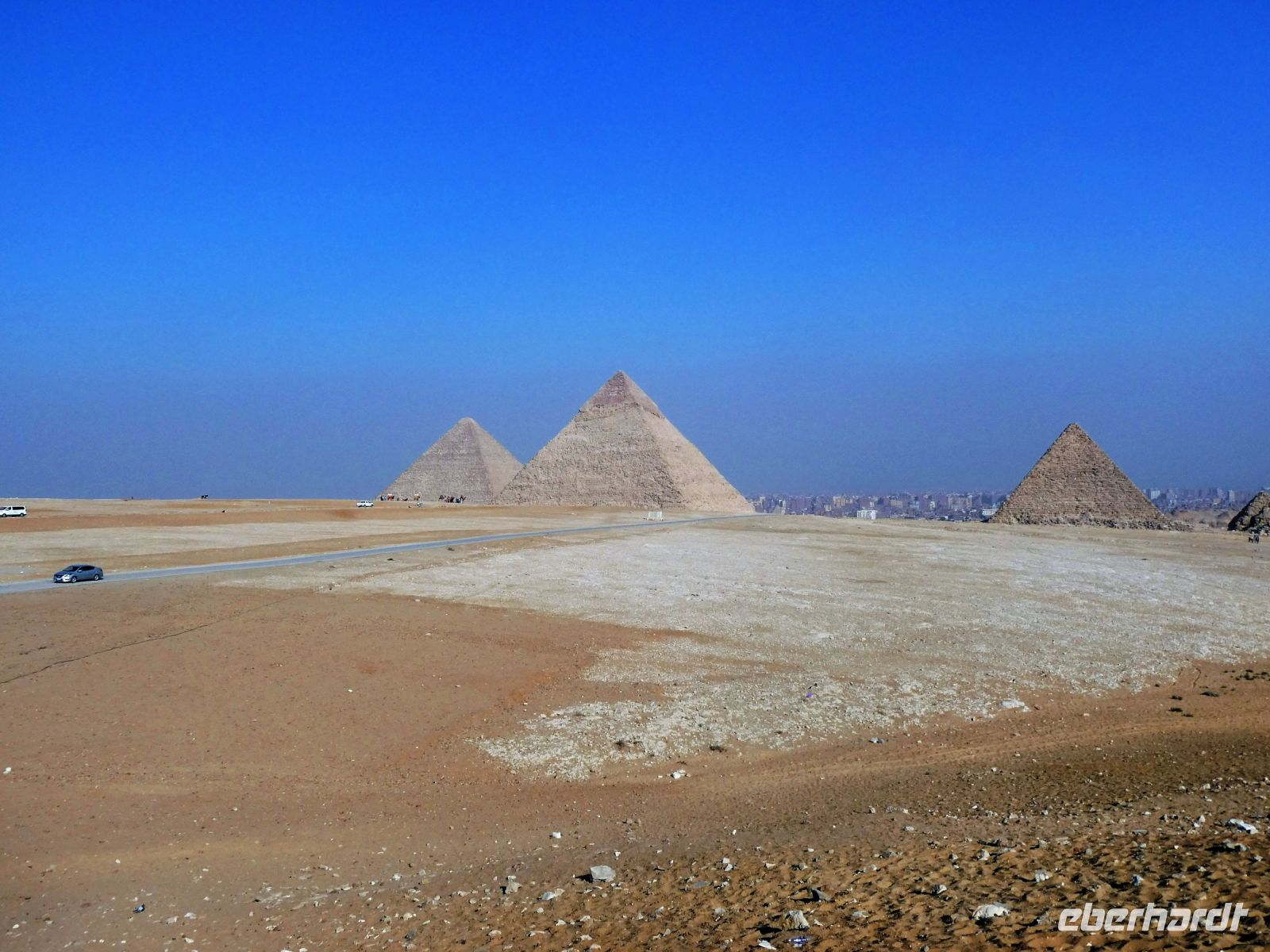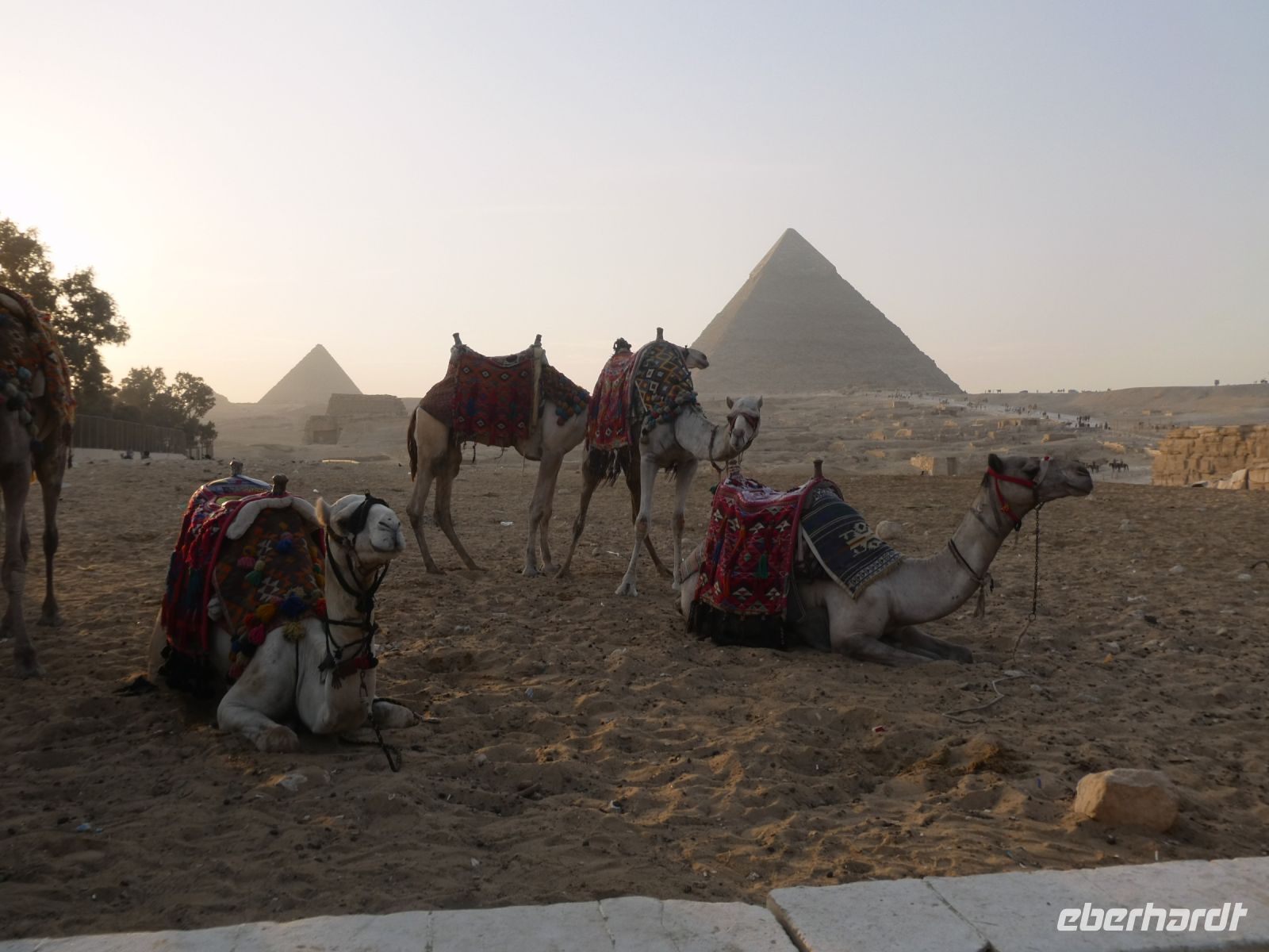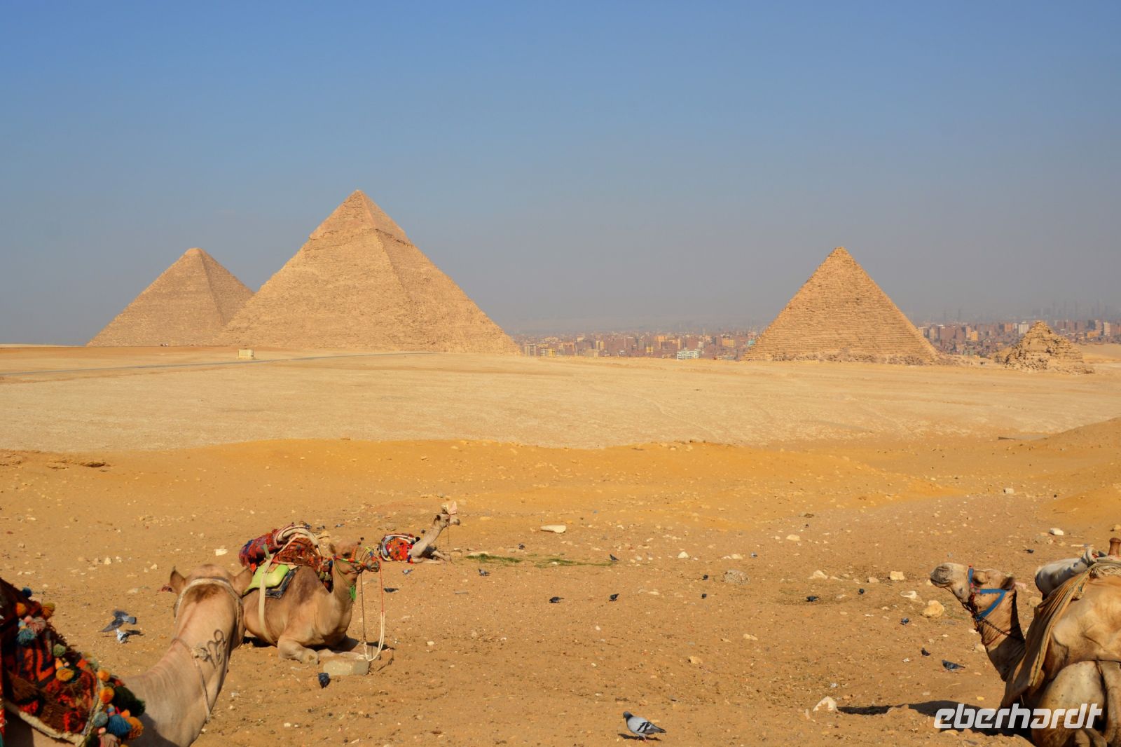 Wir anderen laufen um diese mit ehemals 147 m höchste der 3 Pyramiden. Heute ist sie durch Erosion ein paar Meter niedriger. Es gibt im Zusammenhang viele Geschichten über diese Bauwerke, einige davon sind wahr, andere der Phantasie des Menschen entsprungen. Alle Pyramiden dürfen selbstverständlich heutzutage nicht mehr beklettert werden. Auch von Unten betrachtet hat man einen unvergesslichen Eindruck. Die Pyramide des Chefren ist fast so groß wie die Pyramide seines Vaters. Hier gibt es an der Spitze noch einen Rest der Kalksteinverkleidung zu sehen. Anschließend fahren wir zu einem Aussichtspunkt. Dromedare und ihre Besitzer sind auf der Suche nach Kunden. Auf alle Fälle sehen die Tiere vor den Pyramiden malerisch aus. Uns zu Füßen liegt die ca. 20 Millionen Einwohner zählende Stadt Kairo. In der Ferne sehen wir das neu erbaute Ägyptische Museum und Essam erzählt, dass auch ein Einkaufszentrum erbaut wird. Nun wir fragen uns, ob das sein muss.