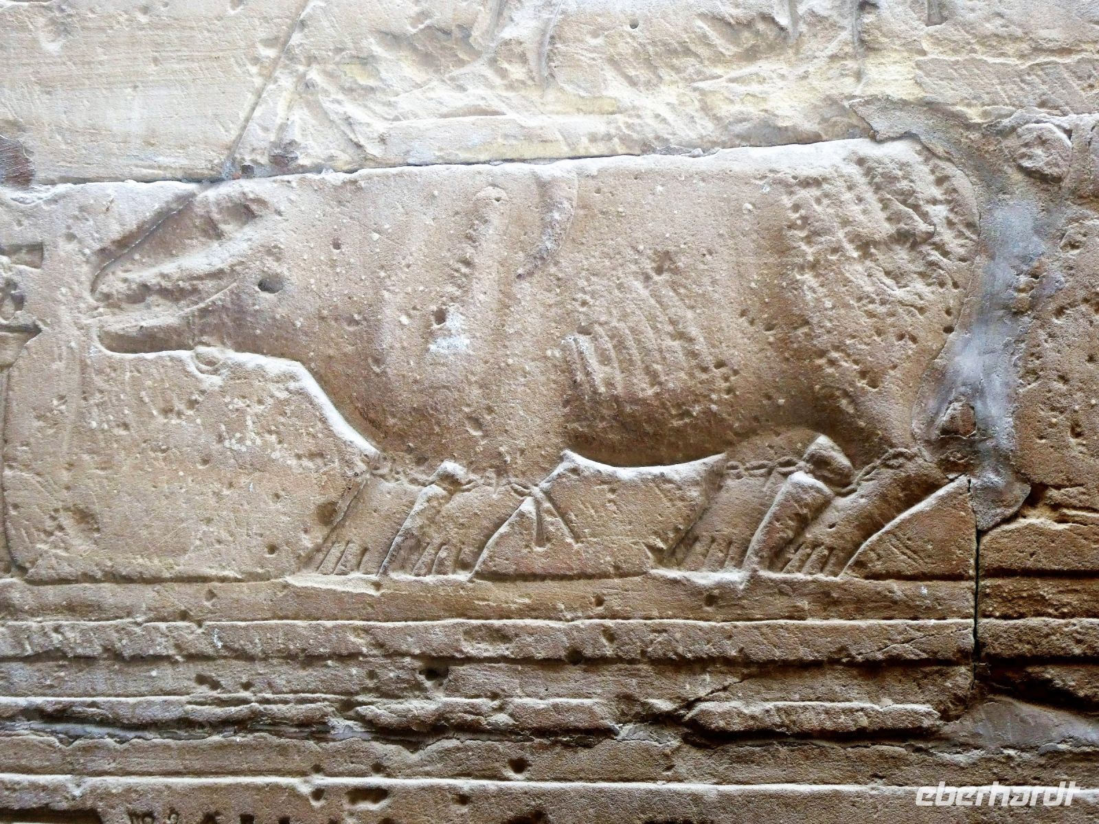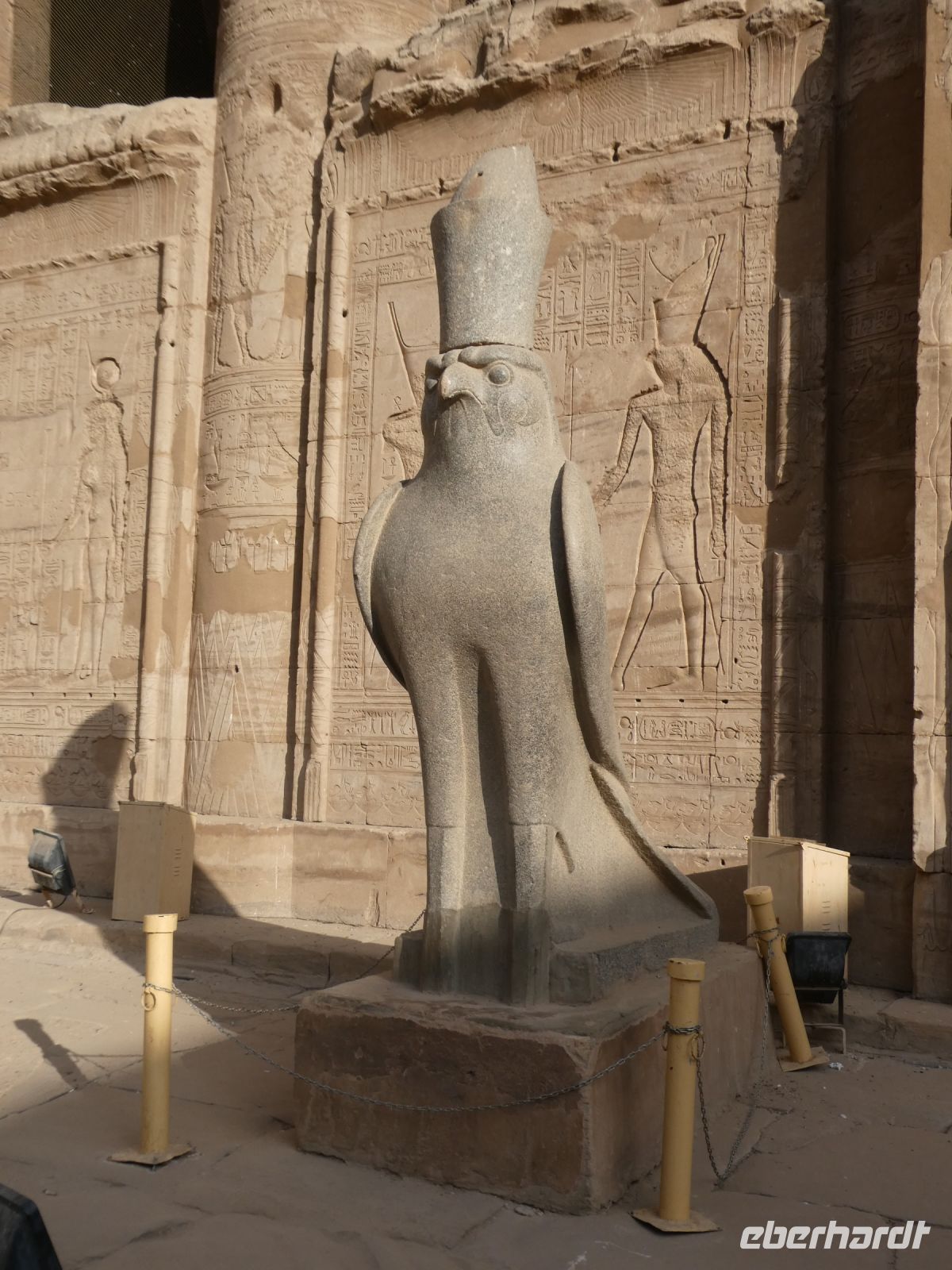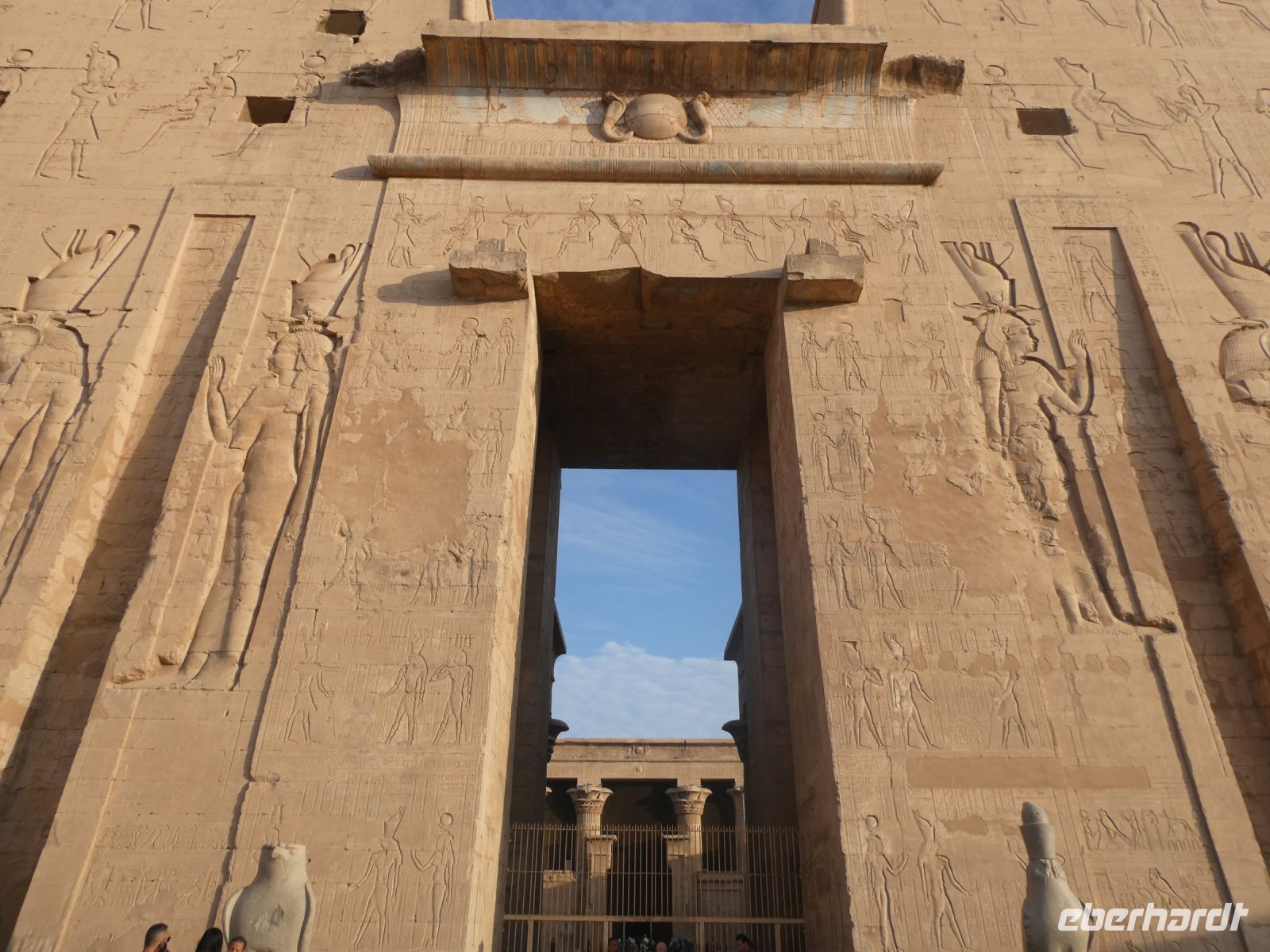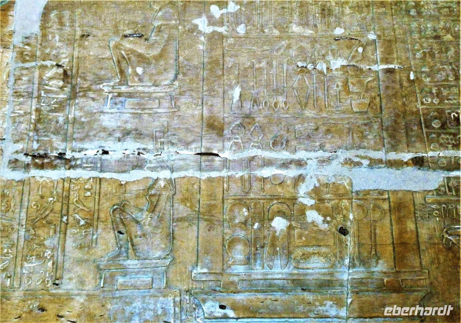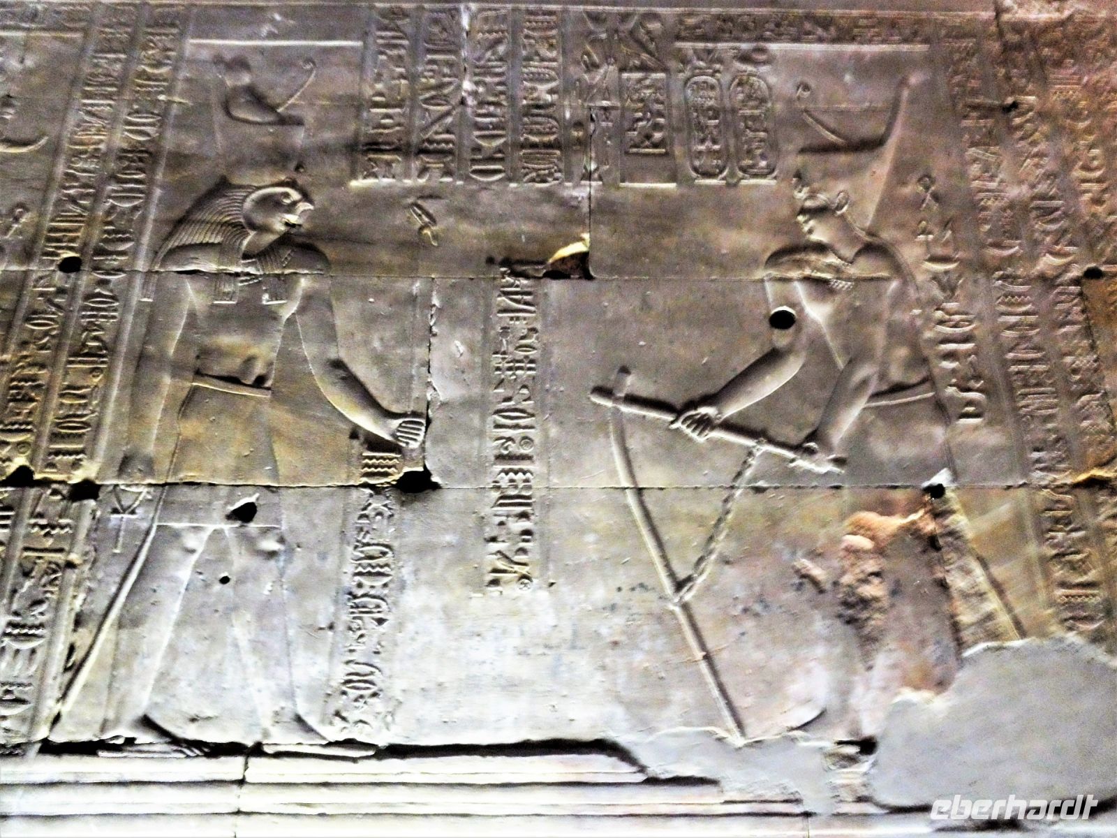 Der Tempel und seine Reliefbilder sind gut erhalten. Wir bewundern die eingravierten Bildnisse und auch den Zugang zum Nilbrunnen aus dem das reine Wasser geschöpft wurde. Man brauchte es für die Priester und auch für die Herstellung der kultischen Salben und Parfums. Die heilige Statue wurde täglich gesalbt. Im Kultbildraum steht der Sockel der früher als Barkensockel diente. Die westliche Umfassungsmauer enthält den Horus-Mythos. Der Horus kämpft gegen den Gott Seth der als Nilpferd dargestellt wurde, besonders noch klar ist das gefesselte Nilpferd zu sehen. Das Ritual endete wohl mit dessen Tötung, denn Seth war ein Feind der Sonne. Gut und Bös - ein immerwährender Kampf. Wir sind mal wieder wie so oft schon beeindruckt.