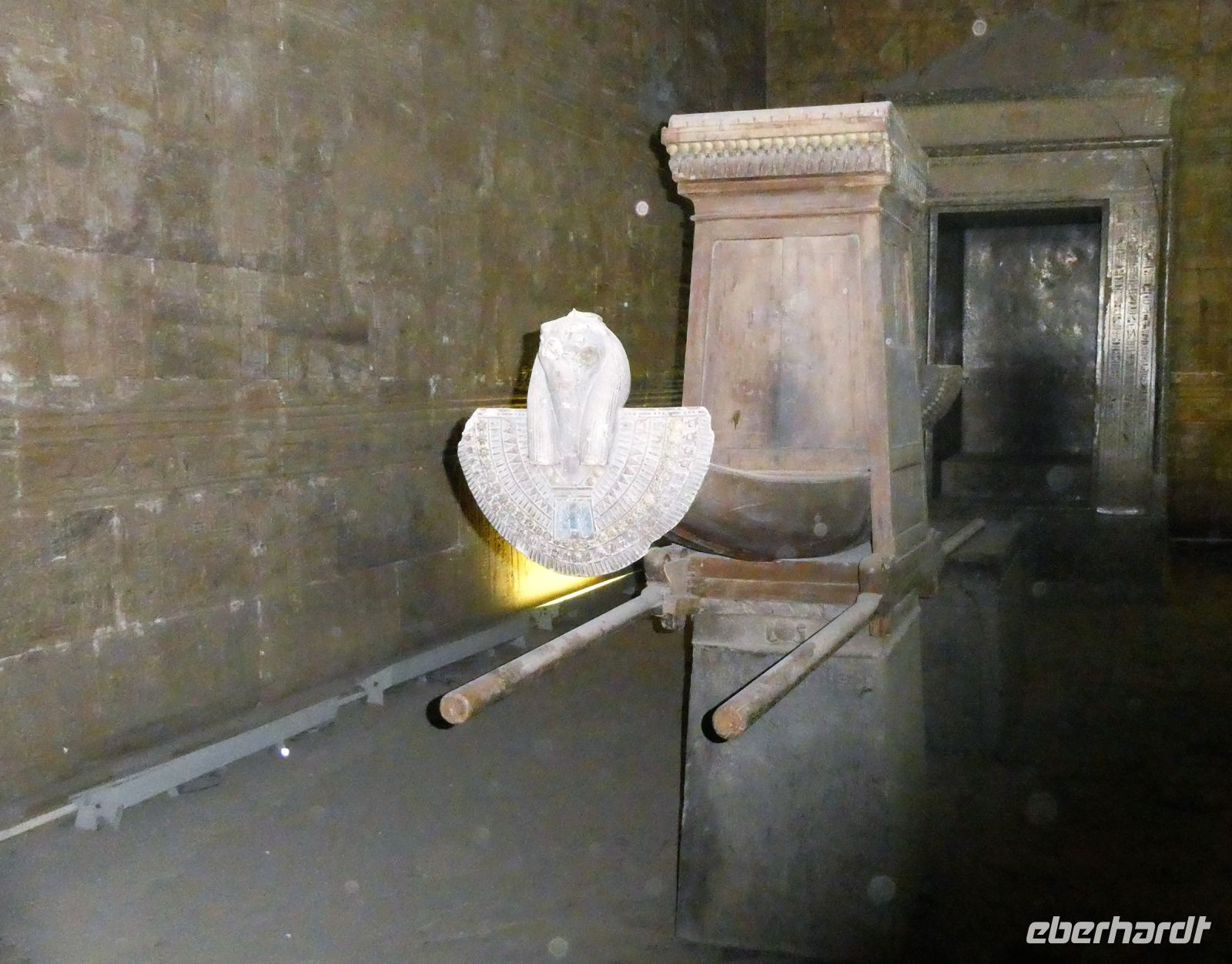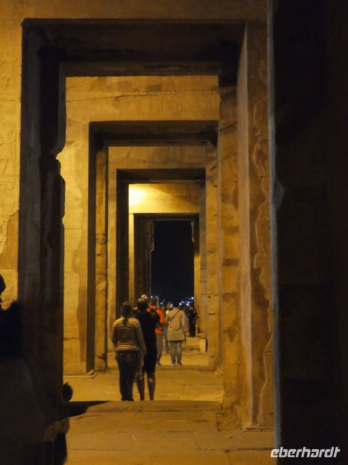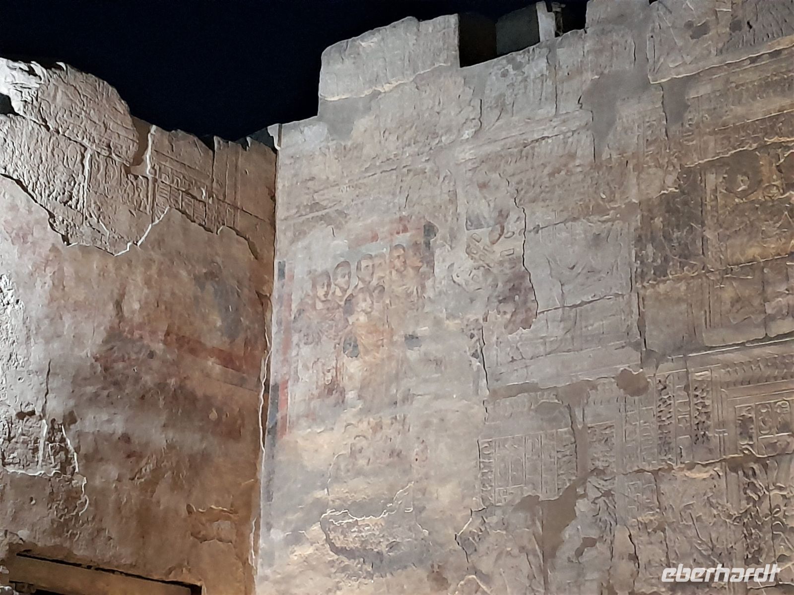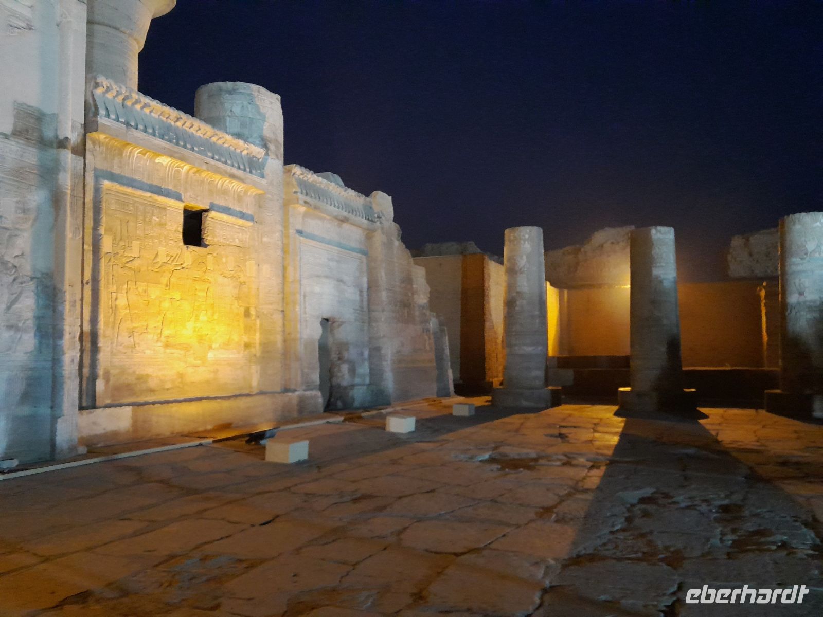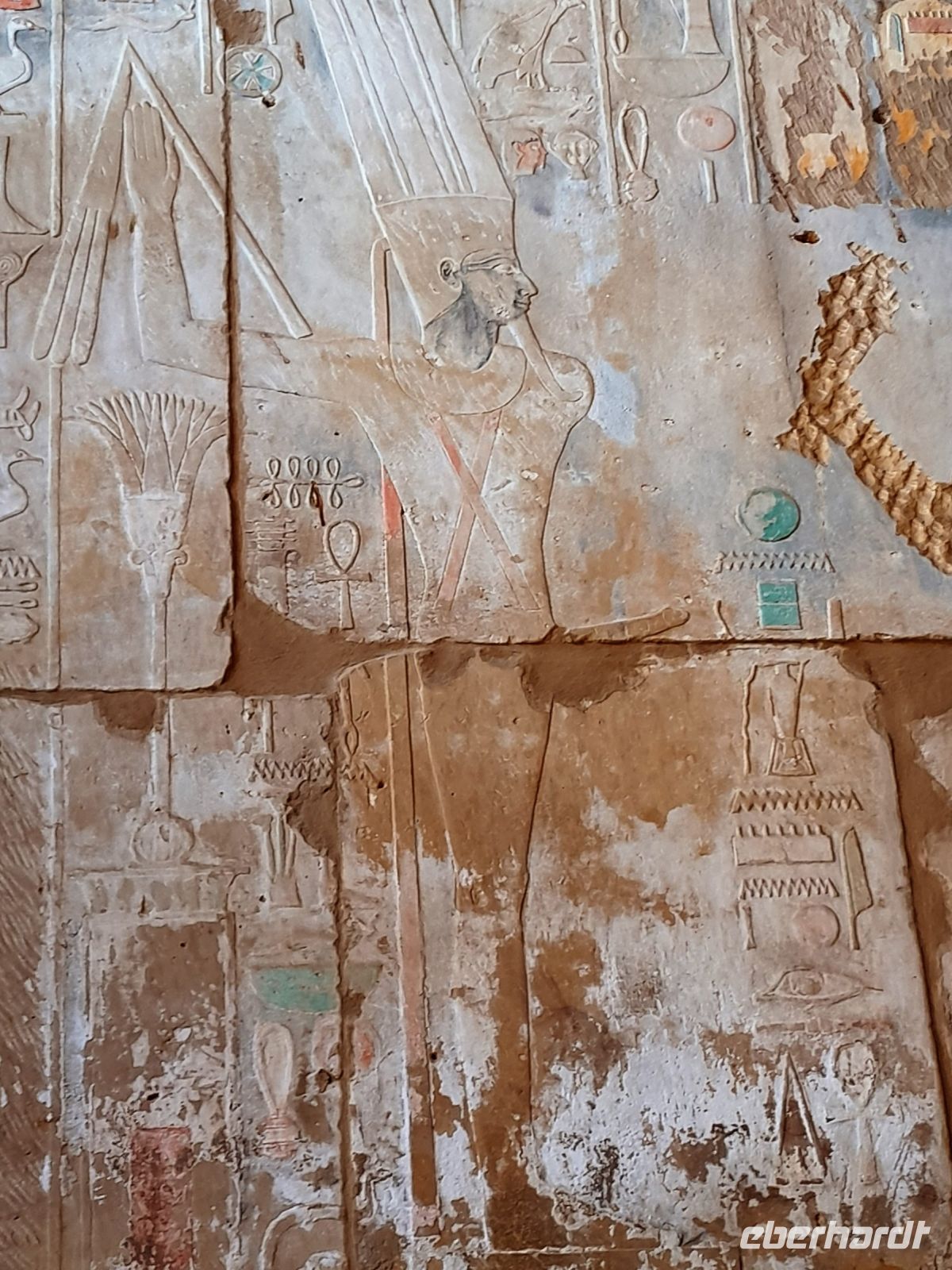 Der Tempel und seine Reliefbilder sind gut erhalten. Wir bewundern die eingravierten Bildnisse und auch den Zugang zum Nilbrunnen aus dem das reine Wasser geschöpft wurde. Man brauchte es für die Priester und auch für die Herstellung der kultischen Salben und Parfums. Die heilige Statue wurde täglich gesalbt. Im Kultbildraum steht der Sockel der früher als Barkensockel diente. Die westliche Umfassungsmauer enthält den Horus-Mythos. Der Horus kämpft gegen den Gott Seth der als Nilpferd dargestellt wurde, besonders noch klar ist das gefesselte Nilpferd zu sehen. Das Ritual endete wohl mit dessen Tötung, denn Seth war ein Feind der Sonne. Gut und Bös - ein immerwährender Kampf. Wir sind mal wieder wie so oft schon beeindruckt.