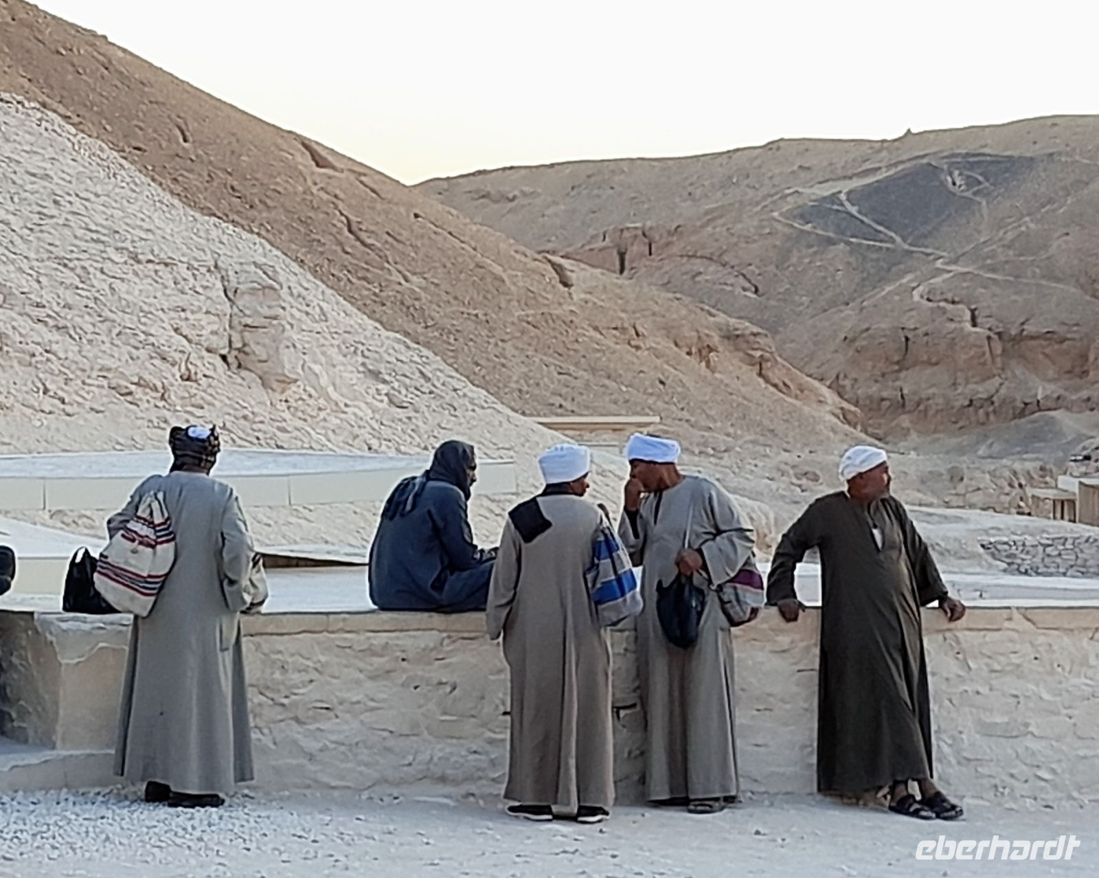 Mit allen Gewerken drumherum ist der Tourismus der größte Arbeitgeber in Ägypten. Welches Pech für alle, wenn etwas in Ägypten geschieht, was die Touristen abhält herzukommen. Wir bewundern die schönen Souvenirs, aber alles können wir nicht kaufen. Aber dem einen oder anderen sticht doch etwas ins Auge und schon ist der Kauf perfekt. Und wenn nicht? In-shallah morgen kommen andere und vielleicht gefällt denen etwas. Wir aber vom Tee gestärkt und ein wenig ausgeruht machen uns auf den Weg zu einem der wohl ästhetischsten Tempel Ägyptens, dem Tempel der Hatschepsut. Nichts kündet mehr von dem Attentat im Jahr 1997. Auch hier gibt es starke Sicherheitskontrollen. Ein kleines Bähnchen fährt uns vor den Tempel. Wir bekommen von Essam alle wichtigen Informationen.