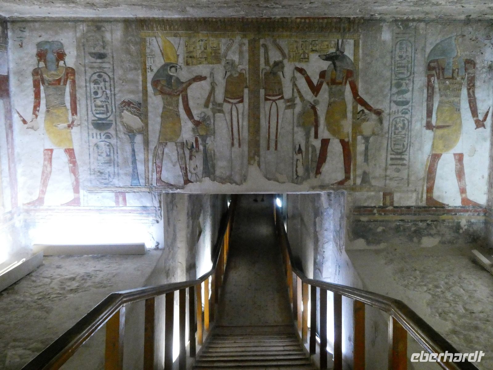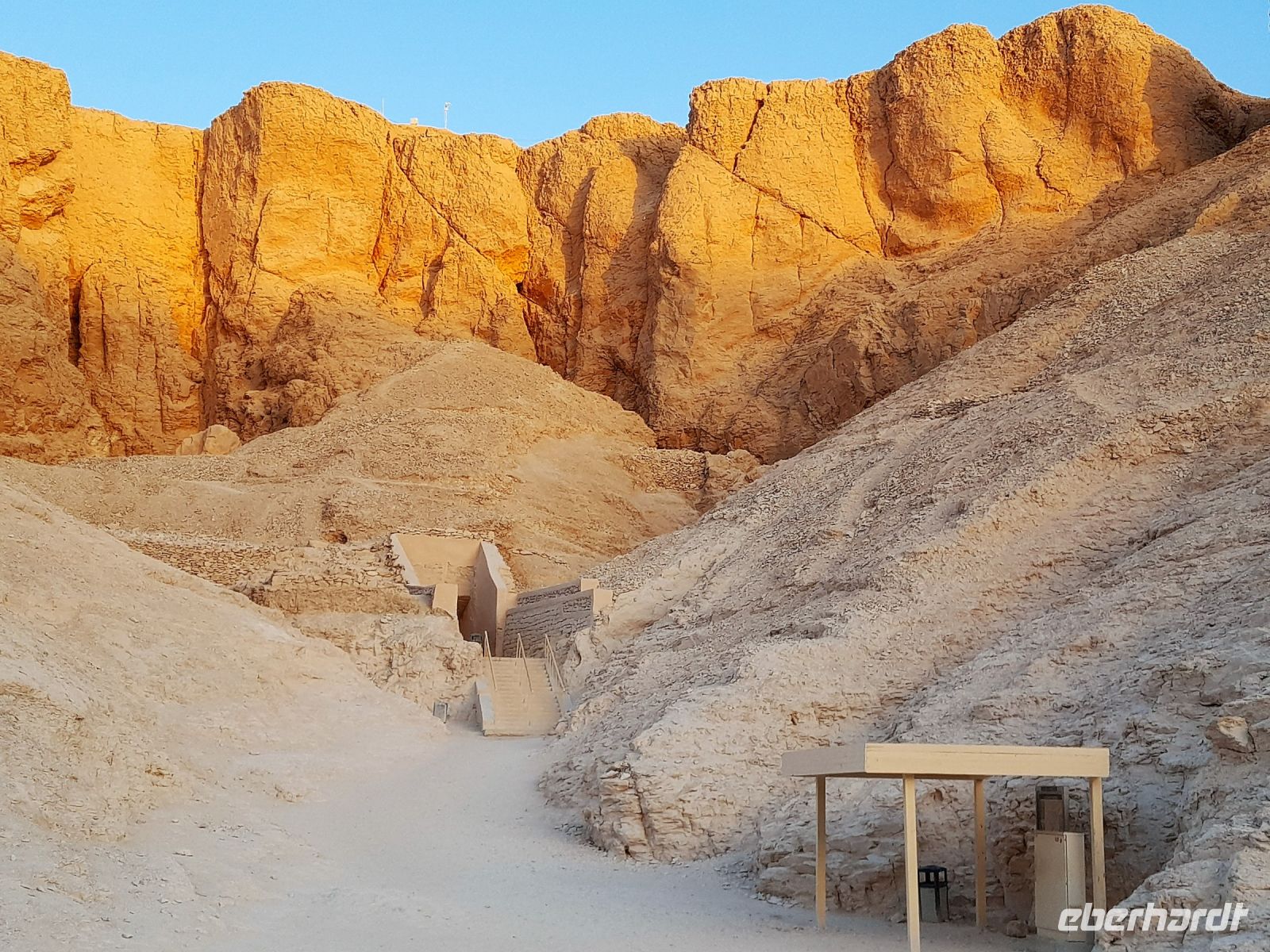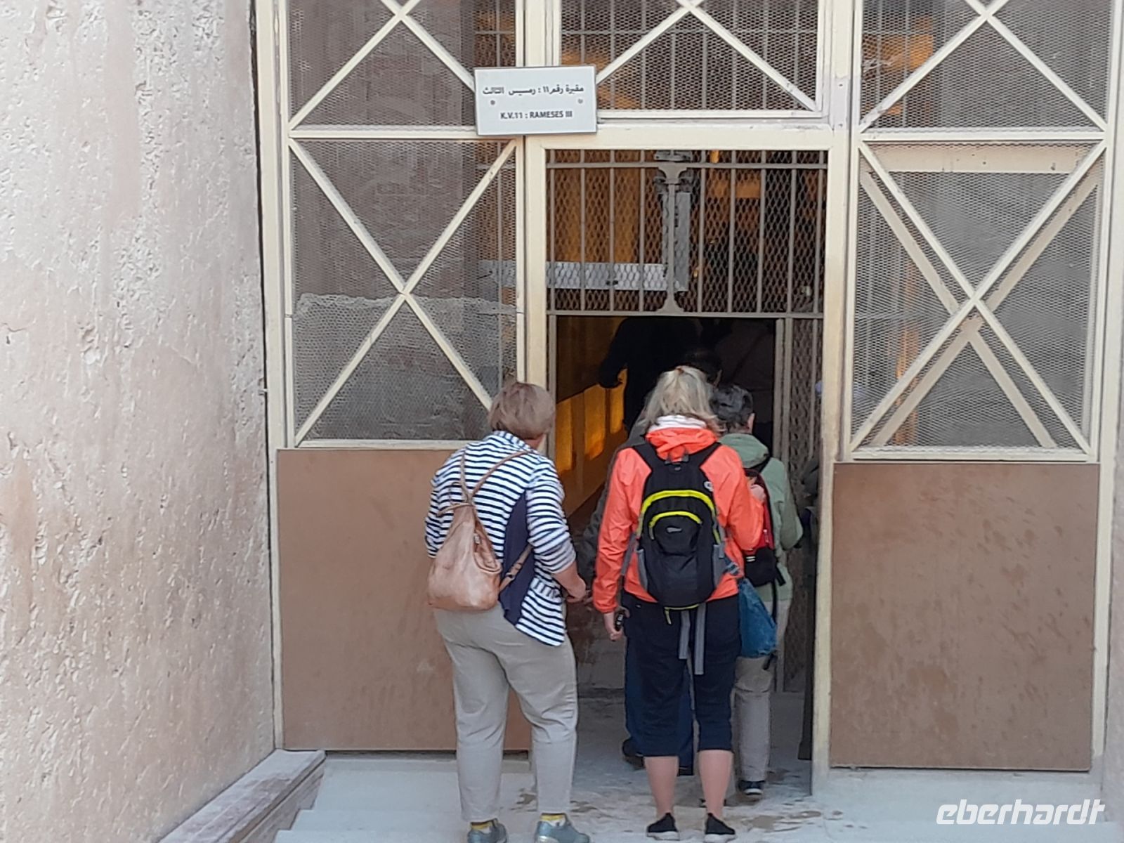 Heute wird wieder ein spannender Tag, denn wir fahren in das Tal der Könige. Das bekannteste der Gräber ist natürlich das Grab von Tut-ench-Amun, dieses Pharaos der jung starb aber der Nachwelt ein unvergleichliches Erbe hinterließ. Alle anderen der 66 Gräber dieser Nekropole wurden von Grabräubern im Laufe der Jahrtausende und Jahrhunderte ausgeraubt. Trotzdem kann man in einigen der Gräber noch gut erhaltene Wandmalereien betrachten. Wir besuchen hier sehr zeitig am Morgen in diesem Wüstental 3 Gräber, u.a. das Grab von Ramses III. Wir steigen hinab in die Unterwelt und sehen gut erhaltene Malereien und Reliefs, die vom trockenen Wüstenklima gut konserviert wurden. Sie wurden in Stein gemeißelt und erhalten für die Nachwelt, für uns, die wir dieses tausende von Jahren danach bewundern dürfen. Welch Möglichkeit und Glück.