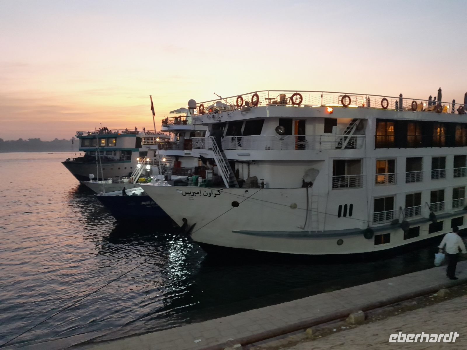 Also fahren wir nach der Besichtigung zu unserem Schiff der "MS Crowne Empress", wo wir schon erwartet werden. Wir bekommen schnell unsere Kabinemit denen alle zufrieden sind und können bald die erste "Schiffsmahlzeit" zu uns nehmen. Zwei Tische sind für uns reserviert. Die Speisen sind auf einem appetitlichen Buffet angerichtet und es finden sich sowohl ägyptische als auch europäische Gerichte. Wir lassen es uns schmecken.