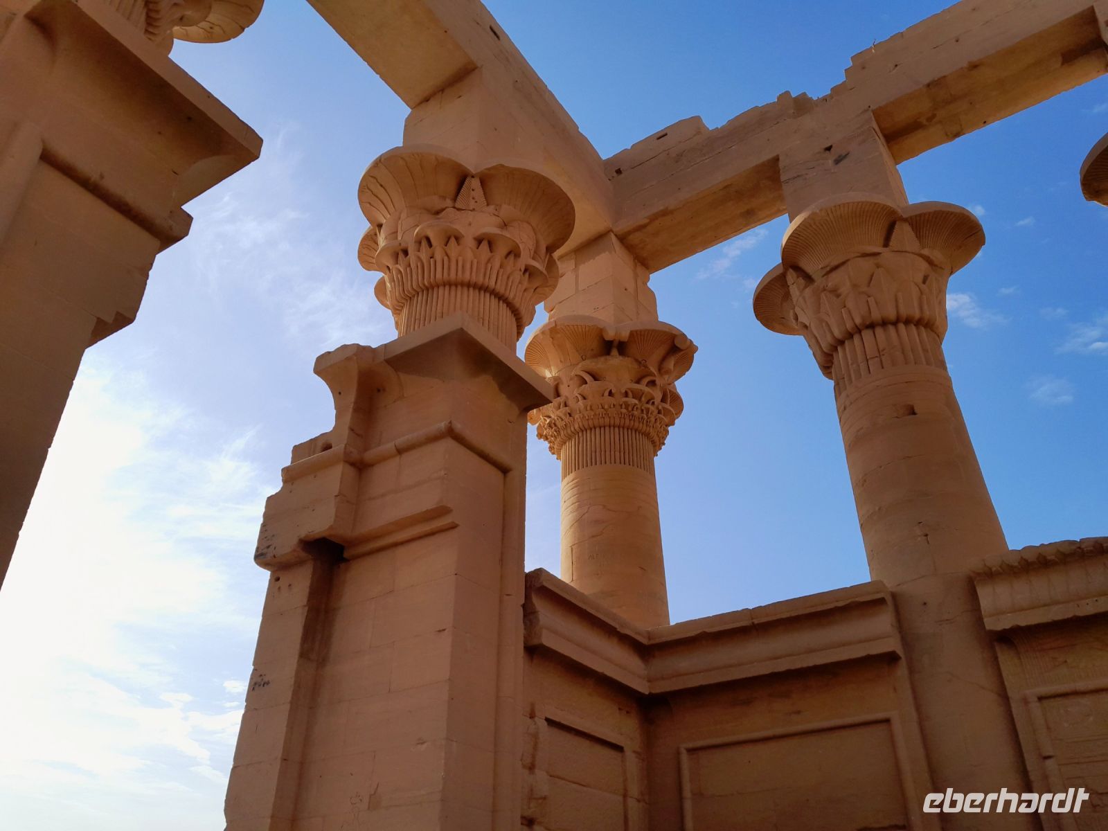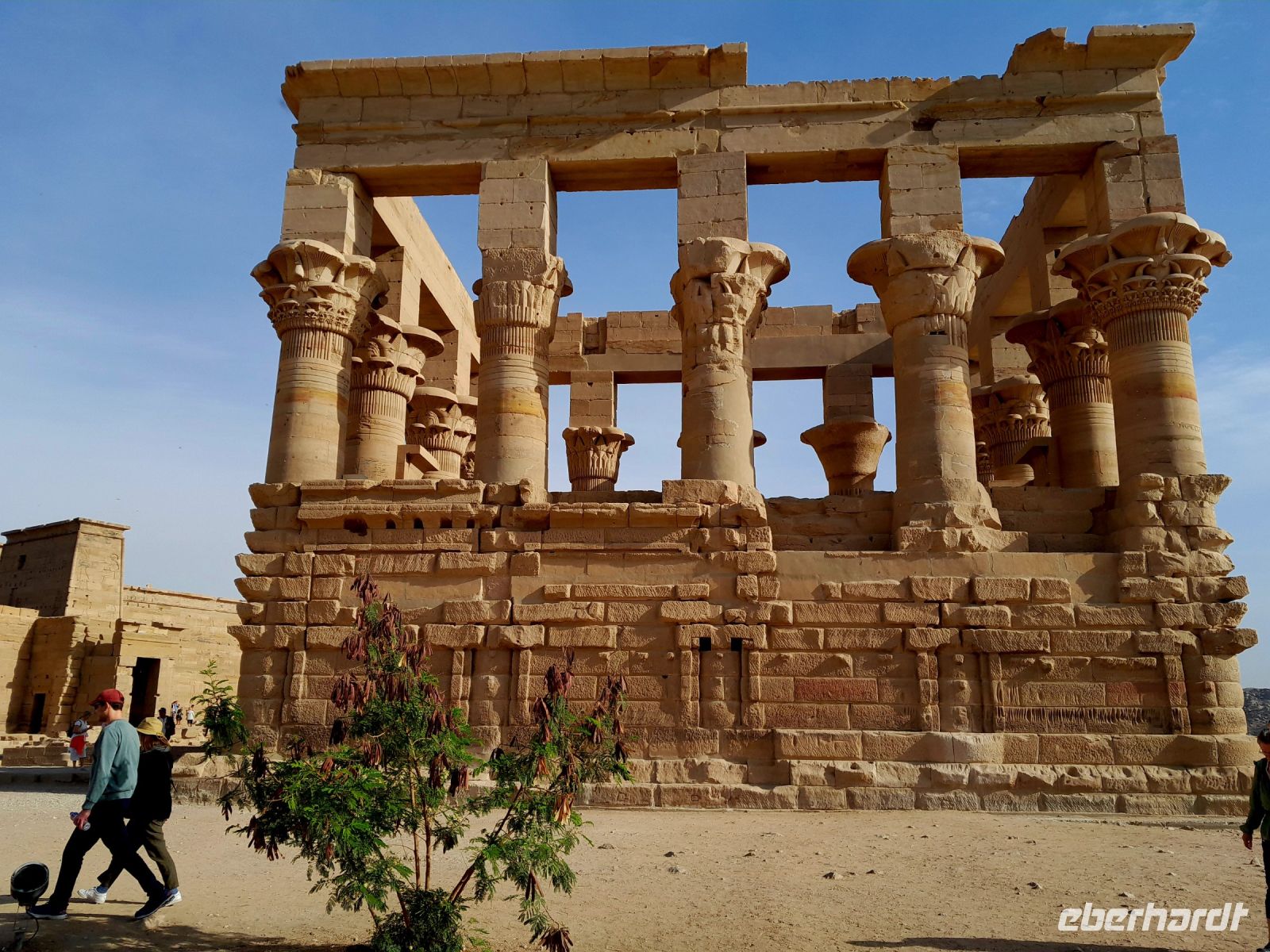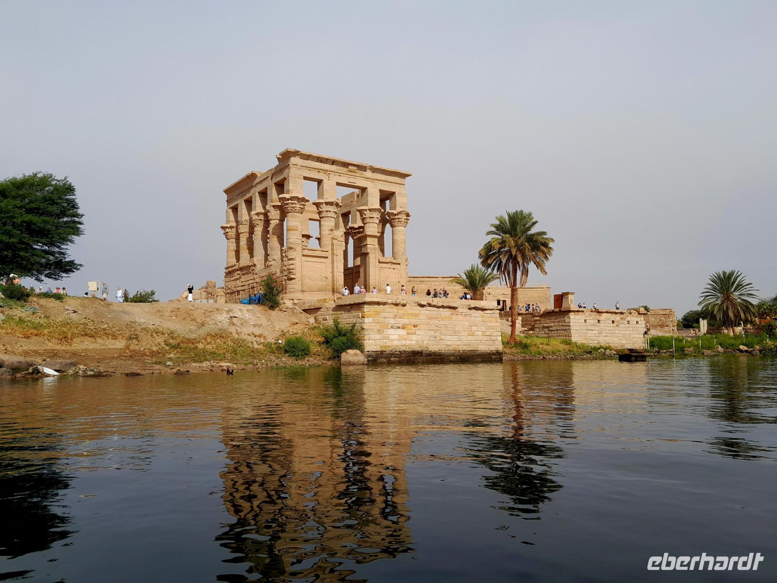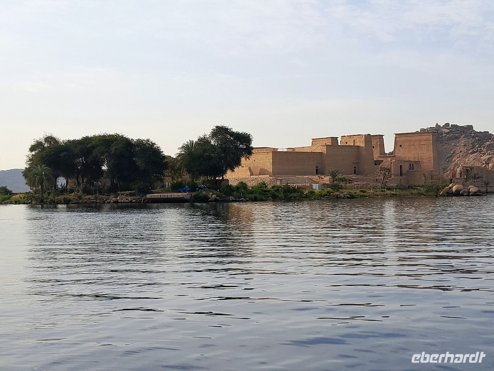 Wir fahren mal wieder früh los um heute erst einmal einen weiteren interessanten Tempel zu besichtigen. Den Tempel von Philae. Von einer Bootsanlegestelle die wir nach einer 20minütigen Busfahrt erreichen werden wir zur Insel Philae gebracht, dorthin wo der Isis-Tempel als Botschafter der Spätzeit und der Ptolemäer-Zeit steht. Im Morgenlicht leuchtet er uns schon von Weitem entgegen. Hier wurde die Göttin Isis verehrt. Diesen Tempel musste man genau wie Abu Simbel wegen des Baus des Staudamms vor den steigenden Wassern retten und hat ihn auf diese Insel verlagert.
