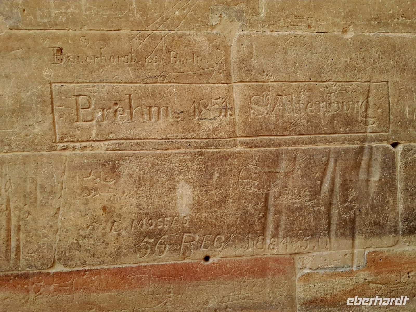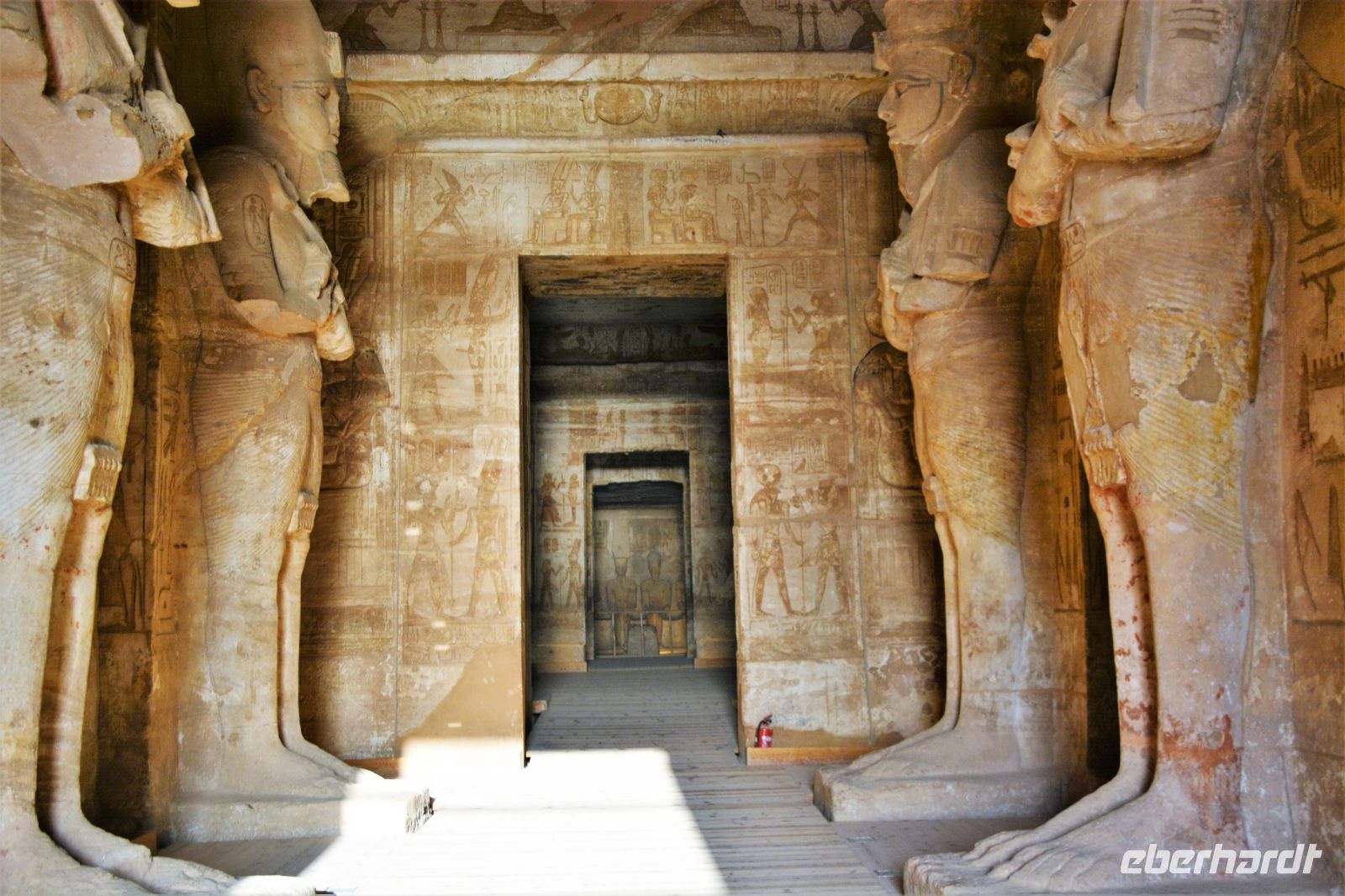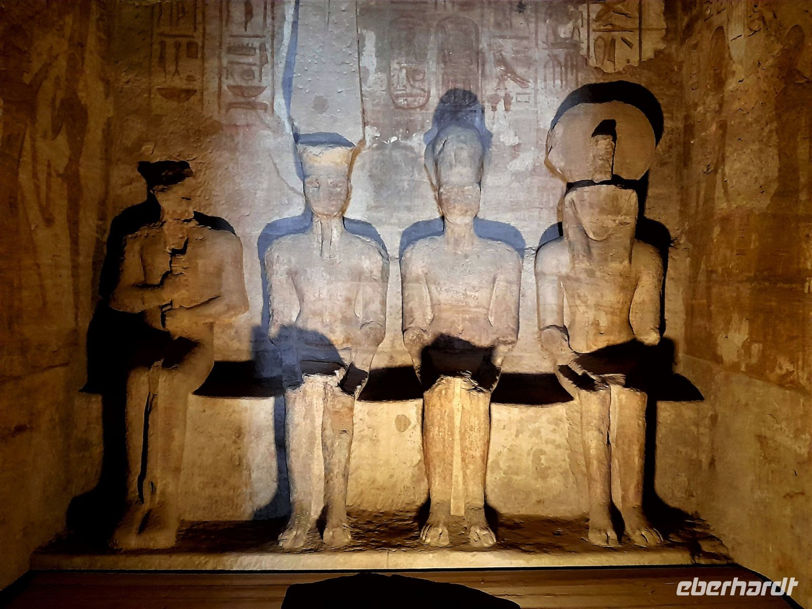 Dann stehen wir vor den Gräbern. Beeindruckend sind diese Bauwerke. Erhaben blicken die Figuren von Ramses auf uns herab. Im Allerheiligsten stehen 4 Figurinen. Die linke stellt den Erdgott Ptah dar. Hier findet zwei Mal im Jahr das Sonnenwunder statt, der Erdgott oder Gott der Unterwelt bleibt im Dunklen. Allerdings entgegen des ursprünglichen Tempels nach dem Wiederaufbau um einen Tag versetzt. Auch das musste man damals bei der Verlegung dieses monumentalen Bauwerks beachten, was eine erstaunliche Leistung darstellte.
