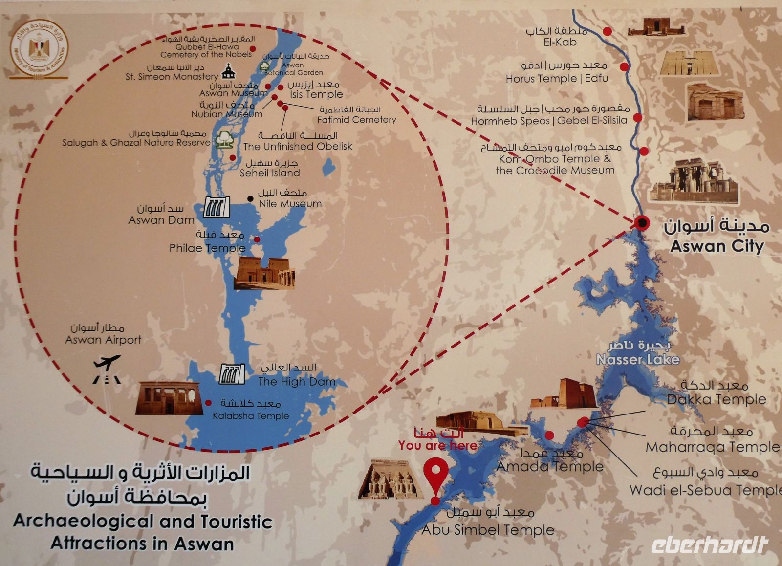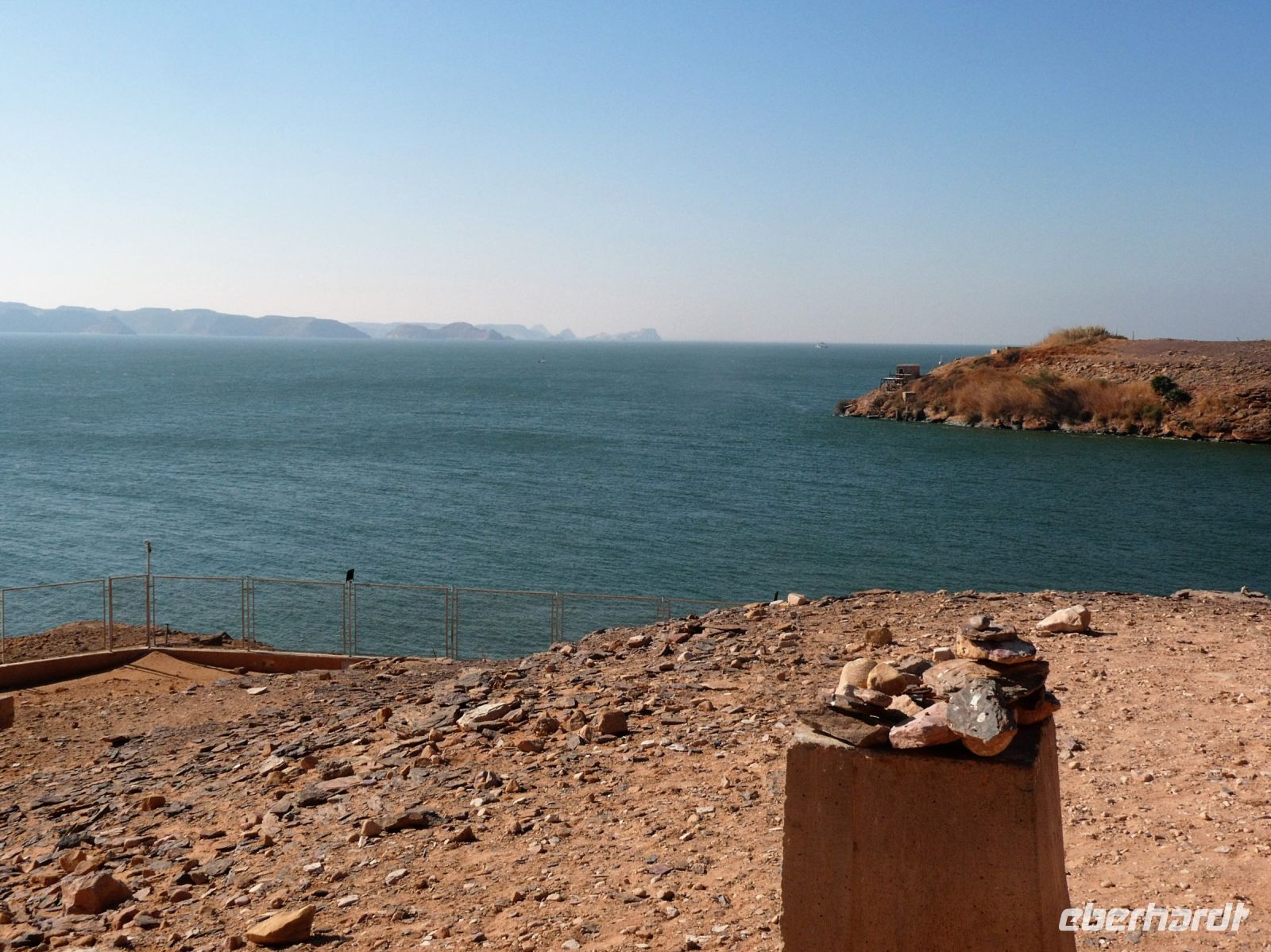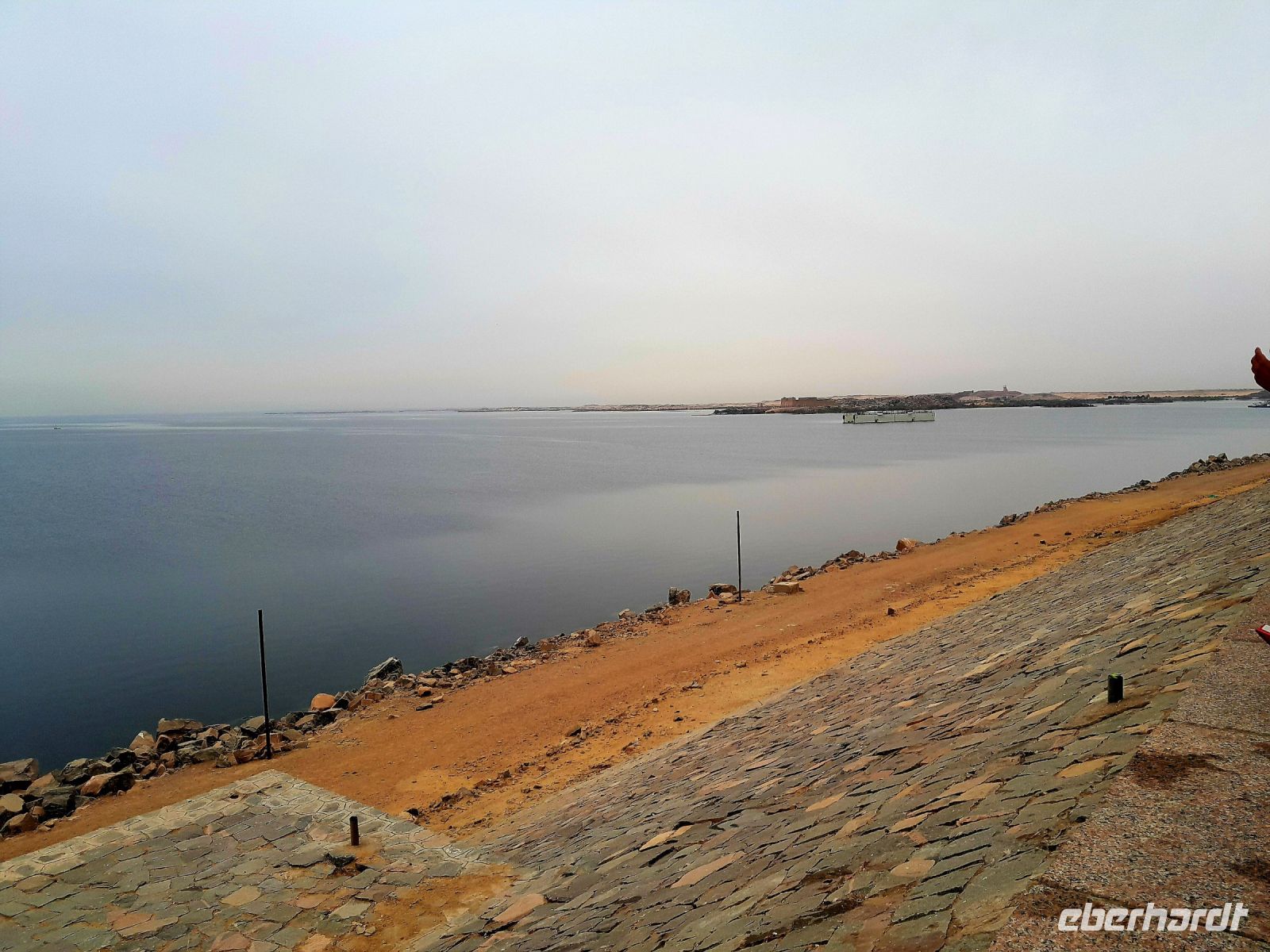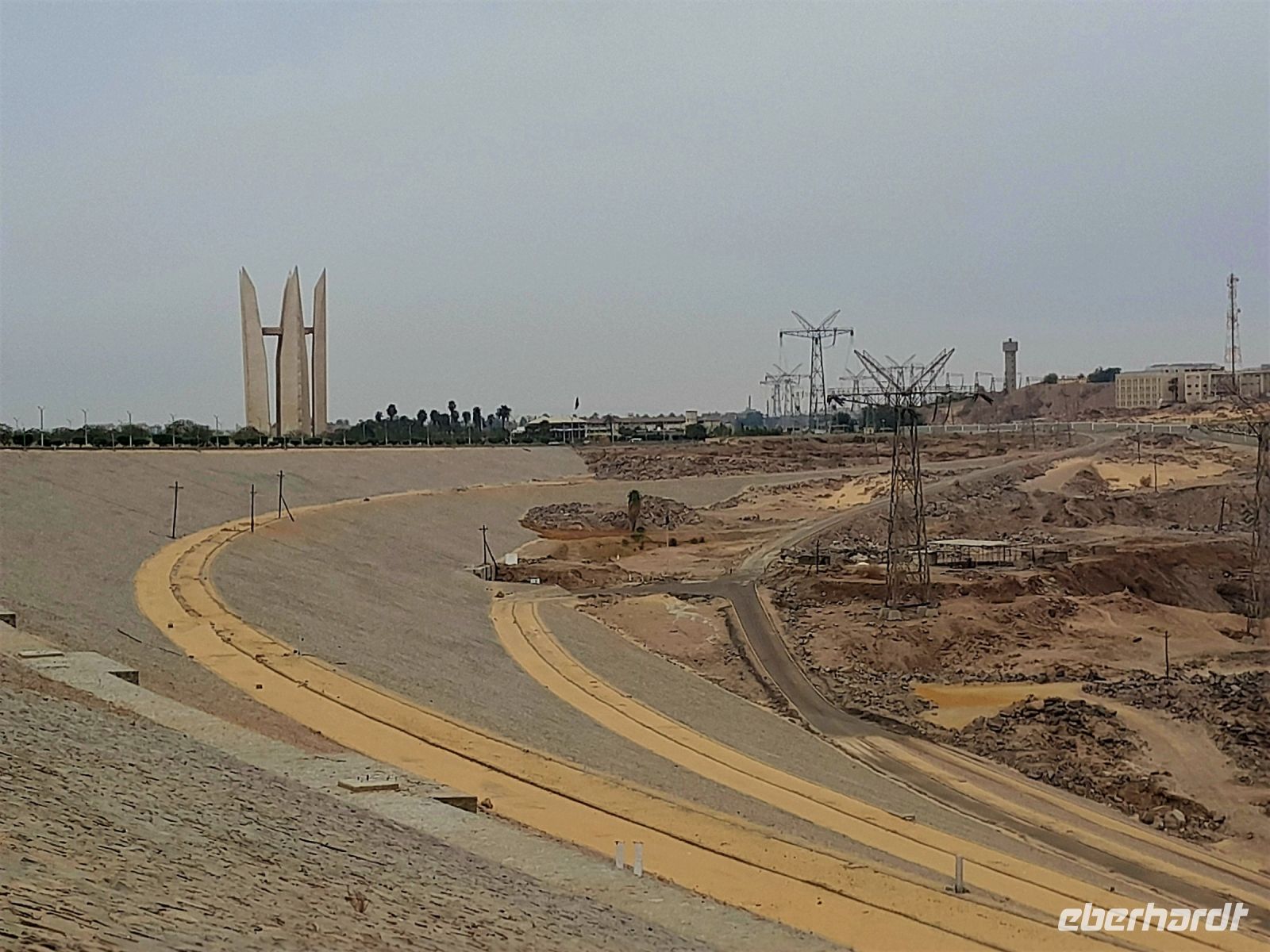Nach der Besichtigung fahren wir mit unserem Boot zurück und weiter zu einem der wichtigsten Bauwerke Ägyptens, dem neuen Hochdamm von Assuan. Wir müssen dazu noch ein wenig mit dem Bus fahren. 7 km südlich von Assuan befindet sich die alte Staumauer welche zwischen 1898 und 1902 errichtet wurde. Sie sollte das Wasser des Nils so regulieren, dass eine ganzjährige Bewässerung der Felder gewährleistet war. Diese alte Staumauer konnte noch über Durchlässe vom fruchtbaren Nilschlamm passiert werden. Nur leider erwies sich dieses Bauwerk als zu klein und konnte die Versorgung der Bevölkerung nicht gewährleisten. Ein neuer Damm, die sog. „Barriere gegen den Hunger“ musste her und nach zahlreichen Verhandlungen und der Klärung politischer Meinungsverschiedenheiten wurde der Damm mit Hilfe der Sowjetunion im Jahr 1970 fertiggestellt. Ein Jahr später war die Eröffnung. Der Nassersee ist volumenmäßig wohl der drittgrößte Stausee der Erde und ist in den letzten Jahren wieder von Nil-Krokodilen bewohnt.
