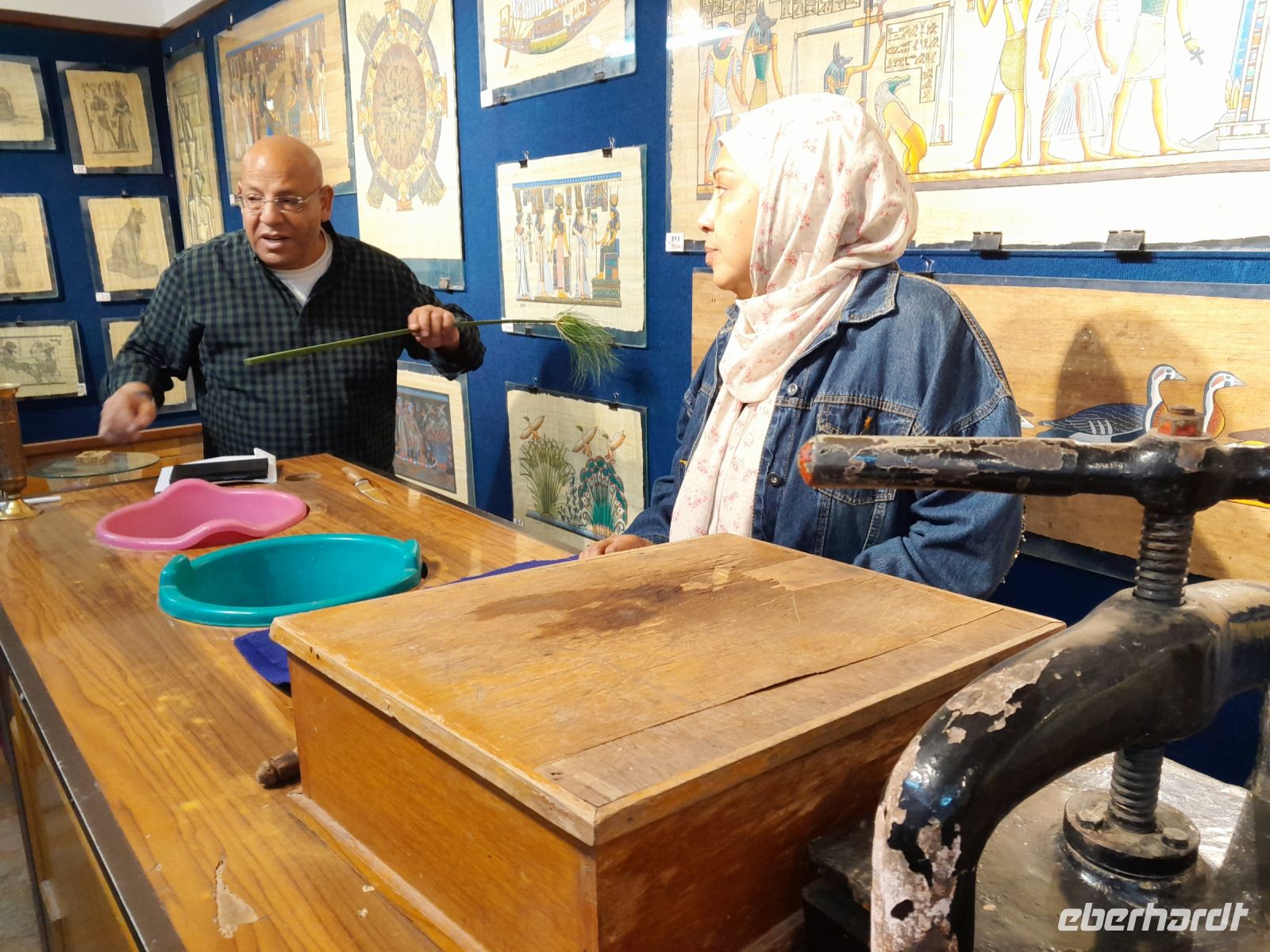 Nach dieser Besichtigung fahren wir zu einer Papyrusfabrik. Dort wird uns eine Papyrus-Pflanze gezeigt und wie aus dem Stängel seit Urzeiten Papyrus hergestellt wird. Auch bekommen wir die Verwendung erläutert. Bei dem Einweichen verändert sich ihre Farbe erst zu einem sehr hellen Gelb und weiterhin zu einem bräunlichen Ton. Dann schichtet man sie quadratisch aufeinandergeschichtet und sie verkleben bei der Trocknung. Das Ergebnis ist ein sehr haltbares Material das vielfältig verwendet werden kann. Künstler bemalen es kunstvoll mit verschiedenen ägyptischen Motiven, was eine schöne Erinnerung an Ägypten ist.