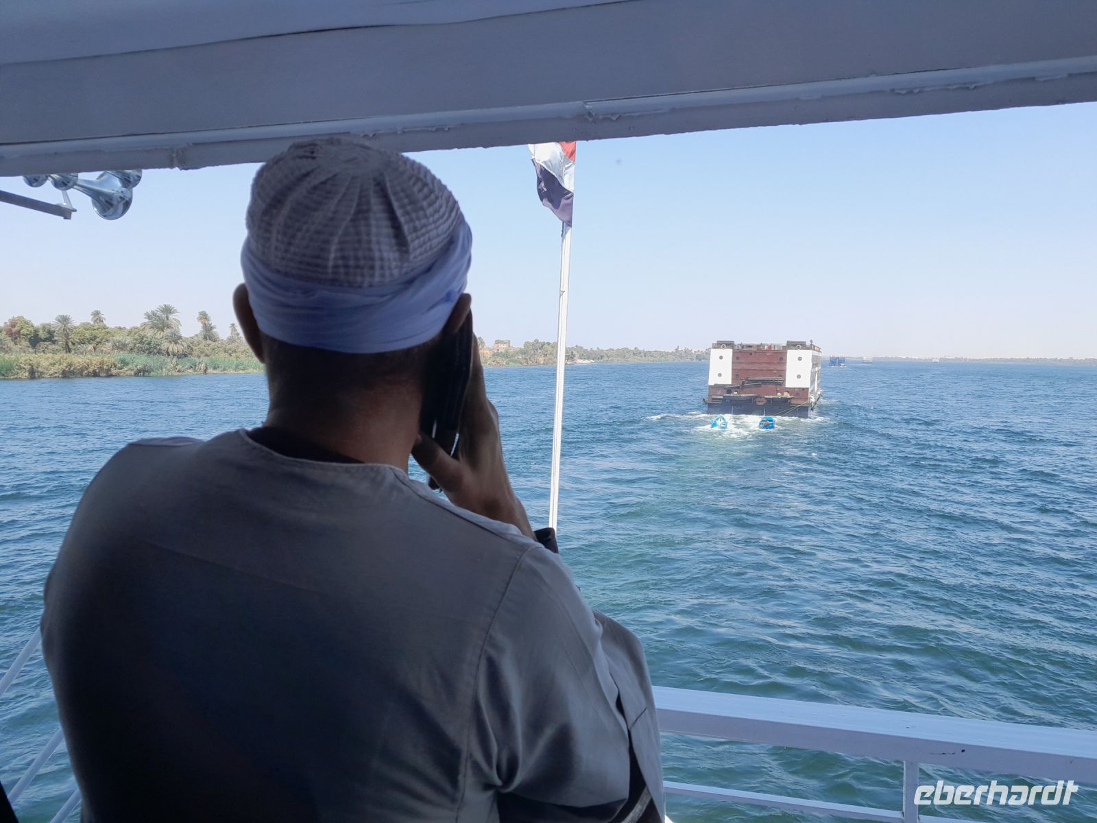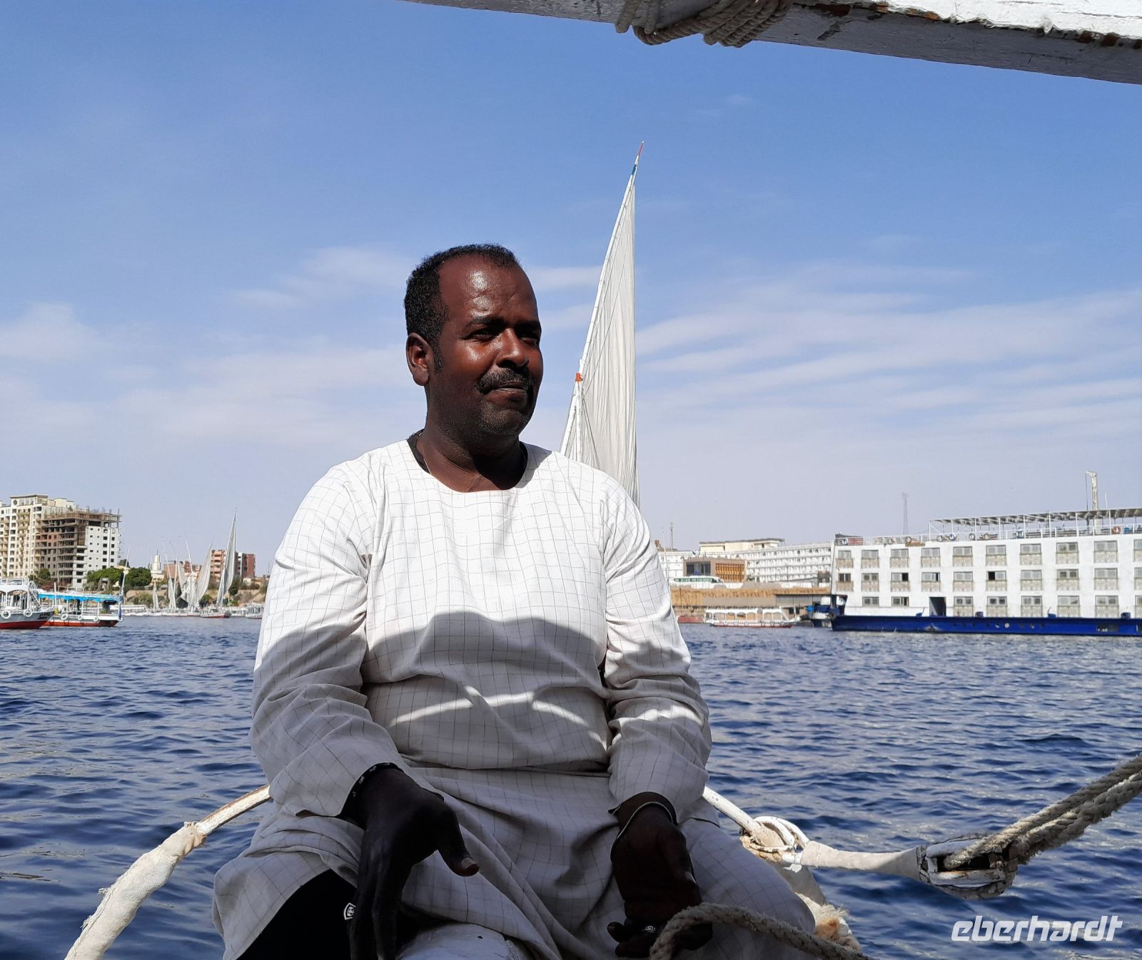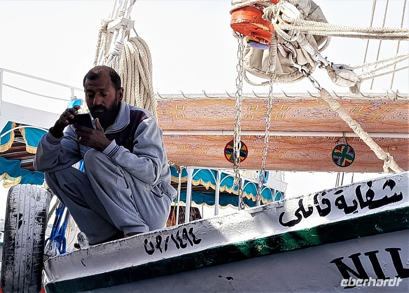 Gegenüber unserem Schiff sitzt ein Raiss, d.h. einer der Kapitäne der Nilschiffe, unverkennbar an der Kleidung und seiner Haltung. Wir bekommen auf Nachfrage ein Exklusivfoto von ihm. Diese Kapitäne kennen den Nil wie ihre Westentasche und wirken so gar nicht eingebildet.