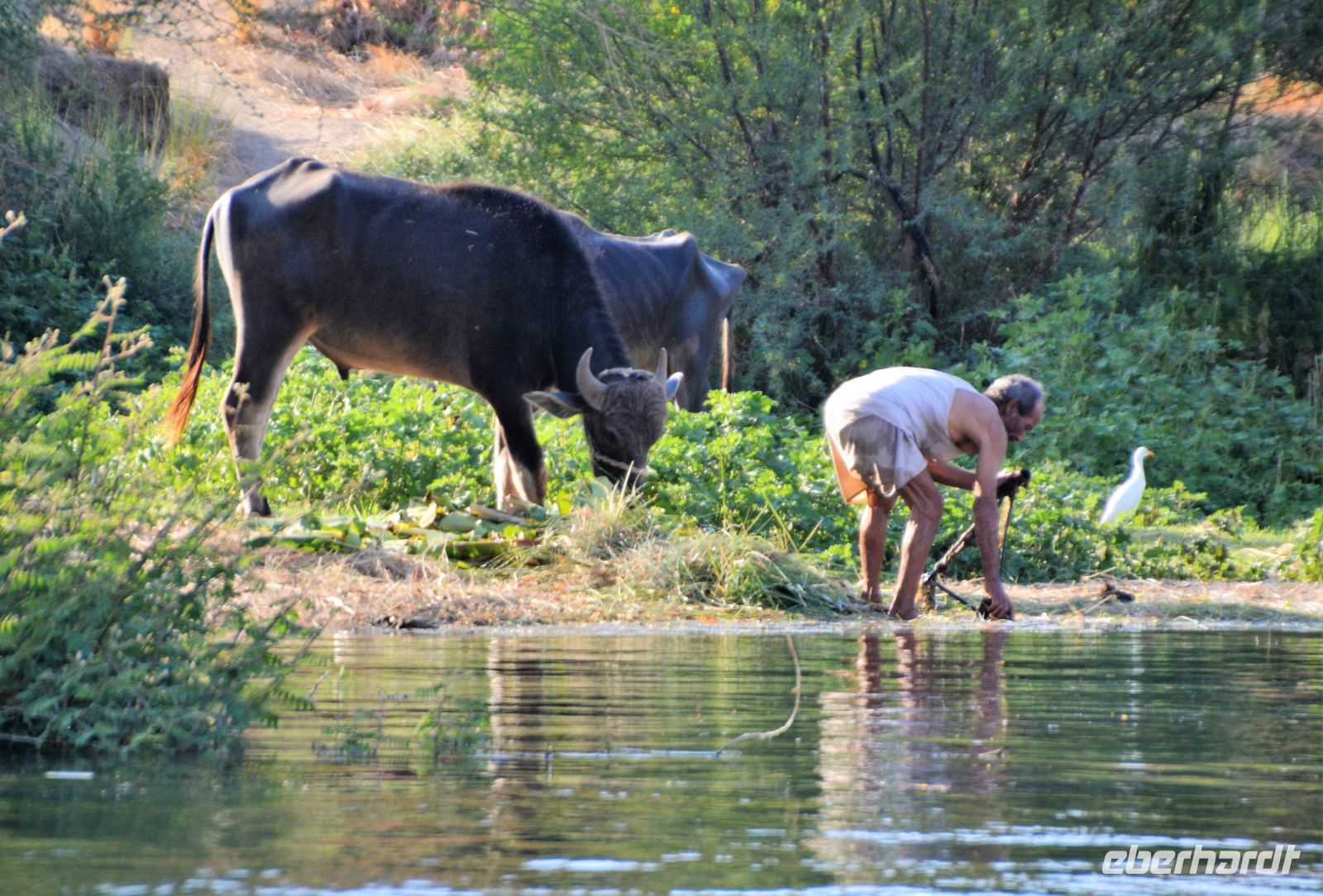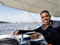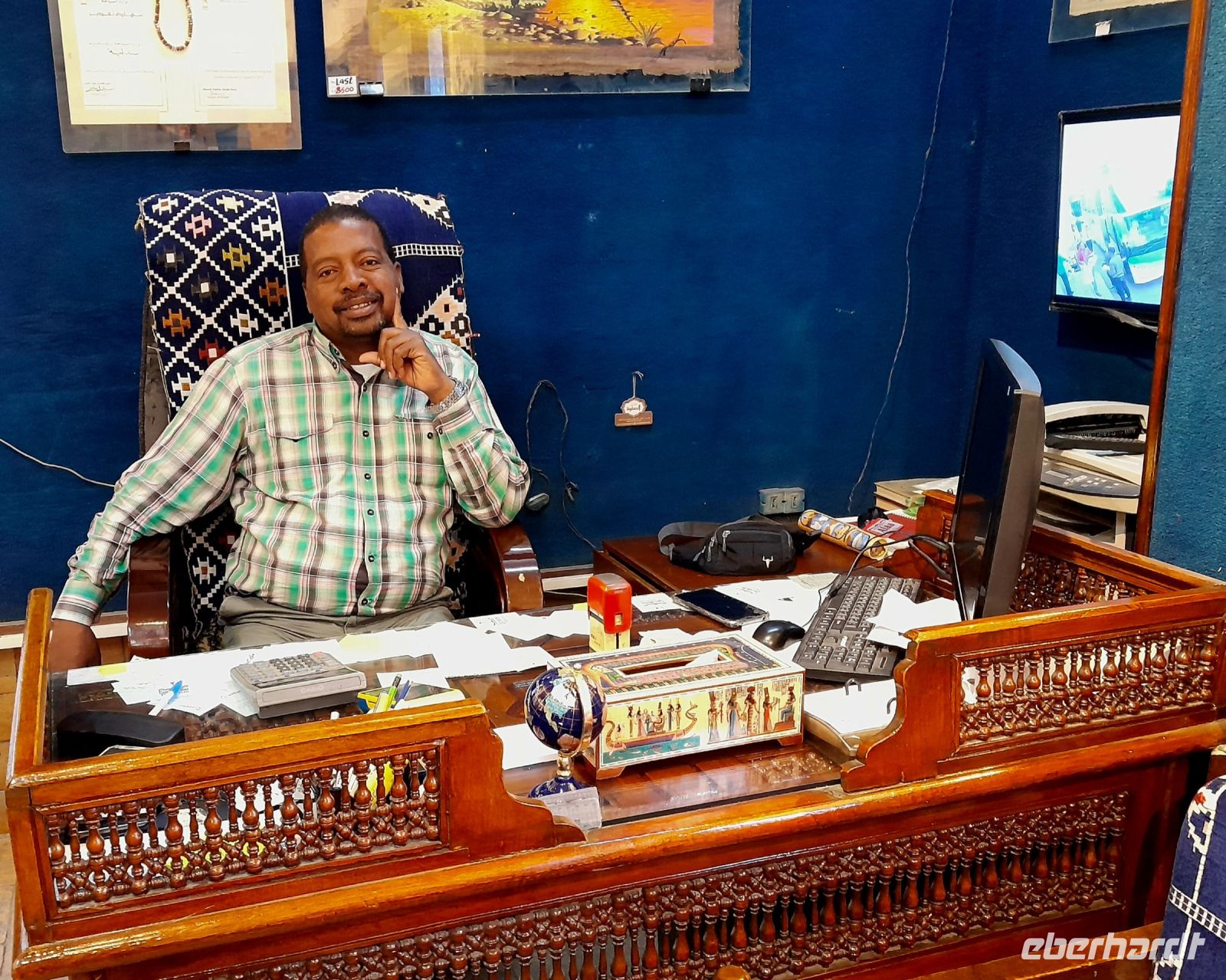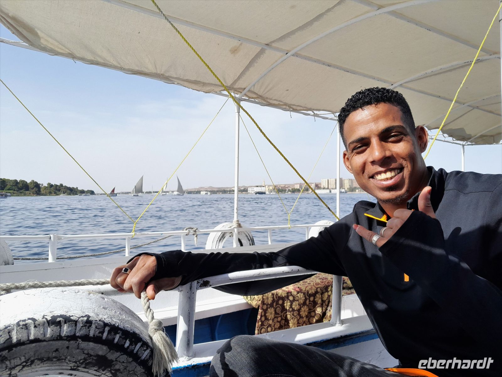 Gegenüber unserem Schiff sitzt ein Raiss, d.h. einer der Kapitäne der Nilschiffe, unverkennbar an der Kleidung und seiner Haltung. Wir bekommen auf Nachfrage ein Exklusivfoto von ihm. Diese Kapitäne kennen den Nil wie ihre Westentasche und wirken so gar nicht eingebildet.