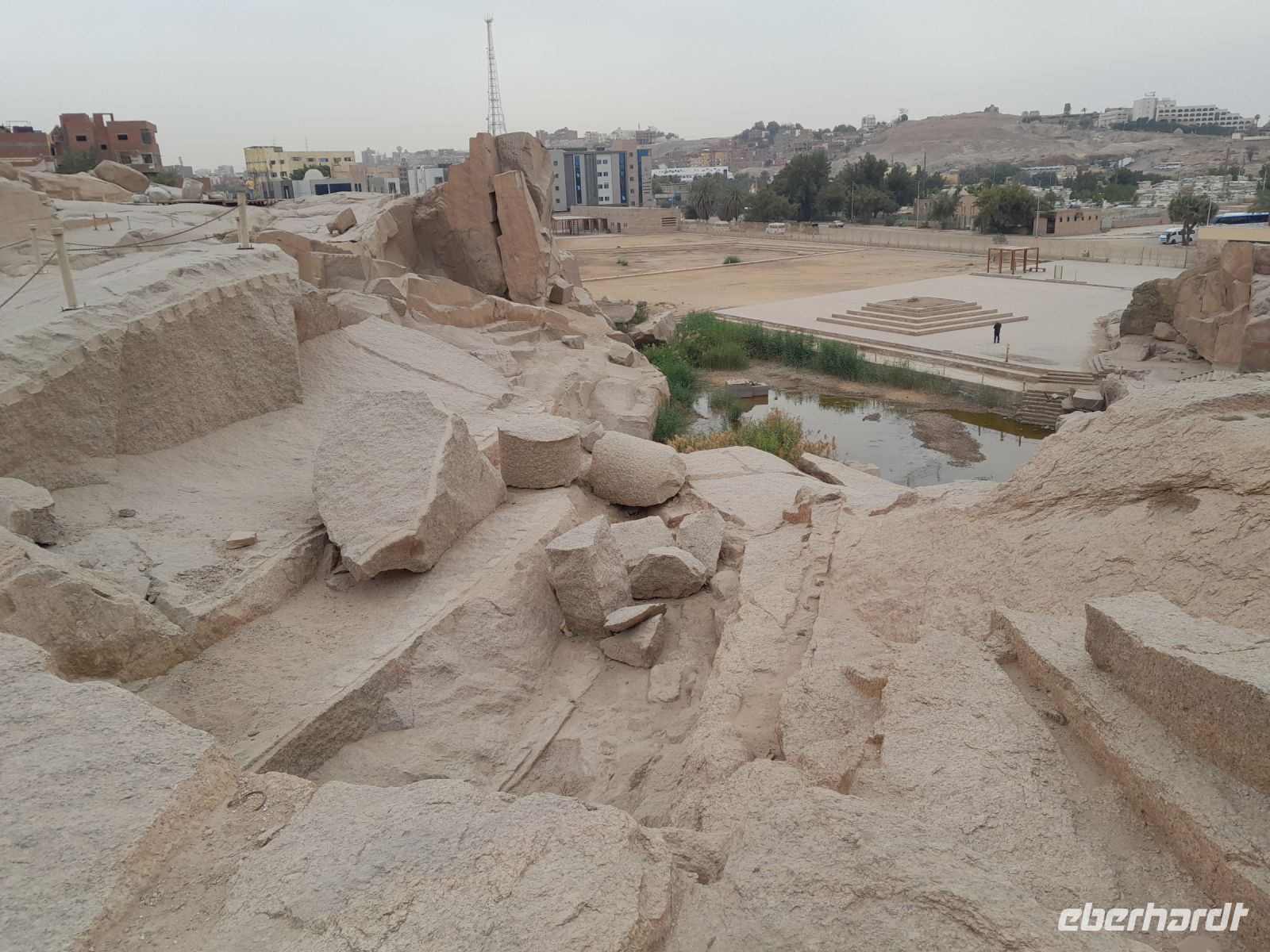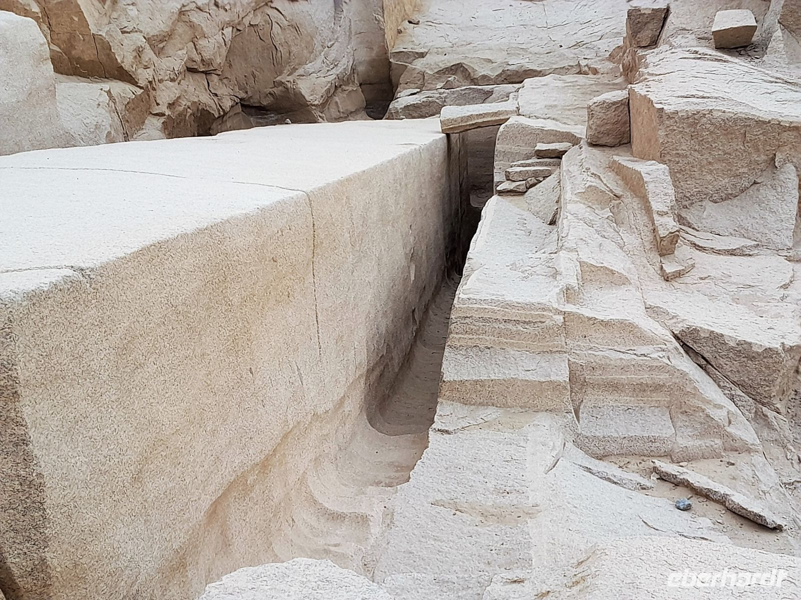 Danach besuchen wir noch einen der Steinbrüche, welche den rosafarbenen Granit lieferten, der für besondere Monumente verwendet wurde. Hier liegt ein unvollendeter Obelisk, welcher der größte Obelisk der antiken Welt mit einem Gewicht von 1162 Tonnen gewesen wäre. Wäre, denn man stellte die Arbeiten wahrscheinlich wegen Rissen im Material ein. Wir haben Gelegenheit, uns diesen Obelisken von der Nähe anzuschauen. Man findet Spuren der Bearbeitung und die Wissenschaftler gewinnen durch diesen Steinbruch mit seinen Spuren Erkenntnisse über die Arbeitsweise der ägyptischen Handwerker.