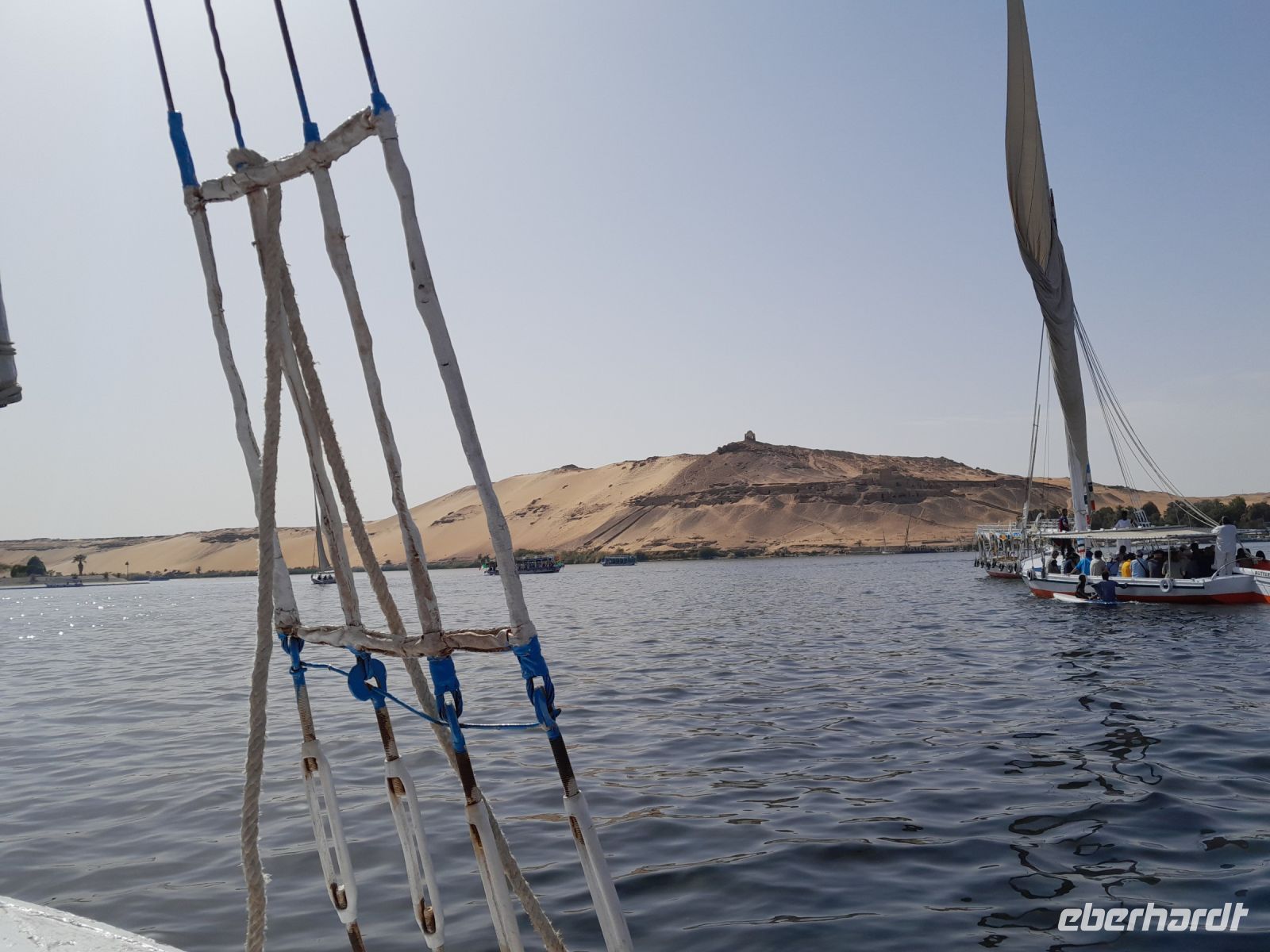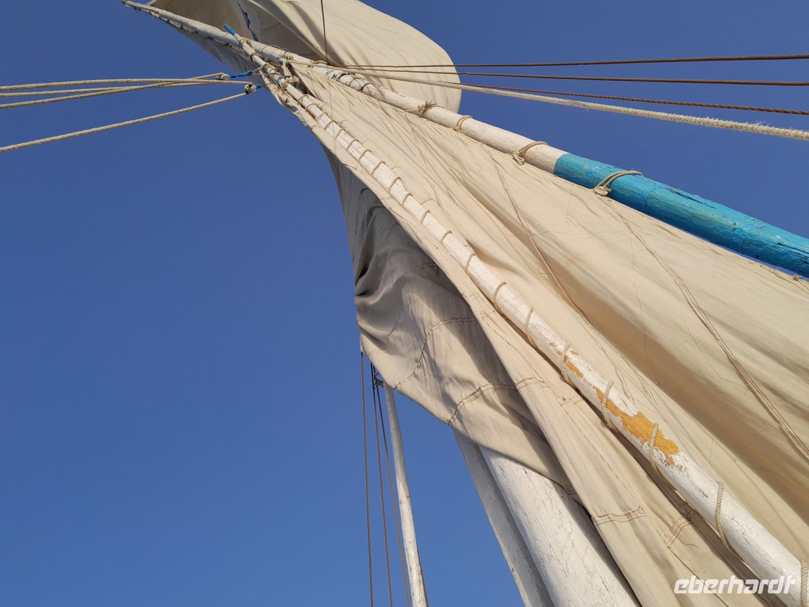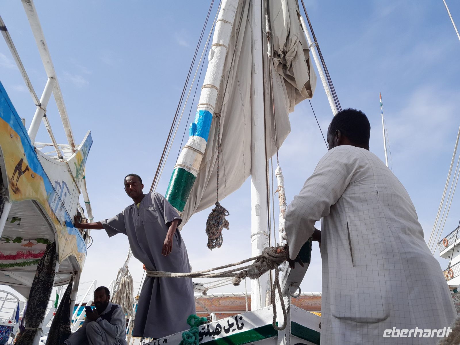 Nach einer Pause und dem Mittagessen steht eine Fahrt mit einer Felukke auf dem Programm. Diese Schiffe haben die typischen Dreieckssegel welche sie gut gegen den Wind kreuzen lassen. Wir balancieren und klettern über mehrere Schiffe und bekommen von der zweiköpfigen Besatzung gezeigt, was es heißt, eine Felukke zu manövrieren. Wir bewundern wie sie aus dem Durcheinander von Schiffen das Schiff frei bekommen. Es ist im Moment nicht so windig und ein Motorboot muss ein wenig nachhelfen. Vorbei geht die Fahrt am Mausoleum von einem heiligen Mann and alten Gräbern.
