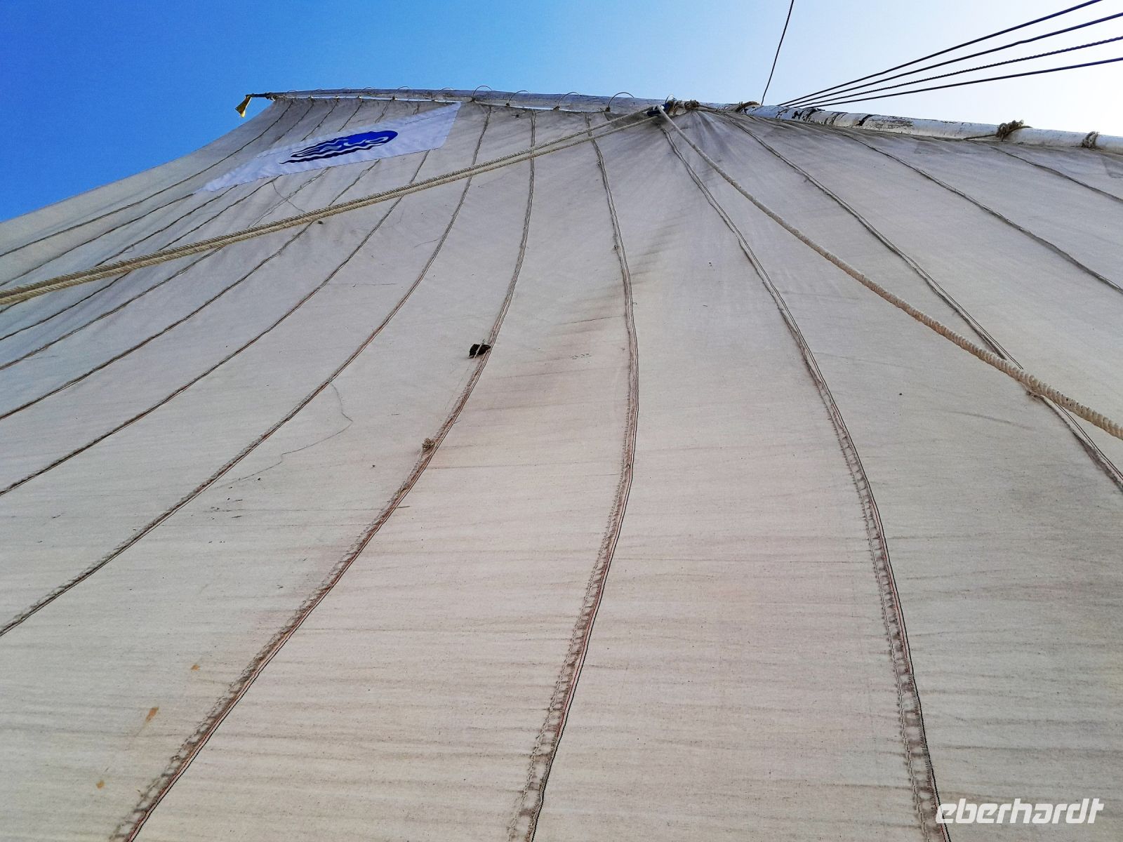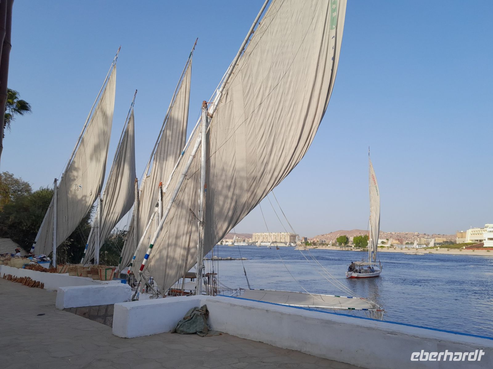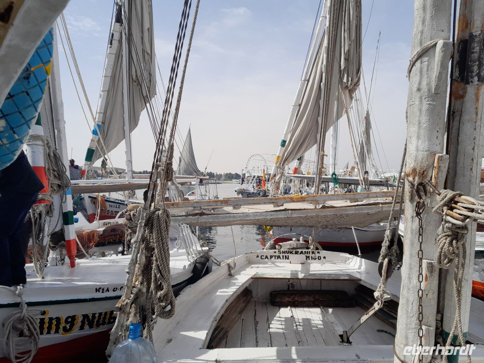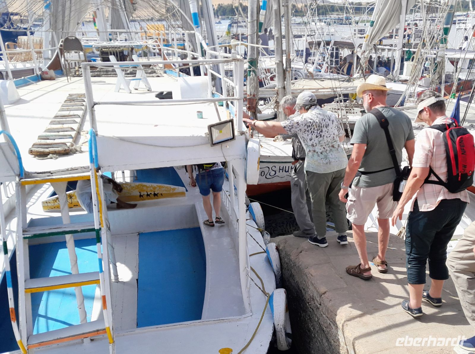 Nach einer Pause und dem Mittagessen steht eine Fahrt mit einer Felukke auf dem Programm. Diese Schiffe haben die typischen Dreieckssegel welche sie gut gegen den Wind kreuzen lassen. Wir balancieren und klettern über mehrere Schiffe und bekommen von der zweiköpfigen Besatzung gezeigt, was es heißt, eine Felukke zu manövrieren. Wir bewundern wie sie aus dem Durcheinander von Schiffen das Schiff frei bekommen. Es ist im Moment nicht so windig und ein Motorboot muss ein wenig nachhelfen. Vorbei geht die Fahrt am Mausoleum von einem heiligen Mann and alten Gräbern.