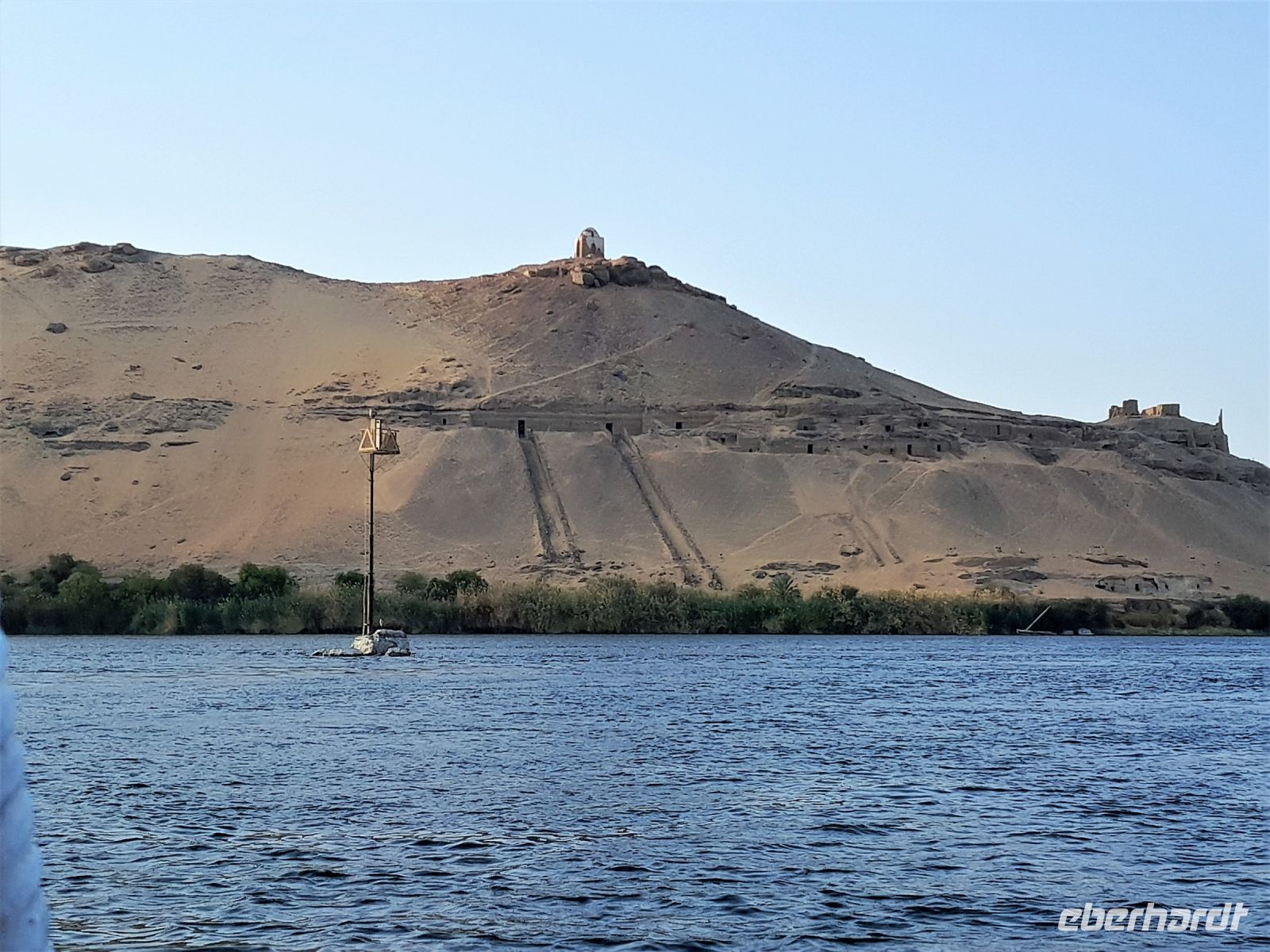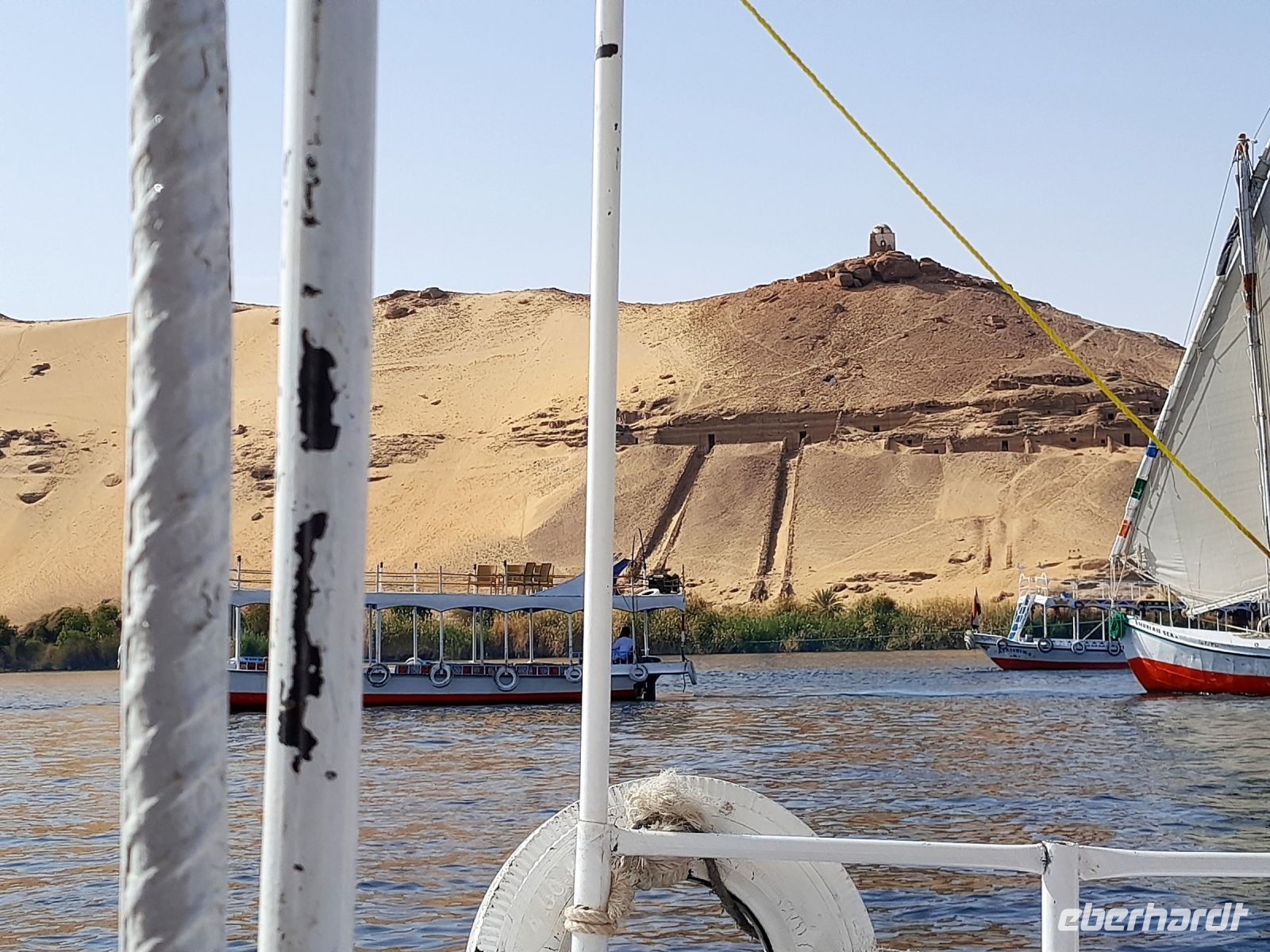 Nach dem Frühstück machen wir heute einen Schiffsausflug zu einem nubischen Dorf. Mit einem überdachten Motorboot geht die Fahrt wieder vorbei an dem Hügel mit mehreren ägyptischen Gräbern. Man sieht noch die breiten Schneisen in denen die Sarkophage von Schiffen nach oben gezogen wurden. Die Spitze des Hügels wird von einem Heiligengrab gekrönt.
