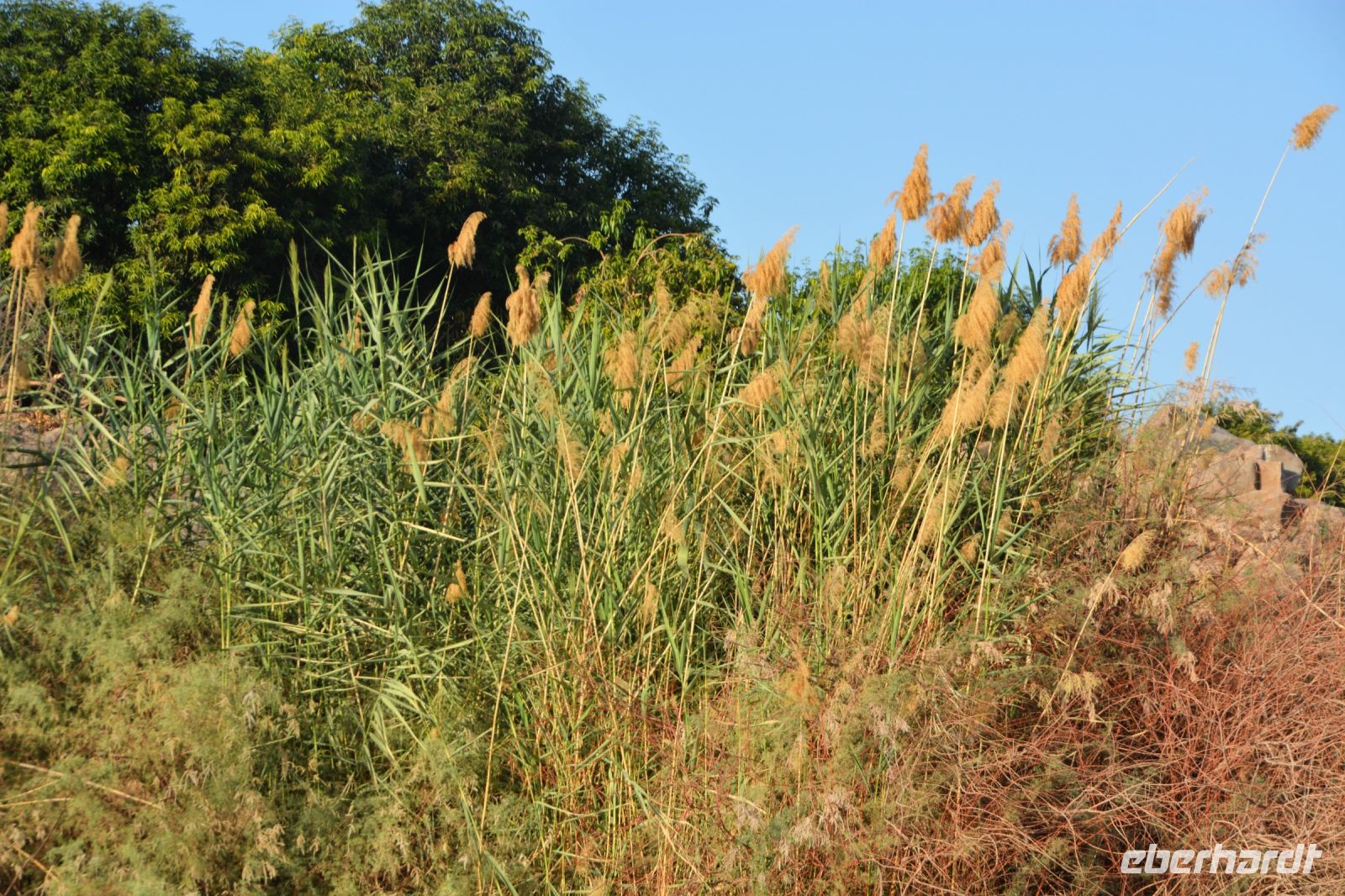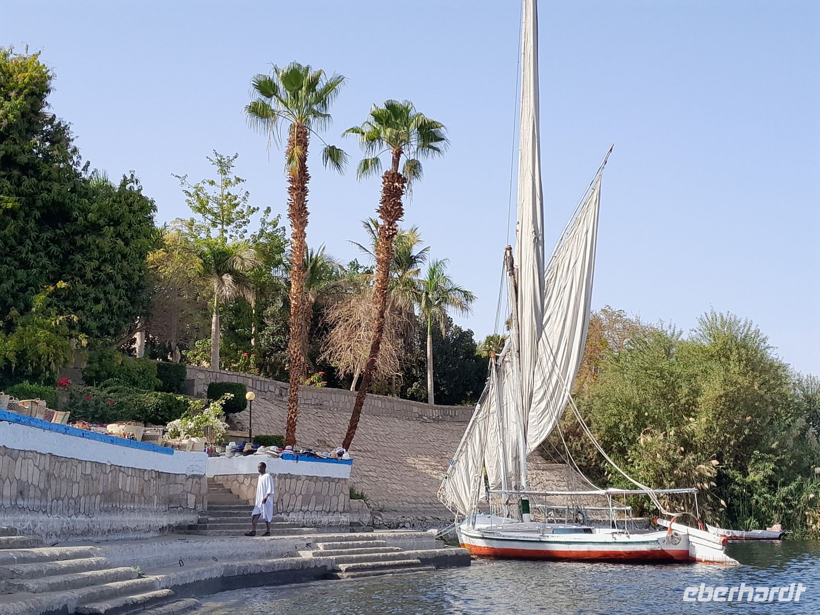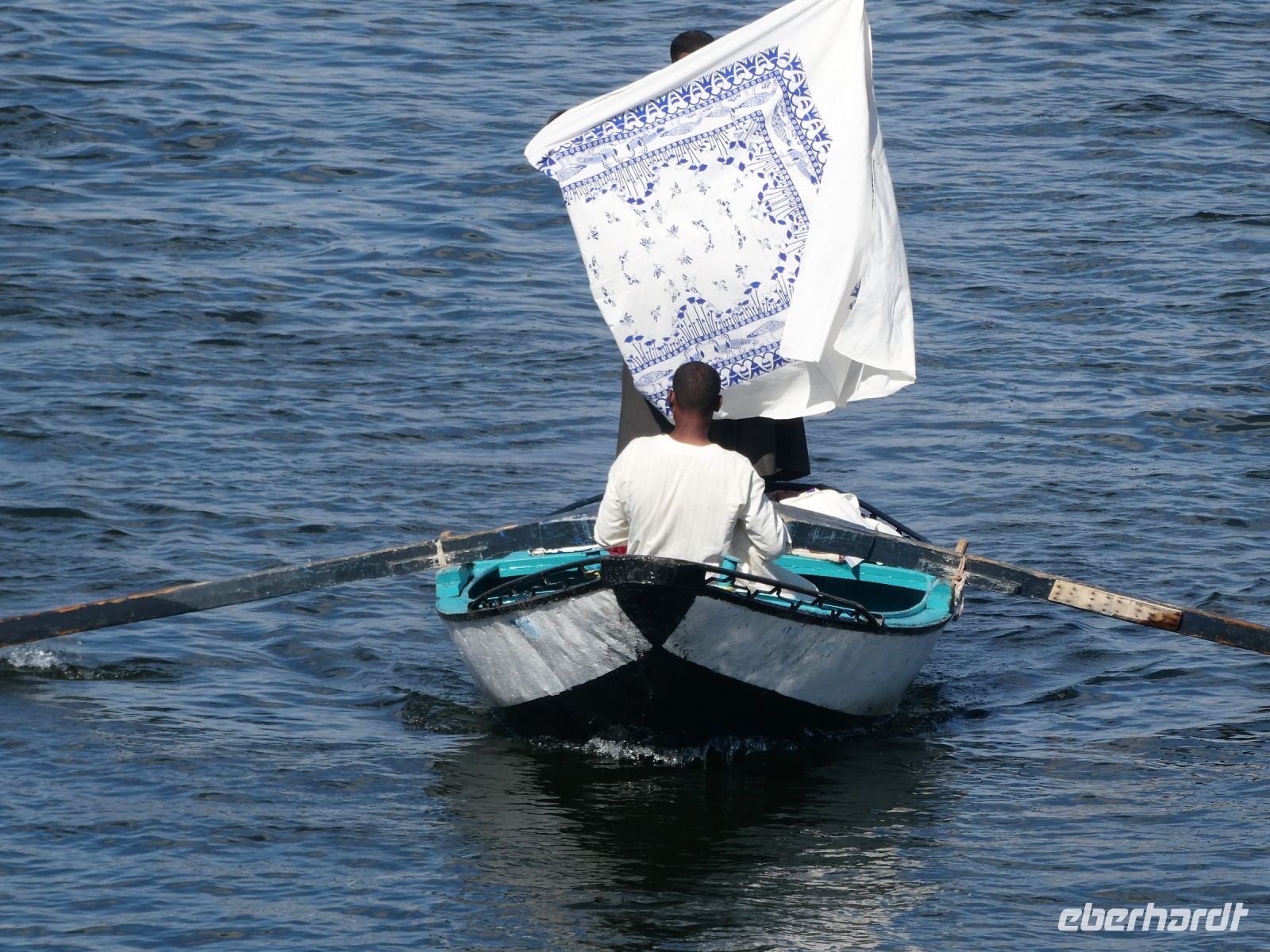 Dem gegenüber steht seine Liebe zu exotische Blumen und Bäume welche er hier pflanzen liess und so ein kleines Pflanzenparadies schuf. Besondere Palmenarten wie die Königspalme und andere exotische Gewächse ziehen besonders Pflanzenliebhaber an. Essam zeigt uns eine Pflanze mit Blättern die eine silbrige Unterseite haben. Sie wurde wohl besonders zum Versenden von Liebesbotschaften verwendet. Wir verweilen einige Zeit auf der Insel, gehen spazieren oder hängen unseren Gedanken nach. Unsere Rückfahrt treten wir wieder an derselben Stelle des Ausstiegs an und dann geht die Fahrt zurück. In der Zwischenzeit hat der Wind aufgefrischt und wir kommen selbständig ohne Motor wieder auf der anderen Seite an, wo unser Schiff liegt.