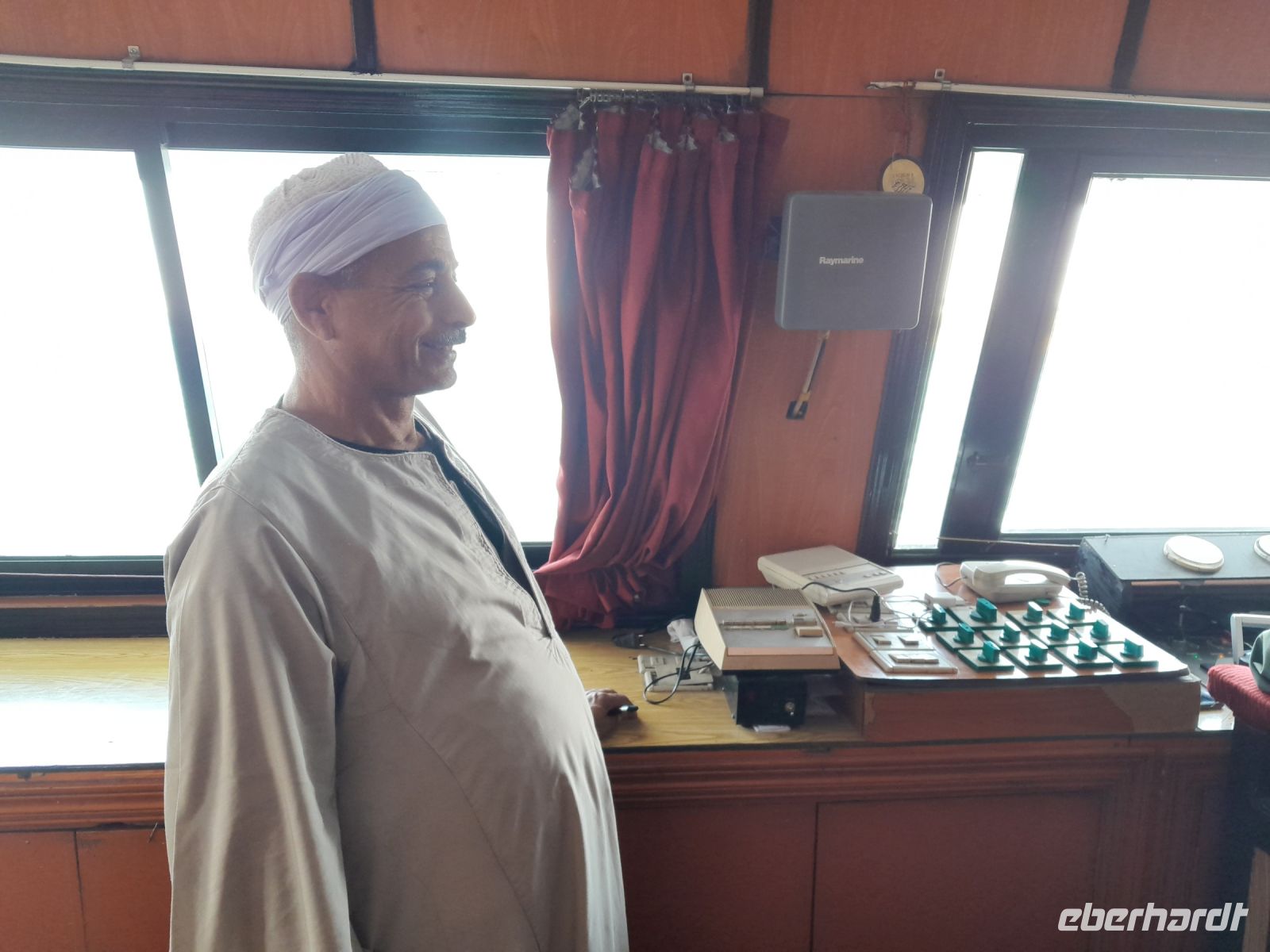 Nach dem Frühstück besuchen wir den Kapitän, den man hier Raiss nennt, auf der Brücke. Ein Beruf der innerhalb einer Familie bleibt und der lange erlernt werden muss. Die Ausbildung beginnt als kleiner Matrose auf einem Nilschiff und führt dann weiter bis die Erfahrung erworben wurde, ein Schiff über Sandbänke und durch Strömungen sicher über den Nil zu navigieren. Das Erkennungszeichen ist eine braune Galabiya und die weiße Kopfbedeckung. Er arbeitet ganz ohne Echolot und kennt die Bedingungen genau.