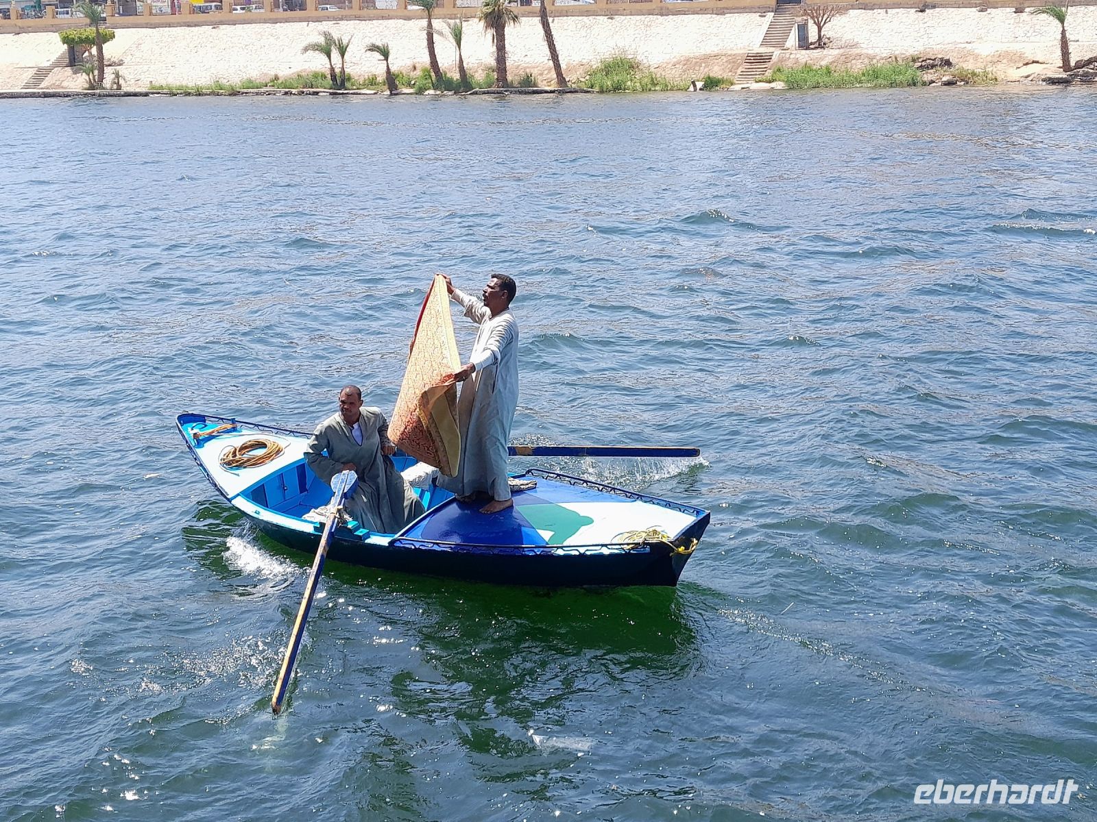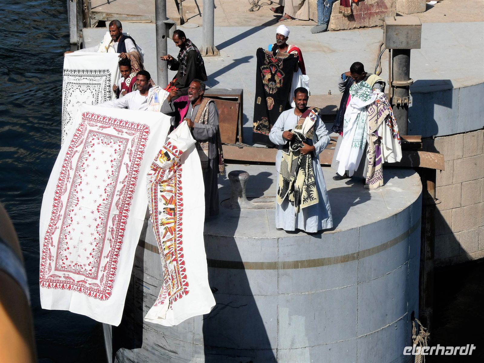 Die Fähre bei Esna passieren wir wieder mit großem Hallo der Händler, welche ihre Tischdecken an den Mann bzw. die Frau bringen wollen. Aber bei uns haben sie nicht so viele Chancen.
