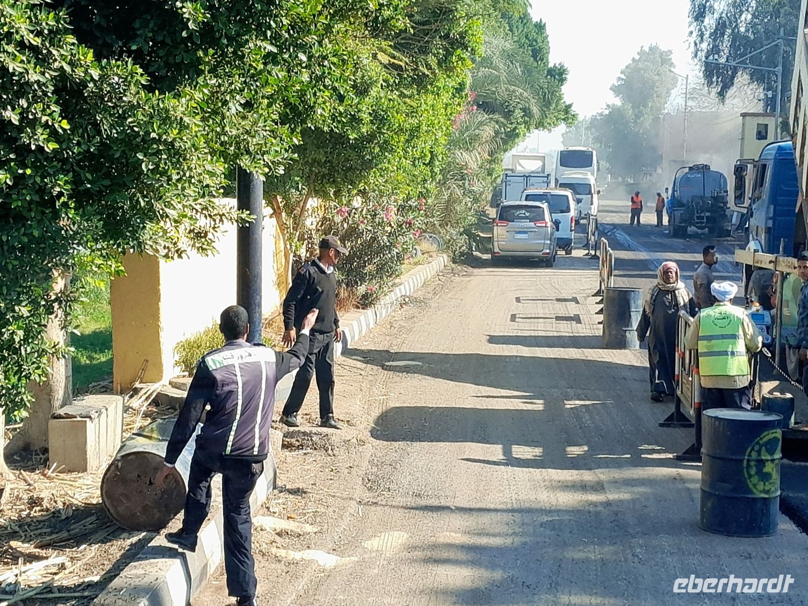 Auf dem Weg dorthin ereignet sich aber ein kleiner Zwischenfall. Während der Fahrt werden wir von einem PKW mit sehr aggressiver Fahrweise provoziert und das Fahrzeug verliert dabei seinen Rückspiegel. Der genaue Hergang lässt sich später schwierig nachvollziehen. Unser Fahrer, wohl ein heißblütiger Oberägypter, der zudem auch noch fastet, verliert die Beherrschung und lässt sich in ein Gerangel mit dem PKW-fahrer hineinziehen. Doch Essam greift ein und ihm gelingt es zusammen mit anderen die beiden Kontrahenten voneinander zu trennen. Essam hat uns über die Oberägypter gesagt, sie wären dickköpfig. Das war wohl heute eine Sondervorstellung der besonderen Art.