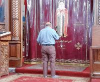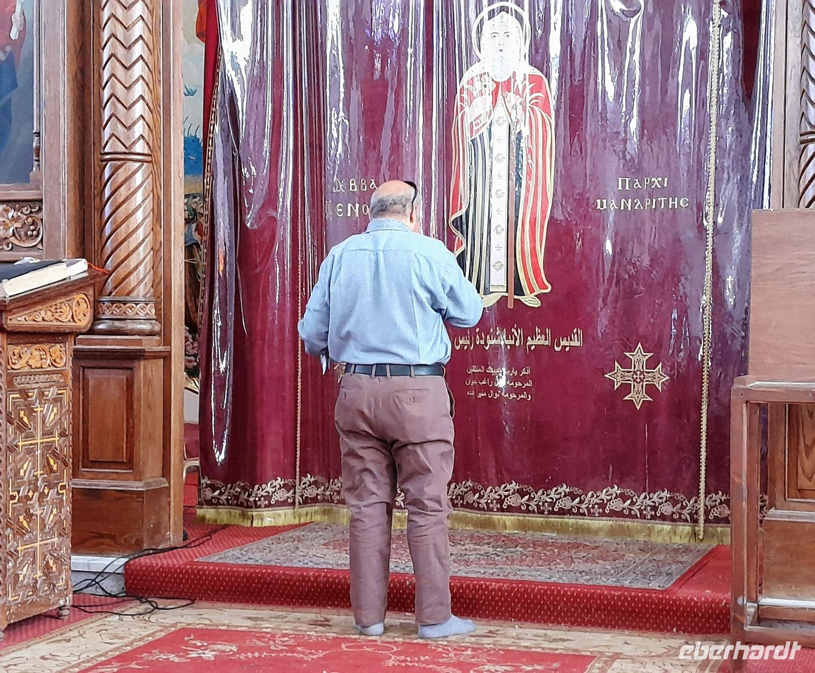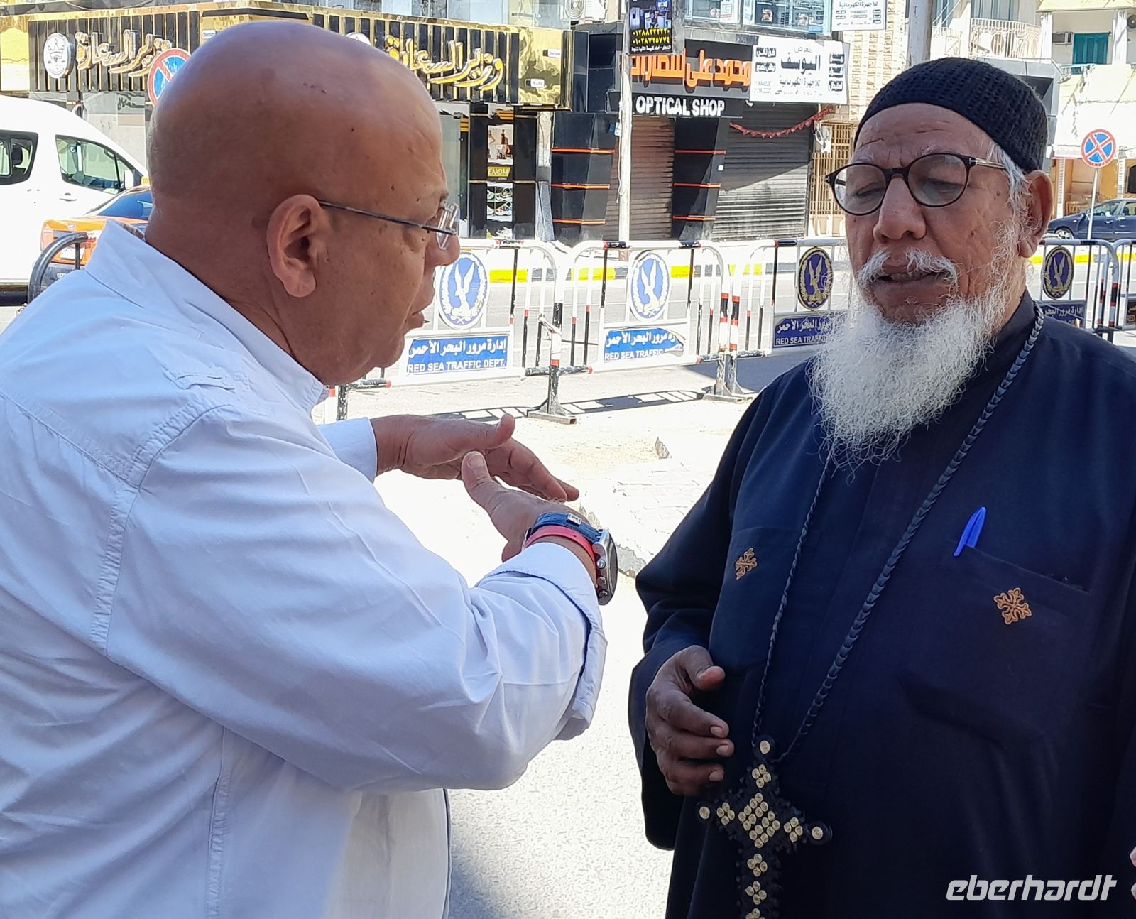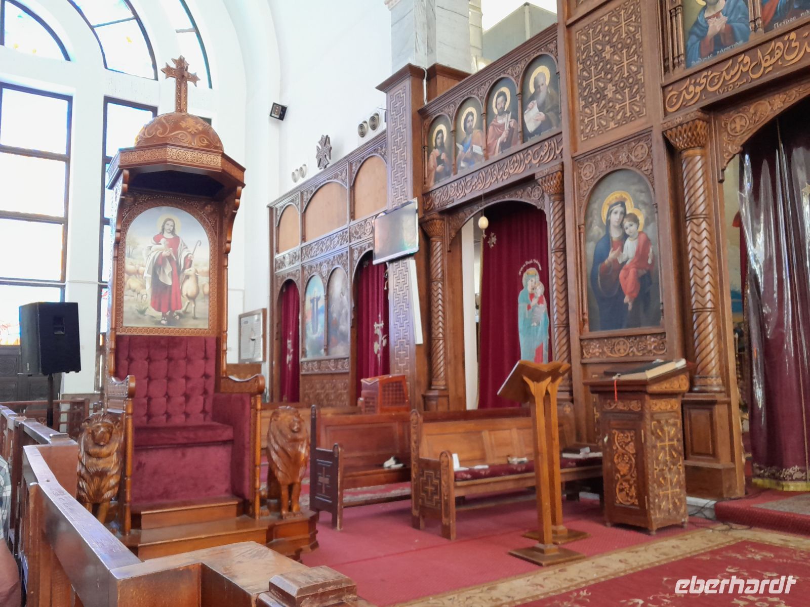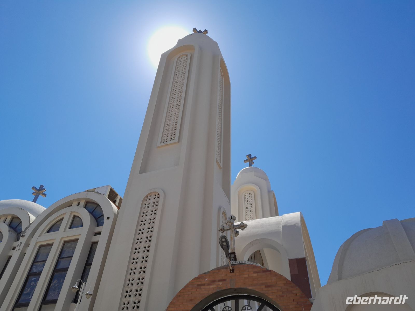 Heute hat sich Essam bereit erklärt, mit uns zum Markt in die Altstadt von Hurghada zu fahren und dafür einen Bus zu organisiert. Wir fahren in Richtung Stadtzentrum, denn unser Hotel liegt außerhalb. Schon bald halten wir vor unserem ersten Ziel, der koptischen Kirche von Hurghada. Die Kopten die zu den Urchristen gehören wurden während der Herrschaft der Muslim-Brüder verfolgt und einige sind in das Ausland geflohen. Andere aber sind in Ägypten geblieben waren sie doch schon immer ein Bestandteil der ägyptischen Gesellschaft. Heute gehören ca. 10 % der Bevölkerung dieser Gruppe an. Wir besuchen die Kirche die Außen in Weiß erstrahlt. Im Innenraum findet man religiöse Malereien und bunte Glasfenster. Die Gemeinde nimmt wohl sehr lebhaft an den Gottesdiensten teil und lebt in guter Gesellschaft mit den muslimischen Kollegen, denn die Religionen respektieren sich gegenseitig. Bei einem Gespräch zwischen Essam und dem Priester, dem wir vor der Kirche begegnen, wird uns das bestätigt. Die koptische Kirche engagiert sich besonders in sozialen Bereichen und unterhält auch Schulen und Kindergärten.