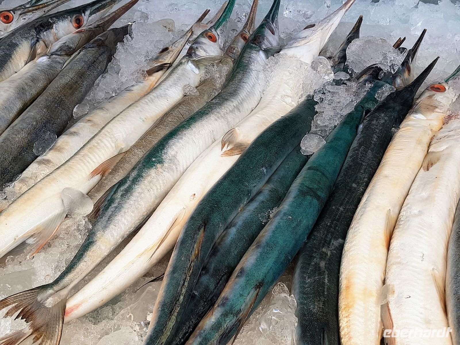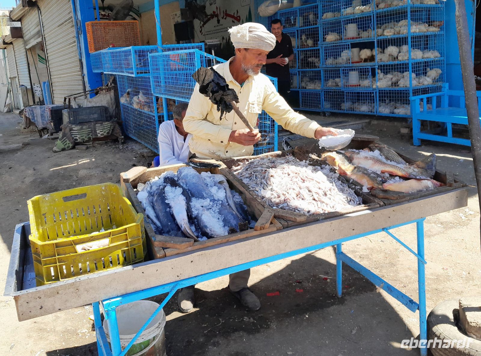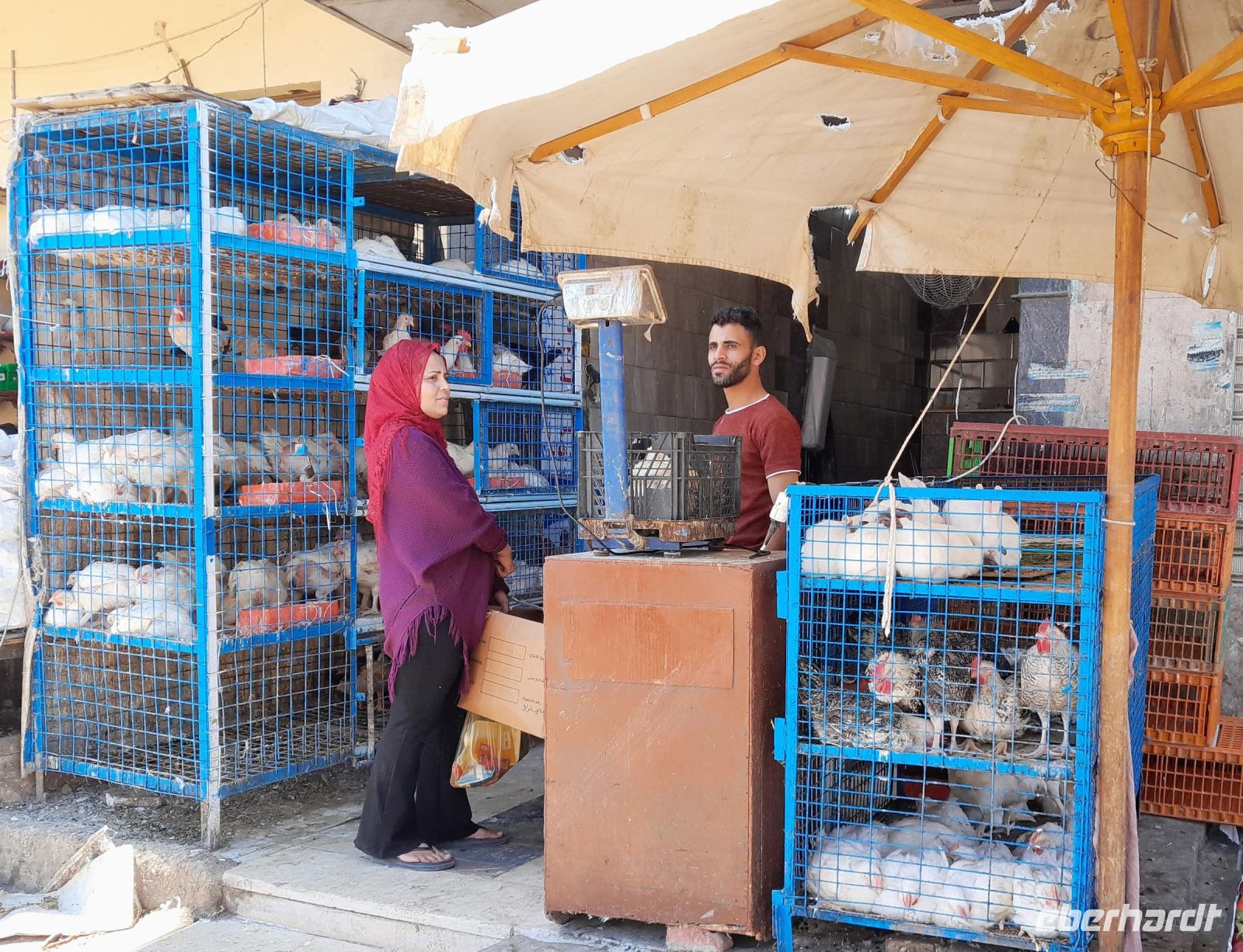 Wir fahren weiter zum traditionellen Gemüse- und Obstmarkt. Ein buntes Treiben empfängt uns. Trotz des Ramadans ist hier einiges los, wenn auch weniger als zu den normalen Zeiten. Eine bunte Vielfalt an Waren ist hier erhältlich. Da konkurrieren riesige Kohlköpfe mit Auberginen und Bananen. Wir kommen an Geflügelständen und Fleischern vorbei. Auch Fisch wird angeboten. Es schein frischer Fisch zu sein, denn man nimmt kaum einen Geruch war.