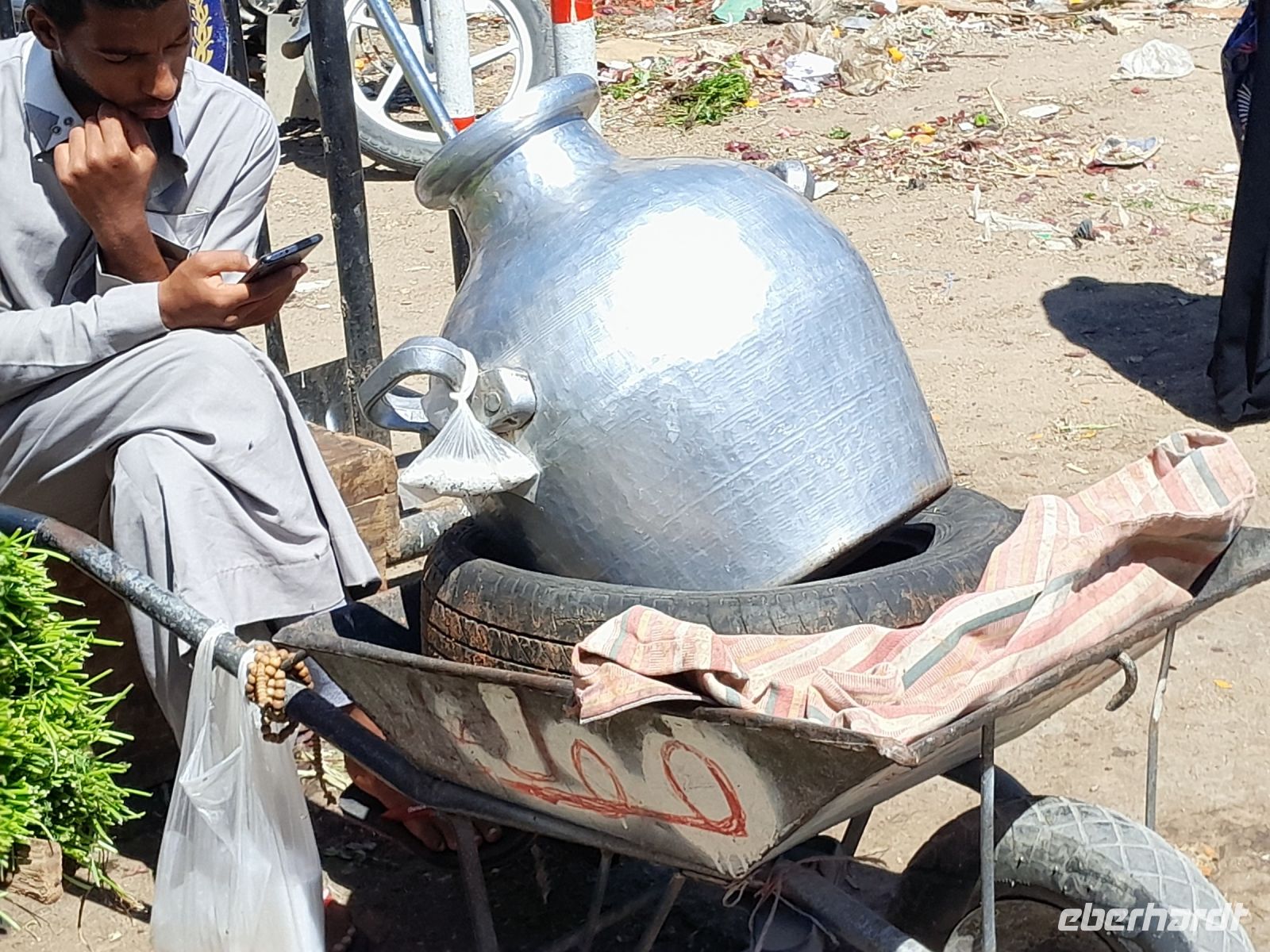 Hier im Teehaus kann Essam eine Wasserpfeife rauchen und wir bekommen ein Teegetränk mit Bockshornkleesamen aufgebrüht. Es schmeckt leicht bitter was auf eine medizinische Wirkung deutet. Tatsächlich wird Bockshornklee als Kräftigungsmittel eingesetzt.