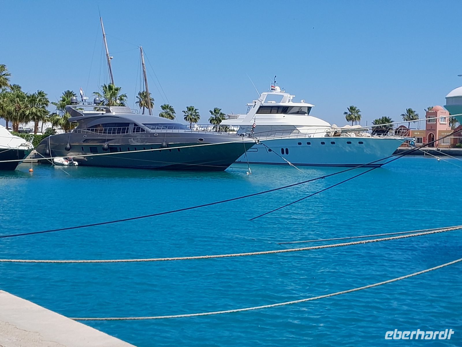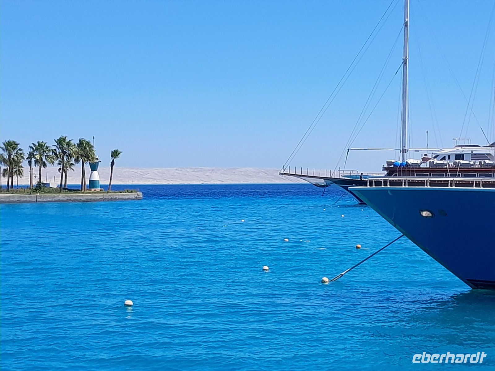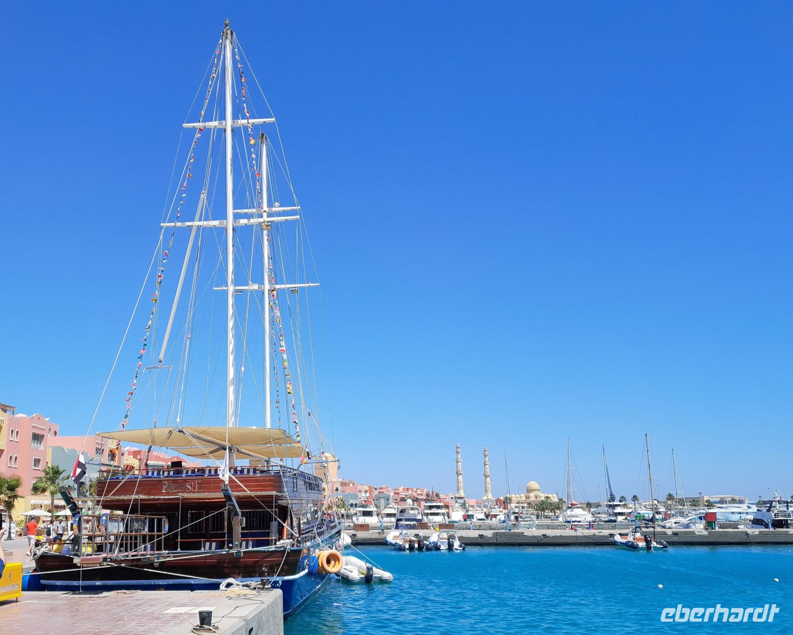 Nach diesem Besuch fahren wir zu einem Aussichtspunkt von dem wir die Skyline von Hurghada bewundert können. Die Stadt ist vor 40 Jahren aus dem Nichts entstanden und hat sich seit dieser Zeit zu einem städtischen Zentrum entlang einer Küstenlinie von ca. 30 Kilometern entwickelt. In der Ferne kann man schon die Moschee erspähen, welche jedoch von unserem nächsten Ziel, dem Hafen von Hurghada noch näher in unser Bild rückt. Der Hafen besitzt eine Flaniermeile mit zahlreichen Restaurants und Bars. Teilweise liegen an der Marina sehr teure Yachten und auch Segelschiffe. Gleich am Ufer beginnt das Rote Meer, das heute in prächtigen Blautönen leuchtet. Sogar Fische können wir im Hafenbecken entdecken. Wir spazieren noch ein wenig in Richtung Moschee und steigen dann am Ende des Spaziergangs wieder in unseren Bus der uns zu unserem Hotel zurückbringt.