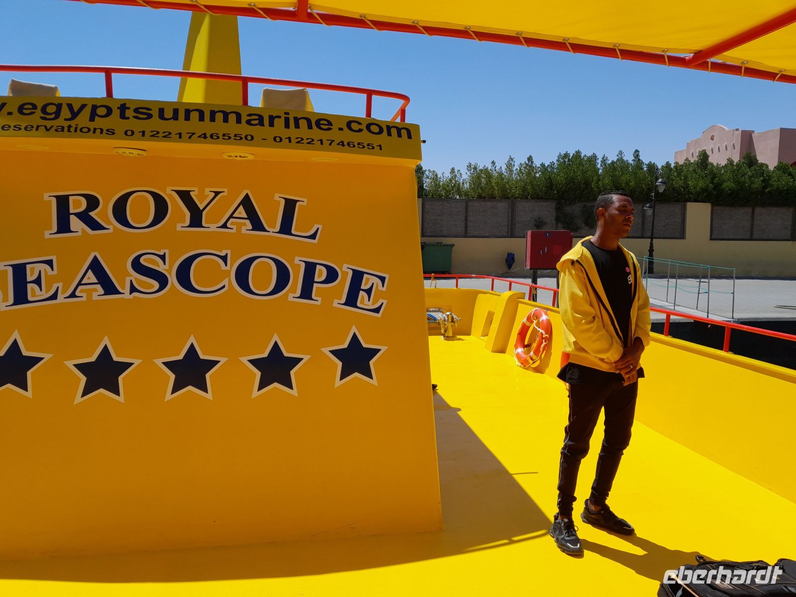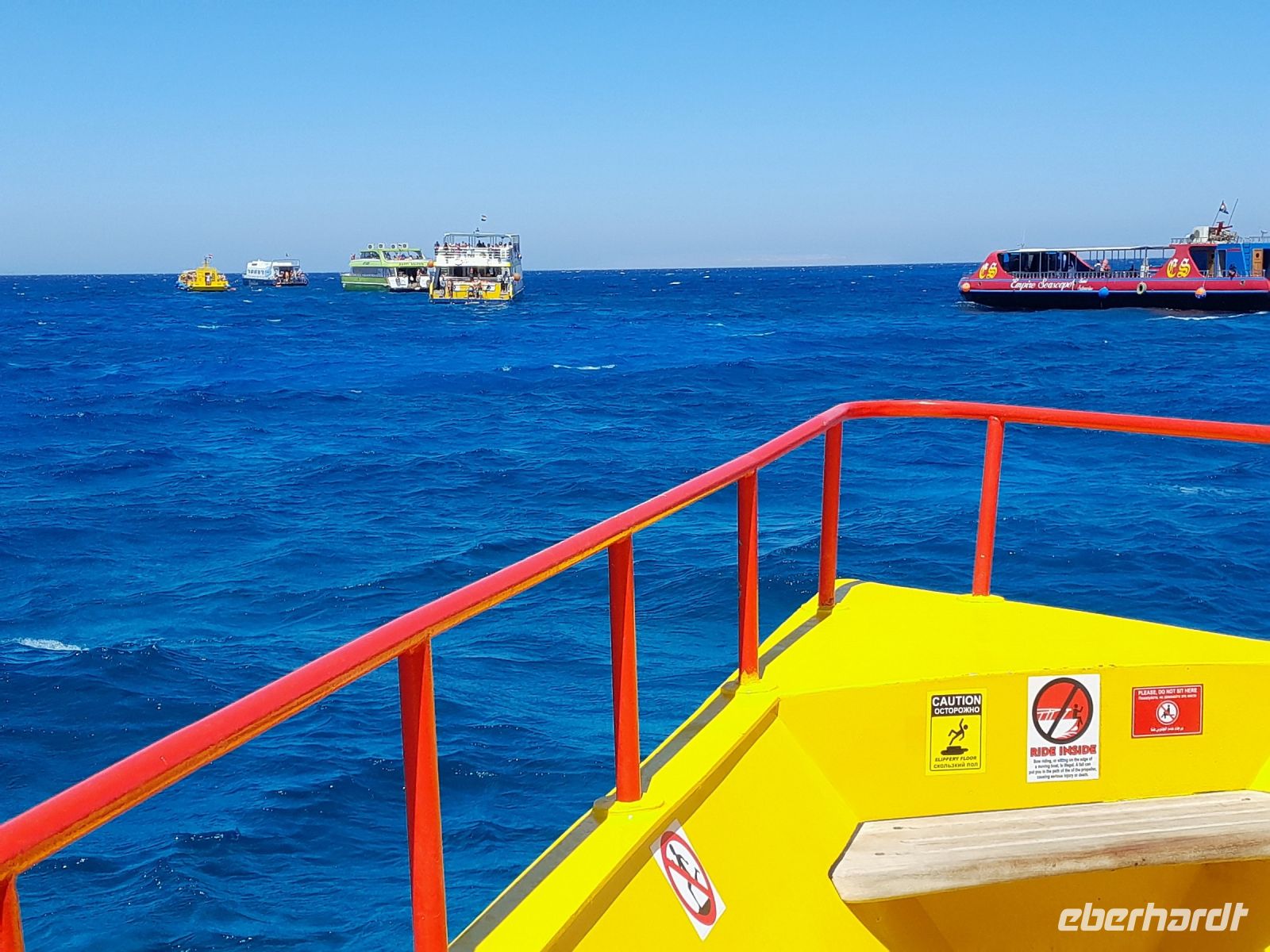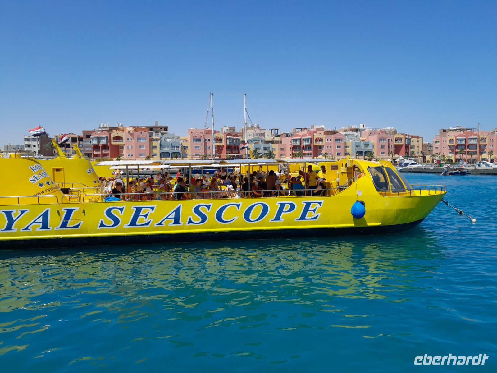 Alle haben sich entschlossen auch heute den zusätzlich organisierten Ausflug zu machen. Wir werden am Vormittag von 2 Fahrzeugen abgeholt, die uns noch einmal zum Hafen von Hurghada bringen. Wir wollen wenigstens durch die Scheibe die berühmte Unterwasserwelt des Roten Meeres sehen.