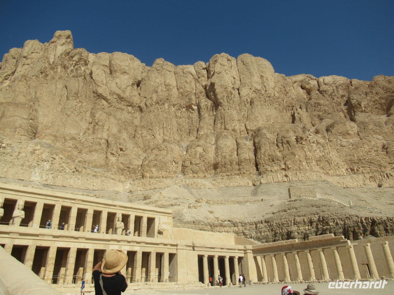 Nach der abwechslungsreicher Pause ist unser nächstes Ziel: Der Totentempel der Hatschepsut der aus der Zeit der 18. Dynastie stammt und ist der am besten erhaltene Tempel in Deir el-Bahari am Westufer des Nil in Theben. Es ist mit seiner Architektur eines den berühmtesten und ungewöhnlichsten Gebäuden des alten Ägypten. Der Komplex besteht aus drei Terrassen die über Rampen miteinander verbunden sind.