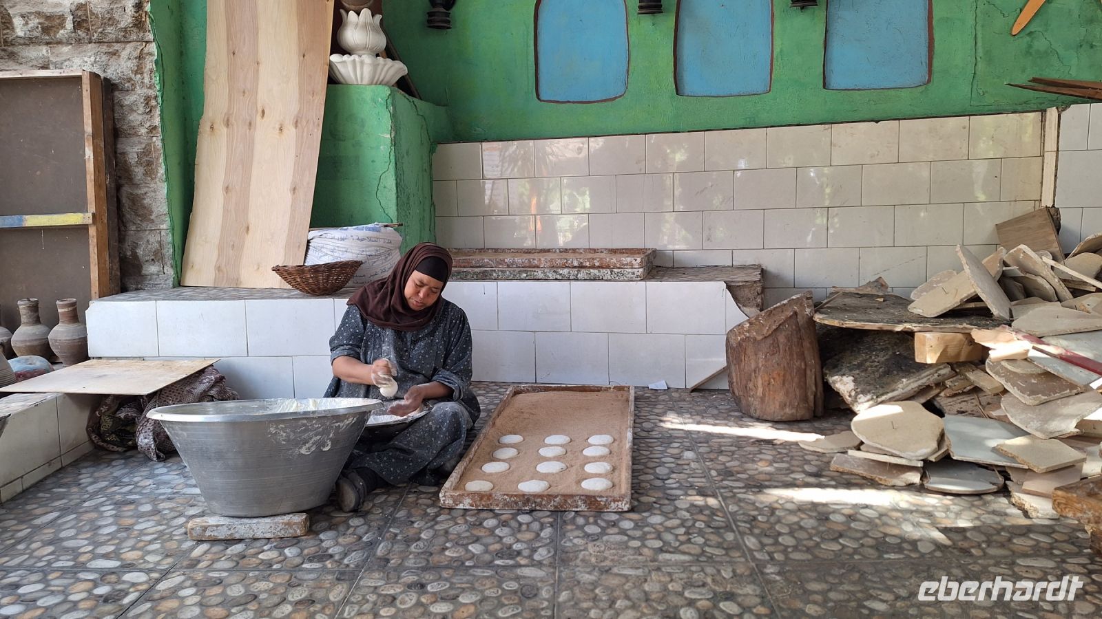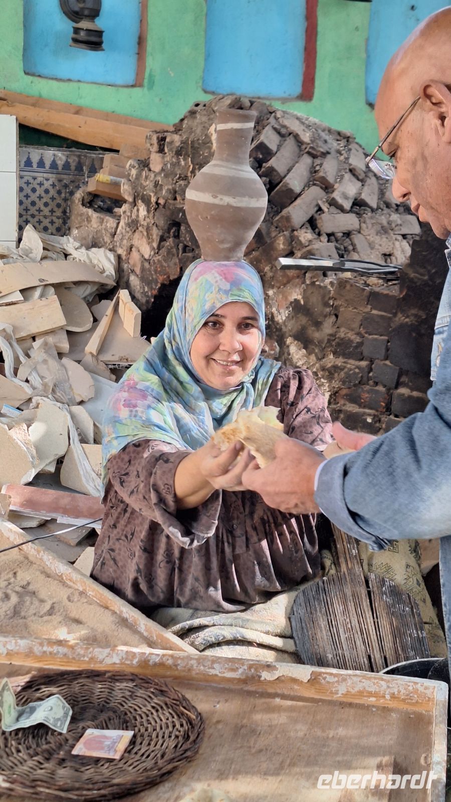Bevor wir unser Kulturprogramm weiterführen, haben wir eine Pause rätlich verdient. Wir fahren wieder entlang des Nils und erreichen nach kurzer Fahrt ein schönes Gartenlokal, wo wir mit lauter traditioneller Musik empfangen werden. Es ist noch früh und wir sind wahrscheinlich die ersten Gäste heute. Gleich am Eingang treffen wir auf zwei Damen, die uns demonstrieren, wie Fladenbrot im Holzofen gebacken wird – wir dürfen es auch sofort und noch warm verkosten. Lecker!