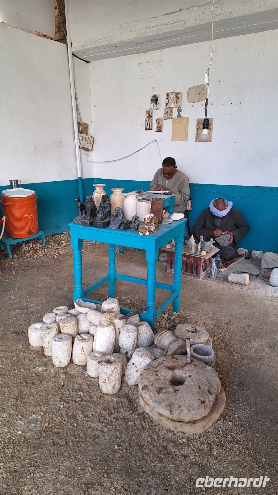 Von den antiken Steinmetz-Arbeiten geht es weiter zu den aktuellen. In der Nähe von Luxor befinden sich heute noch die größten Alabastersteinbrüche Ägyptens und das durchscheinende Gestein ist bis heute sehr beliebt. Wir besuchen eine Werkstadt, wo uns zunächst eindrucksvoll demonstriert wird, wie man den Stein traditionell mit der Hand bearbeitet – dann sehen wir den Unterschied zu einem maschinell gefertigten Werkstück. Ein riesengroßer Unterschied. Im Geschäft ist dann Zeit sich umzusehen und die vielen Vasen, und Lampen zu bestaunen und, wenn man möchte, eines der hochwertigen Andenken zu erwerben. Mit Tee und Kaffee können wir uns ein wenig erfrischen, bevor es dann weitergeht zur nächsten Besichtigung.