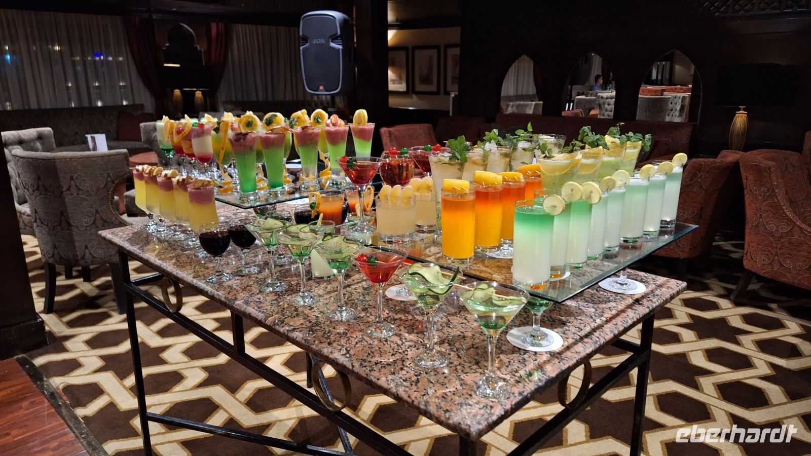 Vor dem Abendessen treffen wir uns in der Lounge Bar unseres Kreuzfahrtschiffs, denn ein Mitglied unserer Reisegruppe feiert heute Geburtstag und hat uns alle eingeladen. Wir überbringen Glückwünsche und Geschenke und plaudern ein wenig in geselliger Runde, bevor wir dann zum Abendessen übergehen.