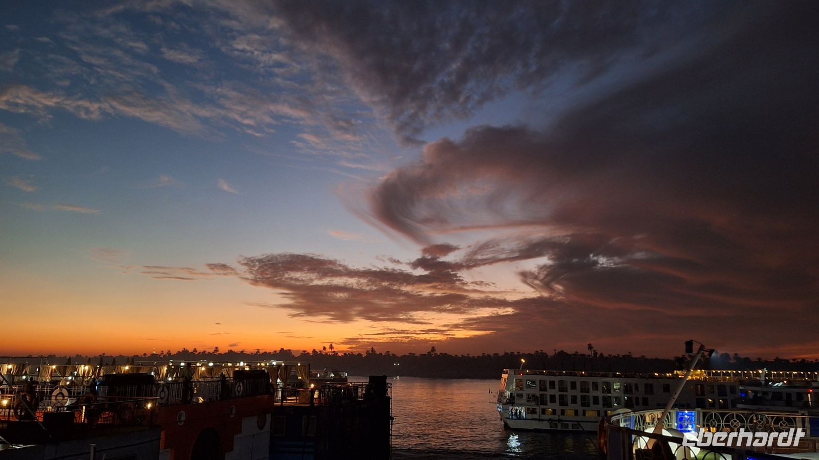 Nun geht es zurück in Richtung Luxor. Wir überqueren den Nil wieder in Richtung Osten und müssen dann gar nicht mehr weit fahren, denn praktischer Weise ist uns unser Schiff schon ein Stück entgegen gekommen. Zurück an Bord haben wir uns unser Mittagessen heute wirklich verdient. Die vielen Eindrücke müssen erst einmal verarbeitet werden. Den Nachmittag verbringen wir heute auf dem Sonnendeck, denn unsere Nil-Kreuzfahrt geht nun endlich los und wir können die herrlich grüne Landschaft an uns vorbeiziehen lassen. Überrascht werden wir einmal mehr von der Findigkeit der Händler. Mit ihren Booten warten sie darauf, dass ein Kreuzfahrtschiff vorbeikommt und werfen dann ihre Enterhaken aus wie moderne Piraten. Während sie sich nun mitziehen lassen, versuchen sie die Gäste an Bord zum Kauf ihrer Waren zu überzeugen – mit genug Durchhaltevermögen funktioniert das auch erstaunlich gut. Vor Sonnenuntergang erreichen wir Esna. Hier müssen wir warten, denn nilaufwärts geht es nur durch eine Schleuse weiter. Dass nun zahlreiche Schiffe auf Warteposition liegen machen sich natürlich wieder die schwimmenden Händler zu Nutze und gehen einigen mit ihren penetranten Rufen doch gewaltig auf die Nerven. Wie gut, dass das der Cocktailabend in der Lounge Bar wartet und man sich mit dem passenden Getränk in der Hand doch ganz gut ablenken lassen kann.