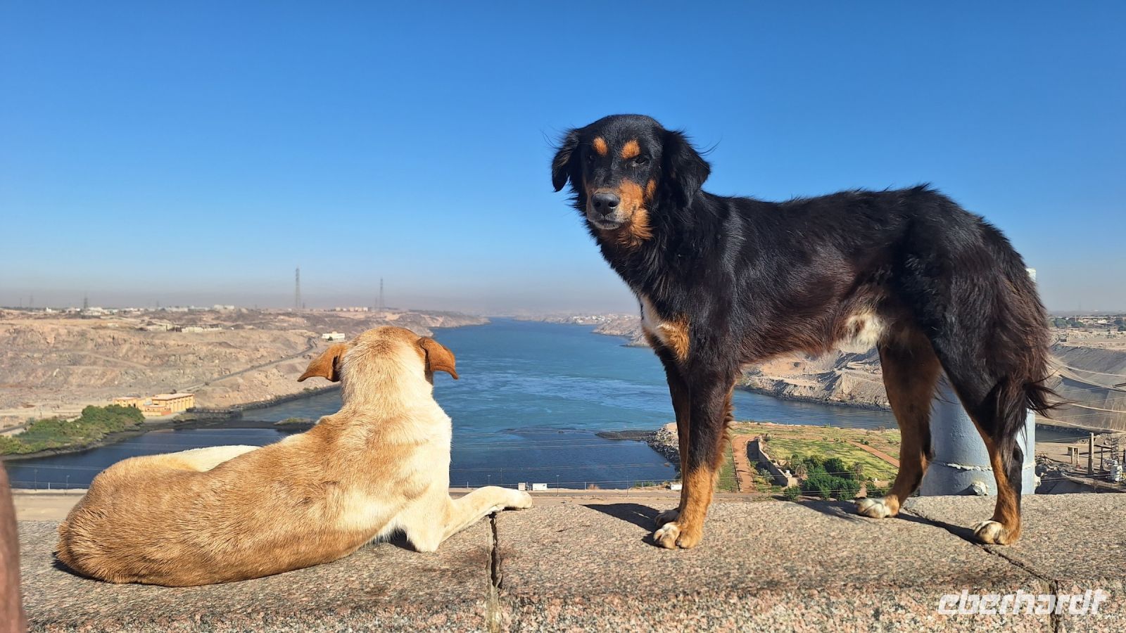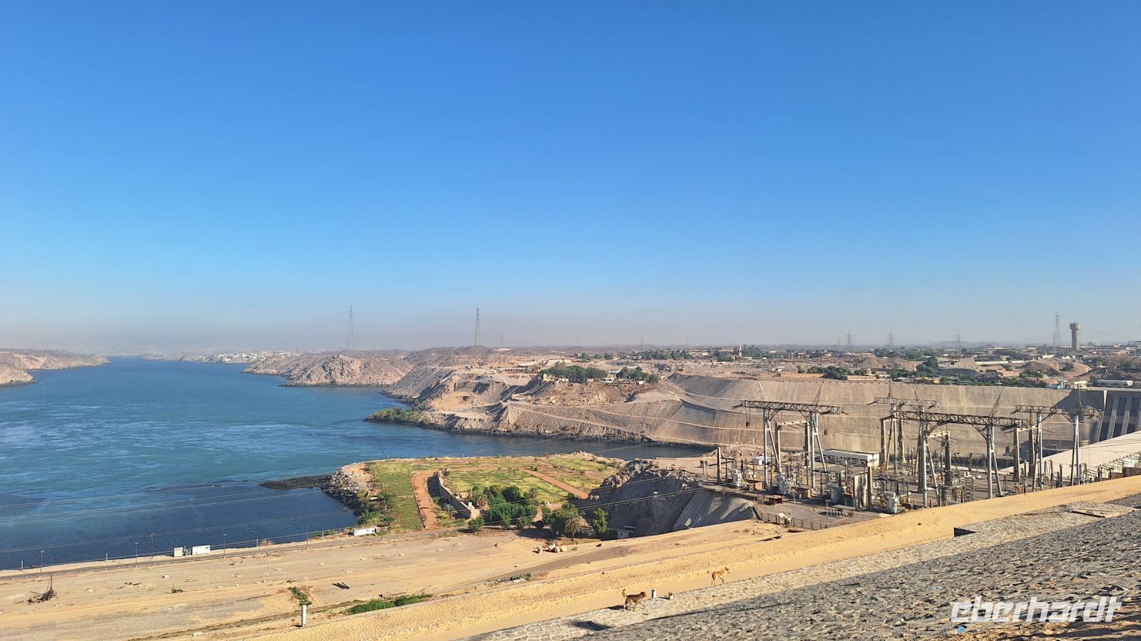 Mit dem Bus überfahren wir wenig später die alte Staumauer, die zwischen 1898 und 1902 errichtet wurde und die die ganzjährige Bewässerung der Felder im Niltal gewährleisten sollte. Die alte Mauer verfügte noch über Durchlässe, die den fruchtbaren Nilschlamm passieren ließen. Jedoch erwies sich dieses erste Bauwerk als zu klein, um seiner Bestimmung gerecht zu werden. Ein neuer Staudamm sollte nun das Problem lösen und wurde von der Regierung als „Barriere gegen den Hunger“ beworben. Nach zahlreichen diplomatischen Auseinandersetzungen wurde der Assuan-Hochdamm mit Hilfe der Sowjetunion im Jahr 1970 fertiggestellt. Der neue Staudamm sorgt für die Regulierung der Wasserstände und versorgt fast ganz Ägypten mit Strom, jedoch fehlt die Versorgung der Felder mit dem so wichtigen fruchtbaren Nilschlamm, Kunstdünger muss eingesetzt werden und führt zur Versalzung der Felder und zum Rückgang des Fischreichtums im unteren Nil. Auf der anderen Seite des Damms ist der etwa 500 Kilometer lange Nasser-See entstanden, der drittgrößte Stausee der Erde.