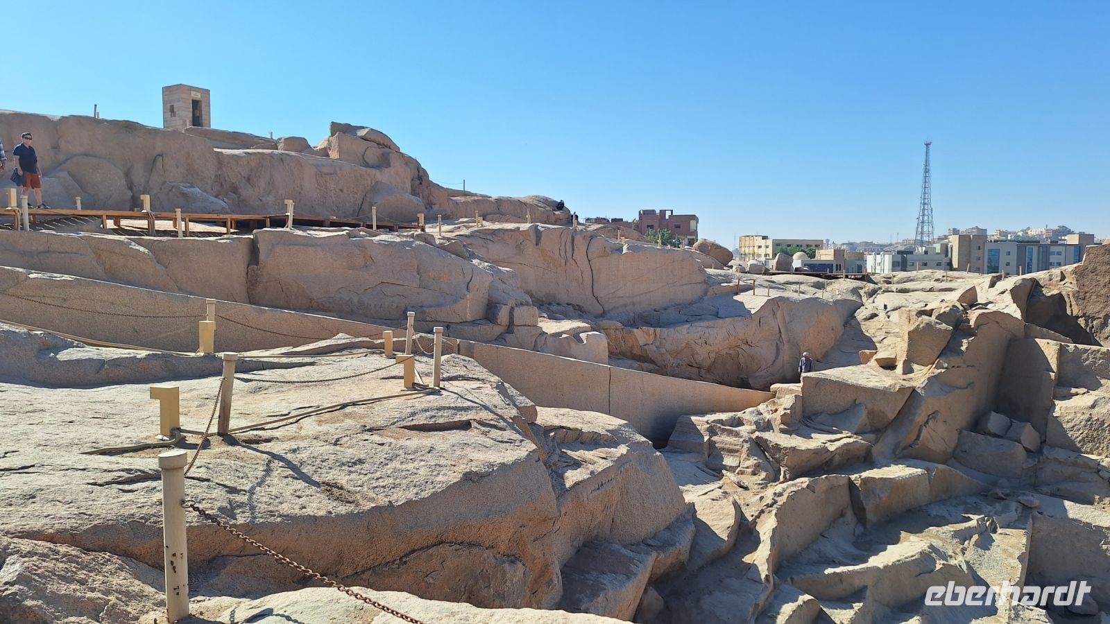 Der letzte Programmpunkt heute Vormittag ist die Besichtigung des Steinbruchs von Assuan. Hier wurde der berühmte rosafarbene Granit abgebaut, aus dem fast alle Obelisken in ganz Ägypten hergestellt wurden. Ein unvollendeter Obelisk liegt heute noch immer hier. Wahrscheinlich wurde er wegen eines Risses aufgegeben, sonst wäre er mit über 30 Metern Höhe und 1162 Tonnen der größte Obelisk der antiken Welt geworden. Man vermutet, dass er ursprünglich an Stelle des Hatschepsut-Obelisken in Karnak stehen sollte.