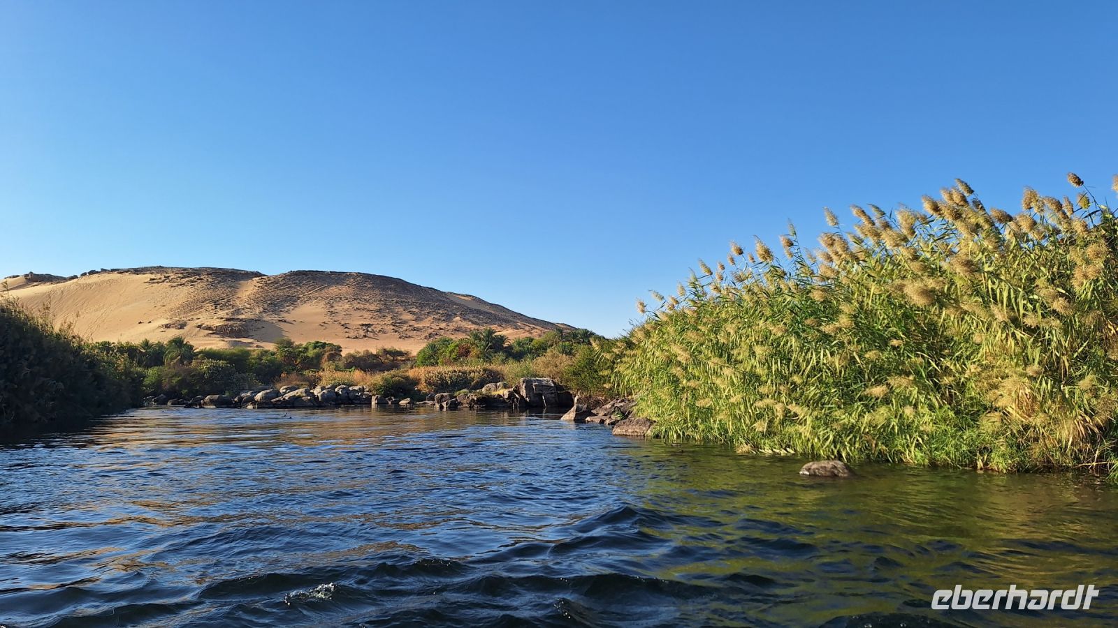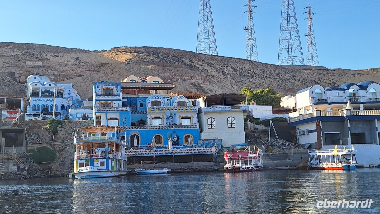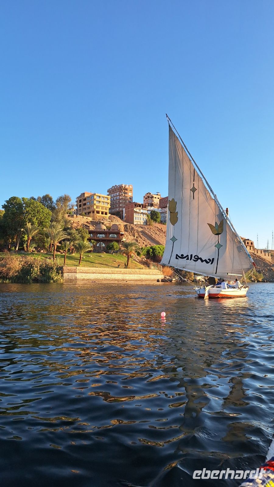 Nach einer ausgedehnten Mittagspause auf dem Schiff gehen wir zum gemütlichen Teil des Tagesprogrammes über. Direkt neben der Steigenberger Legacy steigen wir auf eine Felukke, ein traditionelles Segelboot. Eine gute halbe Stunde gleiten wir ruhig über den Nil, dann steigen wir auf ein etwas schnelleres Motorboot um, denn wir wollen noch weiter in das Naturschutzgebiet Richtung Süden fahren. Wir genießen die herrliche Natur und können unterwegs auch einige Wasservögel aus nächster Nähe beobachten. Nach etwa einer Stunde legen wir an, und werden auch schon freundlich begrüßt. Essam möchte uns ein echtes nubisches Dorf, keine künstlich erschaffene Touristenattraktion, zeigen. Lulu, als Vertreter seiner Gemeinde, führt uns vom Ufer hinein in den Ortskern. Unterwegs werden wir mit Trommeln und Gesang begrüßt. Die Nubier leben in ihrem angestammten Land in Oberägypten immer noch sehr traditionell in Großfamilien und bleiben gerne unter sich. Auch wenn sie ein sehr einfaches Leben bevorzugen, erklärt uns Essam, besitzen sie doch alle Annehmlichkeiten eines modernen Lebens. Ihre bescheidenen kleinen Häuser haben Strom und fließendes Wasser, Kühlschränke, Satellitenfernsehen und natürlich auch Mobiltelefone. Jedes Dorf hat einen Kindergarten und eine Schule. Für die Kinder im Dorf sind wir eine absolute Attraktion und viele von ihnen begleiten uns recht schüchtern auf unserem Spaziergang. Wir fühlen uns geehrt, so freundlich empfangen worden zu sein und kehren mit vielen Gedanken über die Bedeutung von Luxusgütern zurück zu unserem Boot.