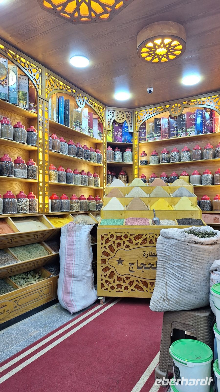 Am frühen Abend machen wir dann mit Essam noch einen Spaziergang zum Souk von Assuan. Hier kaufen nicht nur Touristen, sondern vor allem auch Einheimische ein. Als wichtiges Zentrum des Karawanenhandels war Assuan schon im Altertum bekannt für seine hochwertigen Gewürze, die in Ägypten bis heute nicht nur in der Küche, sondern auch als Heilmittel Einsatz finden. Unser Reiseleiter führt uns durch das Straßengewirr zielgerichtet zum Gewürzhandel seines Vertrauens. Hier werden wir auf sehr unterhaltsame Art mit den verschiedenen Wirkstoffen der einzelnen Pflanzen vertraut gemacht, dürfen schnuppern und probieren – und decken uns im Anschluss mit Mehrjahresvorräten ein. Wir lernen: Ägyptische Haushalte haben einen deutlich höheren Verbrauch an Gewürzen als Deutsche und hier wird nicht nach Gram, sondern nach Kilogramm eingekauft. Ein ordentlicher Kulturschock für einige von uns.