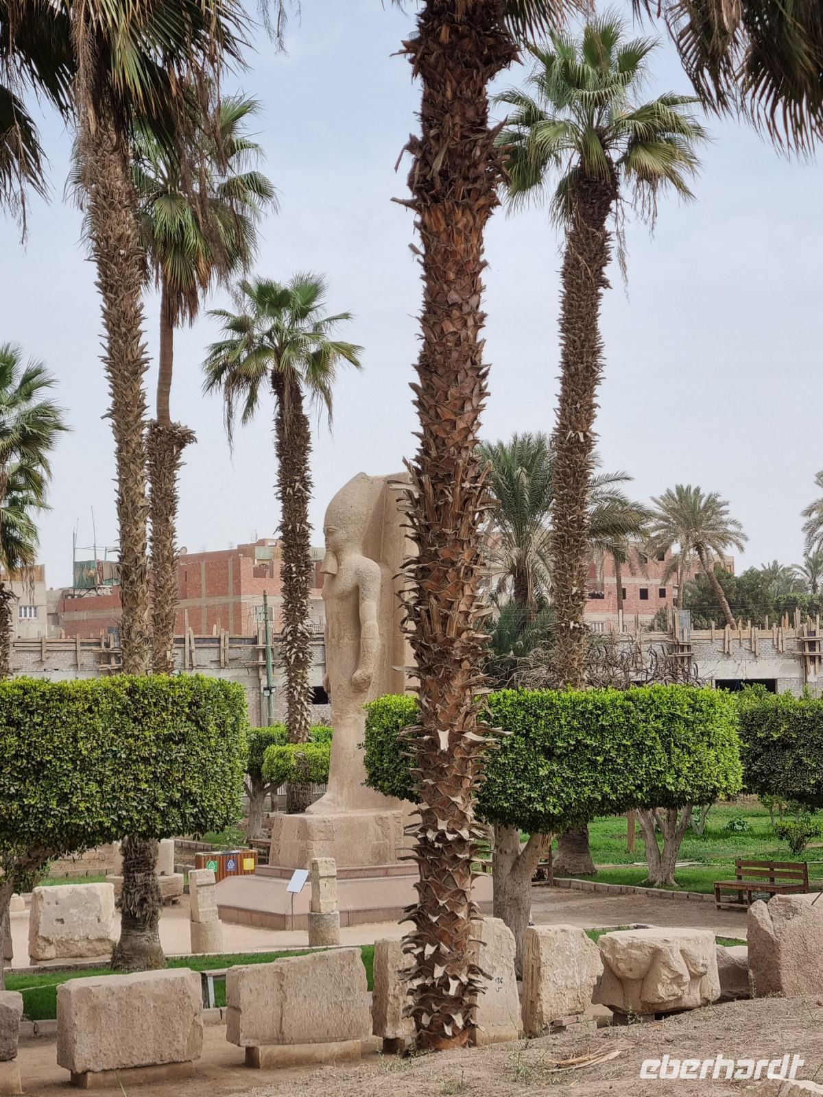 Heute war es nun endlich soweit und wir werden die ältesten und berühmtesten Bauwerke der Welt besuchen – die Pyramiden von Giseh... Am frühen Morgen fuhren wir jedoch zunächst nach Sakkara und schauten uns hier erst einmal die Stufenpyramide in der Anlage von Sakkara an. Diese bedeutendste Totenstadt aus dem alten Ägypten ist einer der wichtigsten Fundorte des ganzen Landes. Der Name Sakkara leitet sich vermutlich vom ägyptischen Gott Sokar ab, einem archaischen Totengott der Region westlich der alten Residenzstadt und Reichsmetropole Memphis. Auf dem Gelände befinden sich sowohl Grabanlagen, Mastabas und Pyramiden aus dem Alten und Mittleren Reich als auch Katakomben und Totentempel. Etwa 3.000 Jahre lang war Sakkara eine der bedeutendsten Stätten für den Totenkult, Grablegung und Verehrung von Verstorbenen. Wir standen andächtig vor der Pyramide des Königs Djoser – fasziniert von deren Höhe, den Unmengen aufeinanderliegenden liegenden Steinen und konnten uns einfach nicht vorstellen, wie die alten Ägypter solche Bauten bewerkstelligt haben. Nach den hochinteressanten Erzählungen unseres Reiseleiters Essam brachen wir anschließend in das benachbarte Memphis, der ersten Hauptstadt Unterägyptens, auf. Die Ruinen hier zählen seit 1979 zum UNESCO-Weltkulturerbe. Die gesamte Anlage wurde vermutlich von König Menes etwa 3000 vor unserer Zeitrechnung gegründet und stand unter dem Schutz des Gottes Ptah, dessen Tempel sich im Zentrum der antiken Stadt befand. Diese Hauptstadt nahm eine strategisch wichtige Position am Beginn des Nildeltas ein und beherbergte etliche Werk- und Produktionsstätten. Nach dem Aufstieg Alexandrias verlor die Anlage allerdings ihre wirtschaftliche Führungsrolle und man gab sie nach und nach auf. Nach so viel Kultur und Geschichte bedarf es einer Stärkung und es war tatsächlich bereits wieder Zeit für ein kleines Mittagessen. Also kehrten wir kurzerhand in eine gemütliche Karawanserei mit einem Restaurant namens "El Ezba" in einem üppig grünen Garten ein. Man servierte uns hier hervorragendes frisch gebackenes Holzofen-Fladenbrot, die leckeren arabischen Mezze (Vorspeisen) und äußerst delikates Fleisch vom Tischgrill. Derart gut gestärkt war es nun am Nachmittag soweit und der Höhepunkt einer jeden Ägyptenreise stand an – der Besuch des Plateaus von Giseh mit der Cheops, Chefren- und Mykerinospyramide und dem berühmten Sphinx. Ja, richtig gelesen: "DER" Sphinx. Nachdem wir uns mit dem Bus die Anhöhe hochgearbeitet hatten, liefen wir zuerst einmal um die Cheopspyramide herum. Ein Franzose hat einmal ausgerechnet, daß die Steine dieser Pyramide, wenn man sie zu einer drei Meter hohen Mauer auftürmen würde, einen Wall rund um Frankreich bilden würden. Das Gefühl, leibhaftig vor diesen Bauten zu stehen, lässt sich nur schwer beschreiben, wir wirkten unbestritten wie kleine Ameisen an den Füßen dieser Riesen. Bis heute gibt es verschiedene Theorien über die Entstehung und die genaue Zeit der Erbauung. Die wahrscheinlichste davon ist die, dass man außen eine schräge Rampe provisorisch errichtete, über die man die tonnenschweren Steine nach oben beförderte. Allein für die Cheopspyramide wurden über 2,3 Millionen Steinblöcke verwendet, einst wurde sie von 5,5 Millionen Tonnen Kalkstein bedeckt. Jeder der riesigen Steinblöcke wiegt zwischen 2 und 16 Tonnen. Wir kamen aus dem Staunen gar nicht mehr raus, denn diese Bauten strahlten regelrecht Würde und Magie aus und wir schauen andächtig nach oben...! Die Zeit verging wie im Fluge und wir wollten natürlich auch noch den großen Sphinx anschauen. Diese Skulptur hat den Körper eines Löwen und den Kopf eines Mannes. Die alten Griechen gaben ihm den Namen Sphinx, da sie dem geflügelten Ungeheuer aus der griechischen Mythologie ähnelte. Bei den Arabern ist dieses Fabelwesen nur unter dem Namen Abu Al Hol bekannt, was so viel wie "Vater des Schreckens" bedeutet. Nun waren wir wirklich erschöpft und begaben uns, eingestaubt vom Wüstensand, auf den Rückweg ins Hotel. Nach dem Abendessen verabschiedeten wir uns schnell – eine kurze Nacht stand bevor, denn morgen früh wollten wir zeitig nach Luxor weiterfliegen...