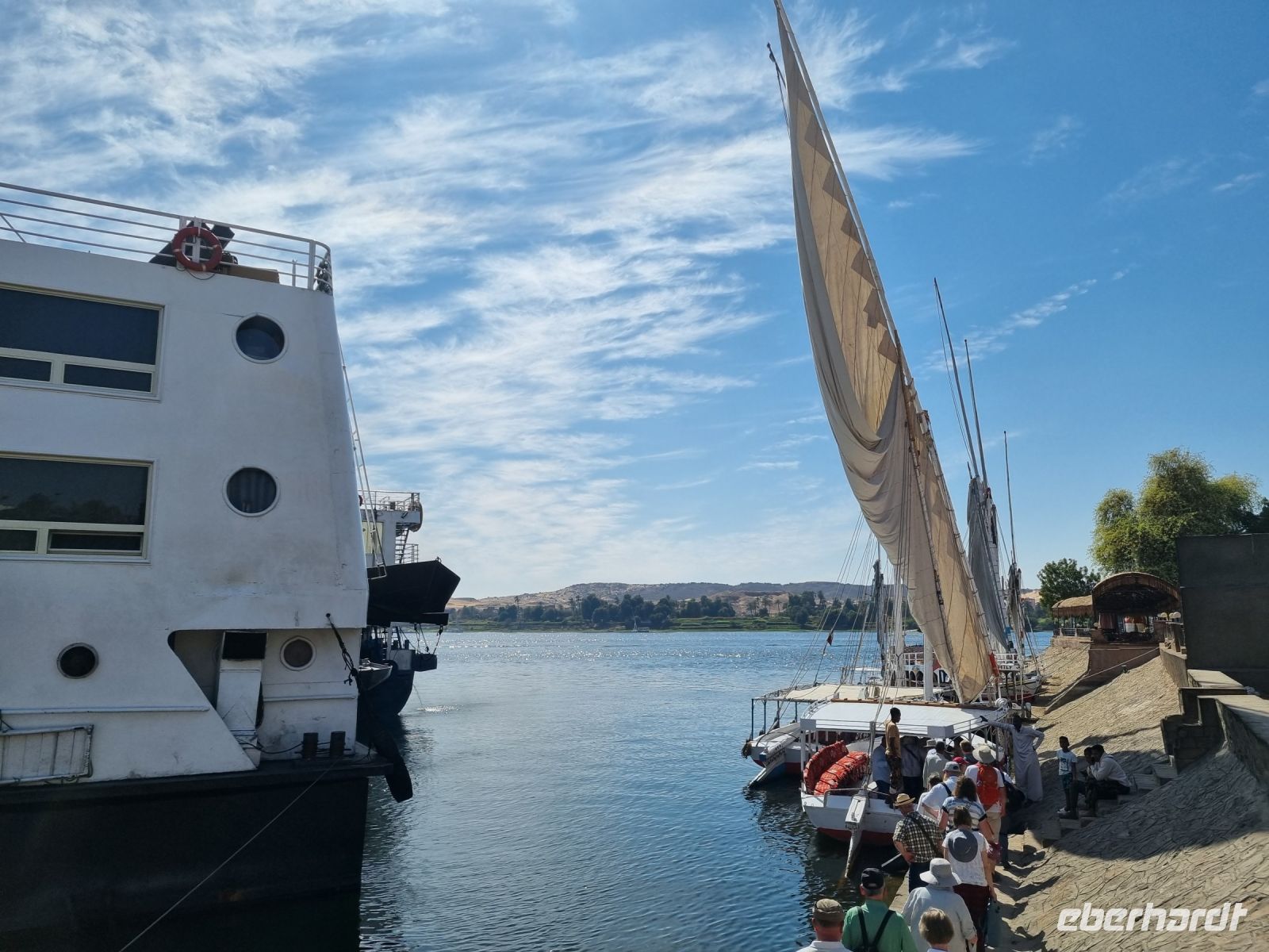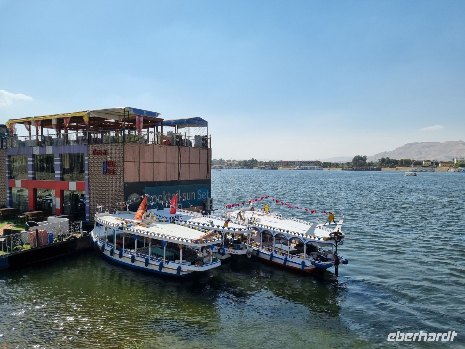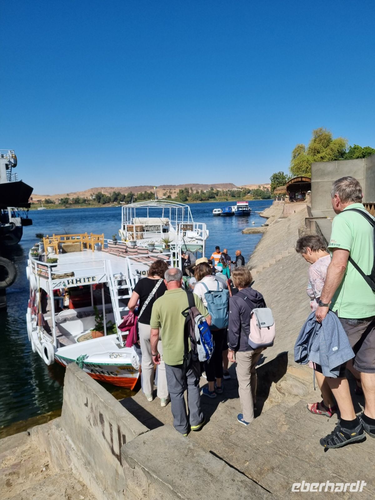 Eine Mittagspause auf unserem Schiff weckte die Lebensgeister und wir verließen Assuan. Am späten Nachmittag erreichte die MS "Nile Style" erneut die Anlegestelle in Kom Ombo und hier gingen wir nochmals von Bord, allerdings diesmal mit dem Gedanken an eine Shisha-Wasserpfeife bzw. ein gemütliches Tee- und Kaffeetrinken in entspannter orientalischer Atmoshäre. Die Firma Eberhardt TRAVEL lud uns dazu ein! Ein Barbeque-Abendessen auf dem Sonnendeck und eine anschließende Galabeya-Party in der Lounge-Bar rundeten diesen erlebnisreichen Tag ab. Noch an diesem Abend erreichten wir Edfu, wo wir die Nacht verbrachten.