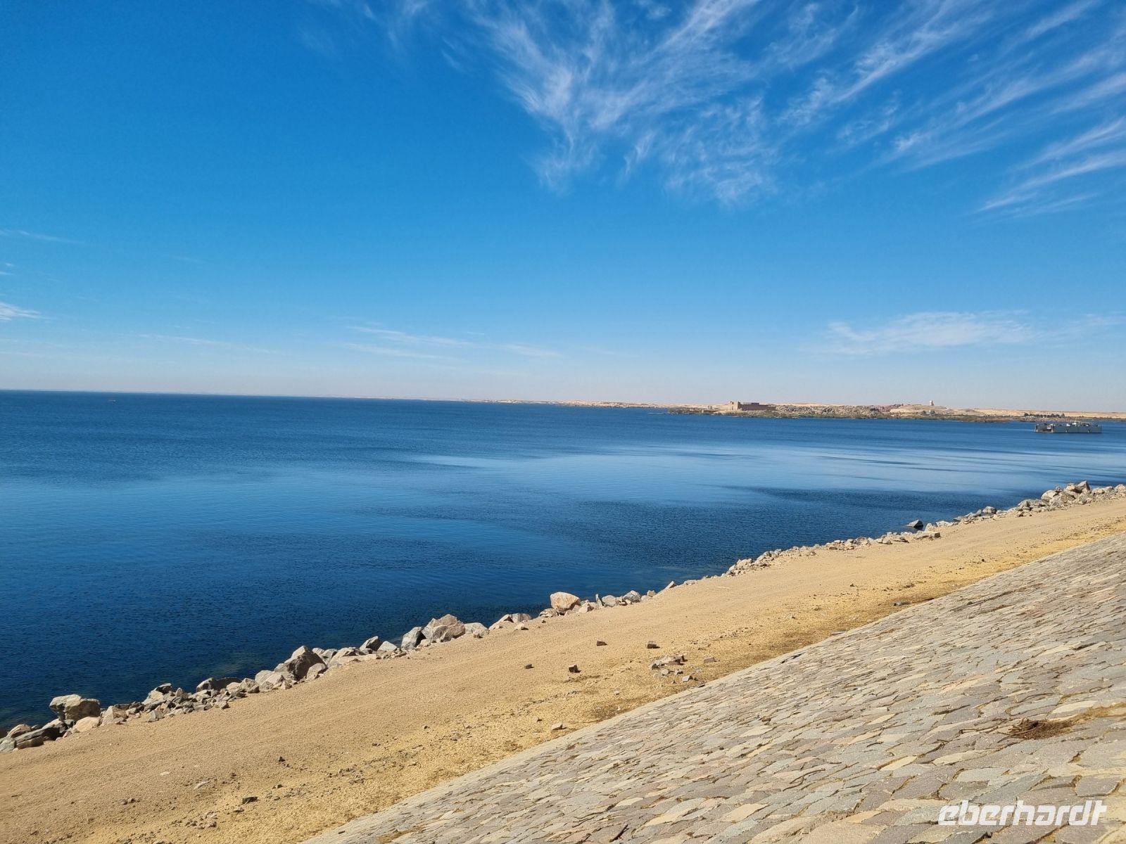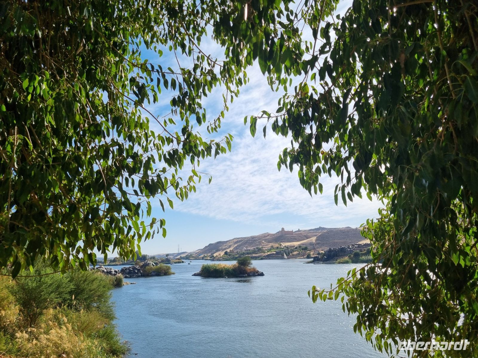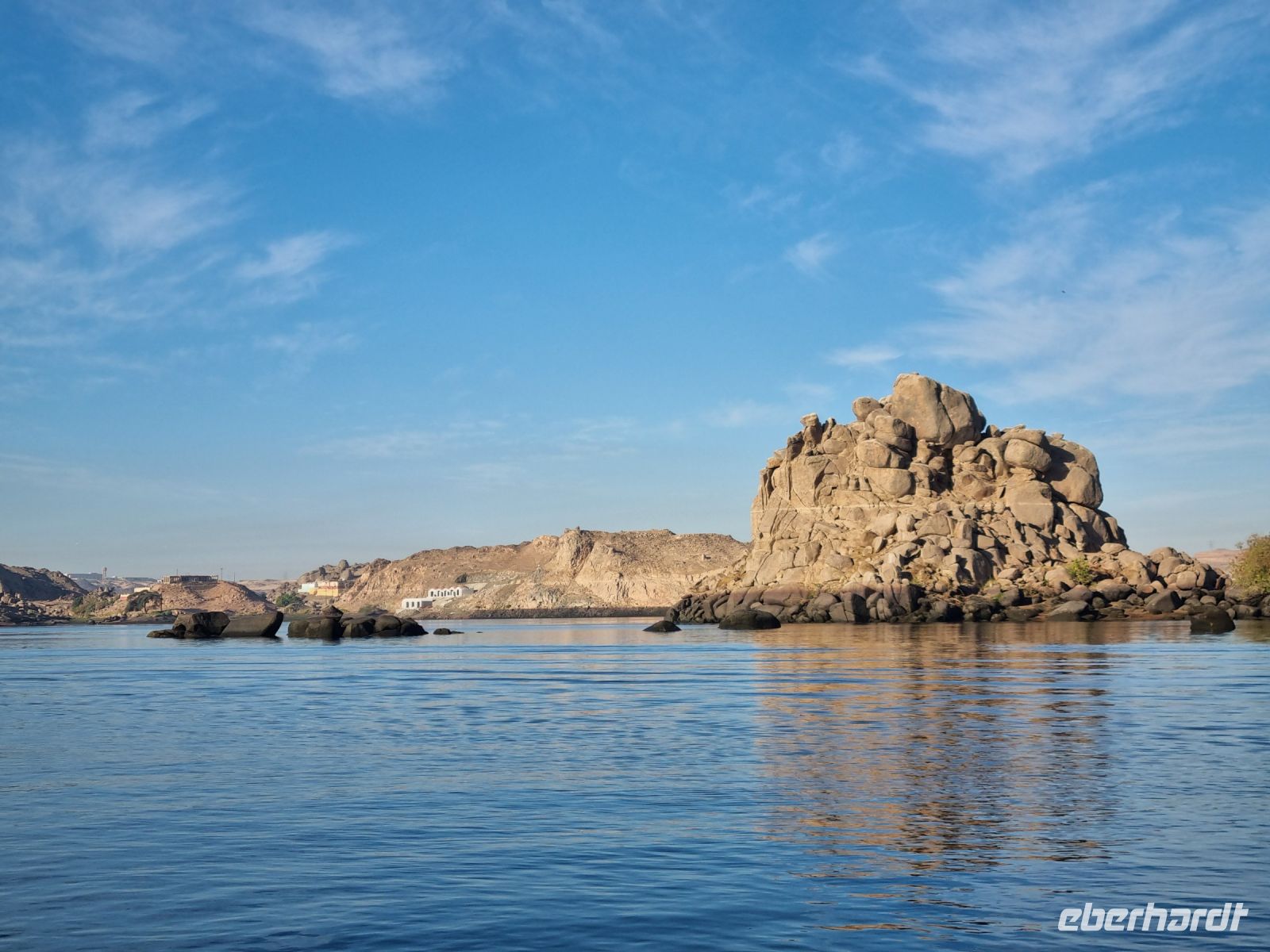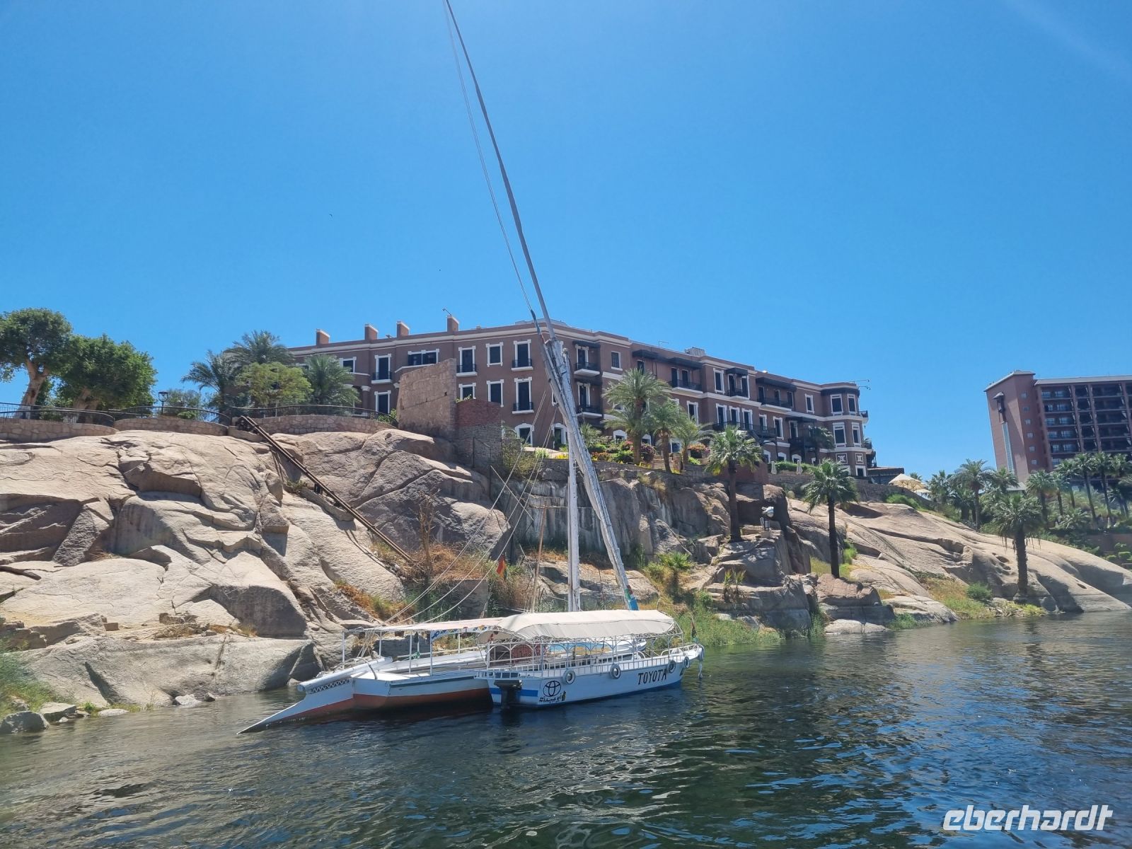 Wir frühstückten, wie nun schon gewohnt, sehr zeitig. Bereits um 6.30 Uhr verließen wir das Schiff und begaben uns mit dem Bus zur Anlegestelle eines Motorbootes, welches uns in nur etwa 10 Minuten zur Insel Philae brachte. Der hier befindliche Tempel drohte in den Fluten des angestauten Nils unterzugehen, denn bereits nach dem Bau des ersten Staudamms überflutete das Wasser teilweise die Insel, aber der neue Hochdamm gefährdete den Tempel ernsthaft. Daraufhin wurde beschlossen, den Tempel auf die höher gelegene Insel Agilkia umzusiedeln. So kann man nun ungefährdet zunächst den malerischen Kiosk aus dem 4. Jh. v. Chr. ansehen, um sich danach den aus der Zeit des römischen Kaisers Augustus stammenden Kolonnaden-Reihen zu widmen. An den Wänden des Geburtshauses des Gottes Horus sind Szenen aus seinem Leben dargestellt, u. a. sieht man Horus als Säugling zusammen mit seiner Mutter Isis. Am zierlichen Trajan-Kiosk vorbei ging es wieder zurück zum Boot, denn wir hatten ja noch so einiges vor. Mit dem Bus fuhren wir über den Staudamm, mit dessen Bau Ägypten nicht nur das Wasserproblem löste, sondern auch einen großen Teil der benötigten Elektrizität aus Wasserkraft gewinnt. Am Projekt waren sowohl Deutschland als auch die damalige Sowjetunion beteiligt. Der 1971 fertiggestellte Damm ist immerhin knapp vier Kilometer lang und einfach ein sehr imposantes Bauwerk! Unser nächstes Ziel war wenig später eine Papyrus-Galerie in Assuan, wo wir ausführlich erklärt bekamen, wie Papyrus zu Papier verarbeitet wird. Hier konnten wir zudem auch schön bemalte Blätter mit unseren Namen in Hieroglyphen-Schriftzeichen erwerben. Übrigens feierte man heute den Ägyptischen Muttertag und jede Frau unserer Gruppe erhielt daher ein Papyrus-Lesezeichen als Geschenk von Essam. Mittlerweile war es schon recht warm geworden, aber wir wollten trotzdem noch einen Steinbruch mit einem unvollendeten Obelisken besichtigen. Beim Rundgang durch den Steinbruch konnten wir uns lebhaft vorstellen, wie anstrengend die Arbeit hier in sengender Sonne gewesen sein muss. Wir hingegen konnten uns nun auf ein gutes Mittagessen auf unserem Schiff freuen. Danach genossen wir eine kleine entspannende Auszeit, bevor es am Nachmittag mit einer Feluke zum Botanischen Garten auf Kitchener Island ging. Die Feluken sind eine sehr umweltfreundliche Beförderungsart, die kleinen Segelschiffe, ursprünglich im Mittelmeer beheimatet, nutzen nur die Windkraft als Antrieb. Dennoch sind wir schnell auf Kitchener Island. Lord Kitchener ließ Ende des 19.Jahrhunderts viele tropische Pflanzen auf die Insel bringen und schuf so einen kleinen Botanischen Garten. Neben den aus Kuba stammenden Königspalmen findet man auch die heimische Doumpalme, erkennbar an der Verzweigung des Stammes, was sonst bei Palmen nicht vorkommt. Nach einem gemütlichen Bummel über die Insel kehrten wir zurück auf unser Schiff und bereiteten uns auf ein erneutes frühes Aufstehen vor.