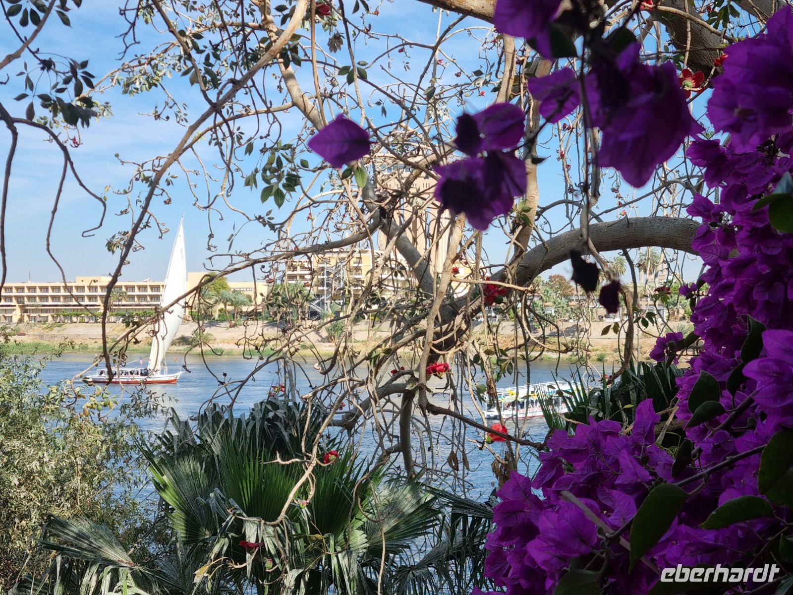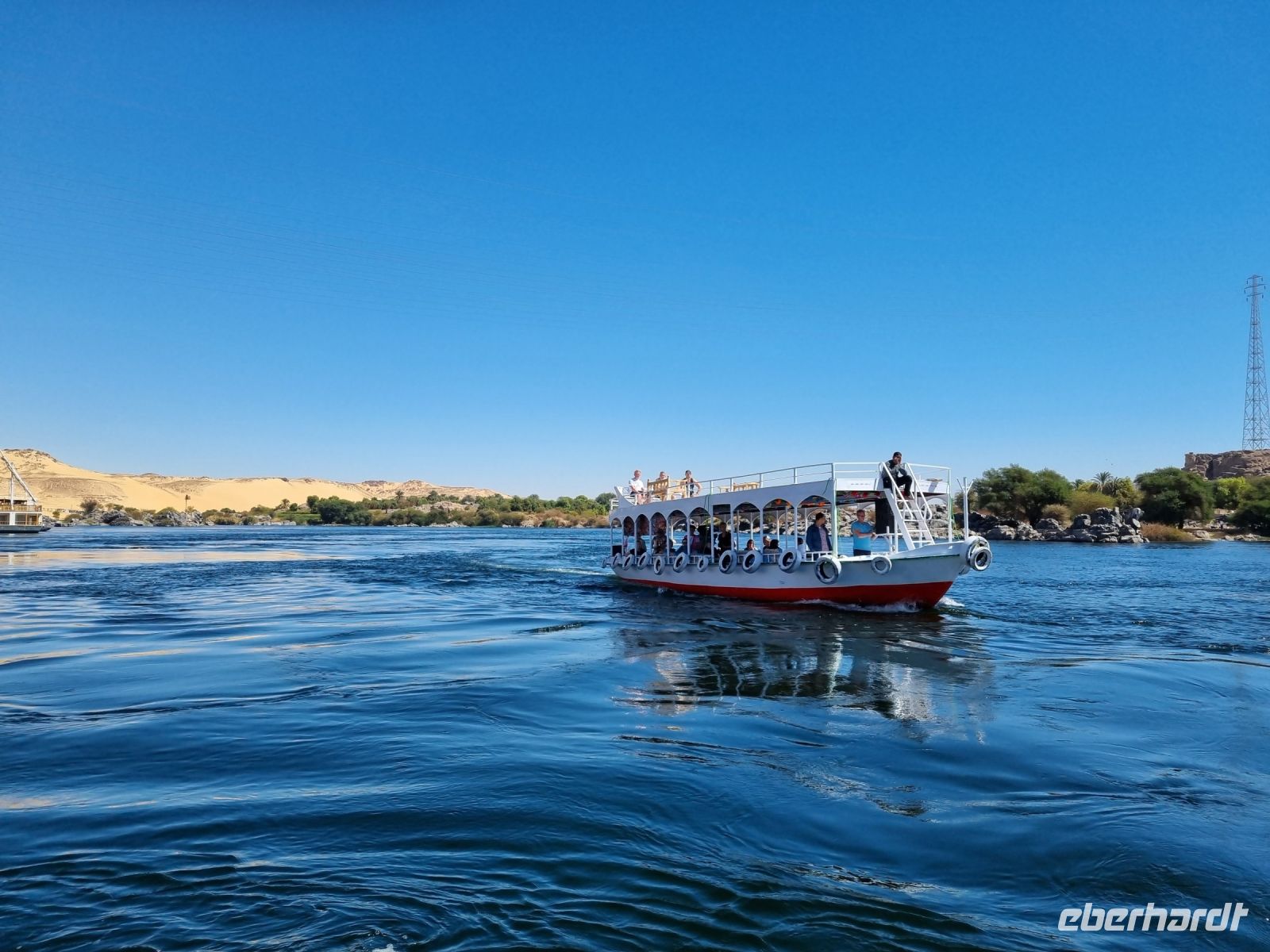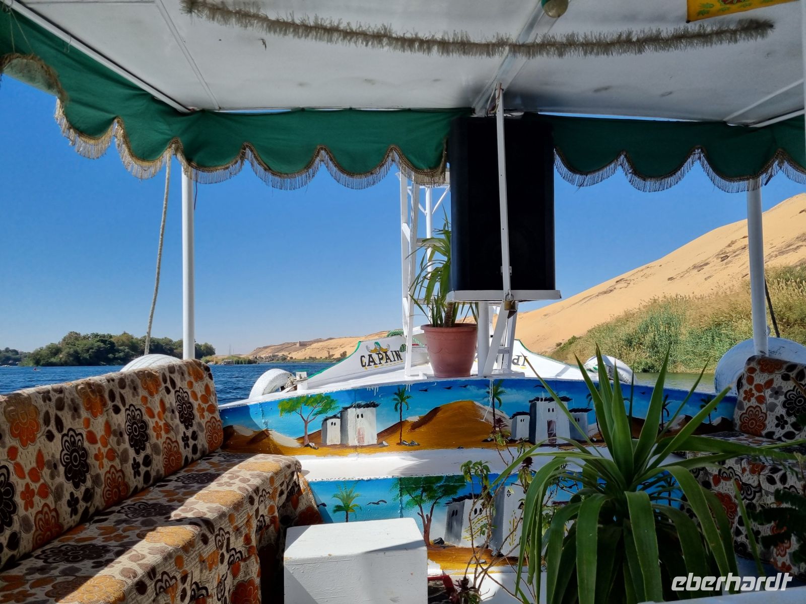 Wir frühstückten, wie nun schon gewohnt, sehr zeitig. Bereits um 6.30 Uhr verließen wir das Schiff und begaben uns mit dem Bus zur Anlegestelle eines Motorbootes, welches uns in nur etwa 10 Minuten zur Insel Philae brachte. Der hier befindliche Tempel drohte in den Fluten des angestauten Nils unterzugehen, denn bereits nach dem Bau des ersten Staudamms überflutete das Wasser teilweise die Insel, aber der neue Hochdamm gefährdete den Tempel ernsthaft. Daraufhin wurde beschlossen, den Tempel auf die höher gelegene Insel Agilkia umzusiedeln. So kann man nun ungefährdet zunächst den malerischen Kiosk aus dem 4. Jh. v. Chr. ansehen, um sich danach den aus der Zeit des römischen Kaisers Augustus stammenden Kolonnaden-Reihen zu widmen. An den Wänden des Geburtshauses des Gottes Horus sind Szenen aus seinem Leben dargestellt, u. a. sieht man Horus als Säugling zusammen mit seiner Mutter Isis. Am zierlichen Trajan-Kiosk vorbei ging es wieder zurück zum Boot, denn wir hatten ja noch so einiges vor. Mit dem Bus fuhren wir über den Staudamm, mit dessen Bau Ägypten nicht nur das Wasserproblem löste, sondern auch einen großen Teil der benötigten Elektrizität aus Wasserkraft gewinnt. Am Projekt waren sowohl Deutschland als auch die damalige Sowjetunion beteiligt. Der 1971 fertiggestellte Damm ist immerhin knapp vier Kilometer lang und einfach ein sehr imposantes Bauwerk! Unser nächstes Ziel war wenig später eine Papyrus-Galerie in Assuan, wo wir ausführlich erklärt bekamen, wie Papyrus zu Papier verarbeitet wird. Hier konnten wir zudem auch schön bemalte Blätter mit unseren Namen in Hieroglyphen-Schriftzeichen erwerben. Übrigens feierte man heute den Ägyptischen Muttertag und jede Frau unserer Gruppe erhielt daher ein Papyrus-Lesezeichen als Geschenk von Essam. Mittlerweile war es schon recht warm geworden, aber wir wollten trotzdem noch einen Steinbruch mit einem unvollendeten Obelisken besichtigen. Beim Rundgang durch den Steinbruch konnten wir uns lebhaft vorstellen, wie anstrengend die Arbeit hier in sengender Sonne gewesen sein muss. Wir hingegen konnten uns nun auf ein gutes Mittagessen auf unserem Schiff freuen. Danach genossen wir eine kleine entspannende Auszeit, bevor es am Nachmittag mit einer Feluke zum Botanischen Garten auf Kitchener Island ging. Die Feluken sind eine sehr umweltfreundliche Beförderungsart, die kleinen Segelschiffe, ursprünglich im Mittelmeer beheimatet, nutzen nur die Windkraft als Antrieb. Dennoch sind wir schnell auf Kitchener Island. Lord Kitchener ließ Ende des 19.Jahrhunderts viele tropische Pflanzen auf die Insel bringen und schuf so einen kleinen Botanischen Garten. Neben den aus Kuba stammenden Königspalmen findet man auch die heimische Doumpalme, erkennbar an der Verzweigung des Stammes, was sonst bei Palmen nicht vorkommt. Nach einem gemütlichen Bummel über die Insel kehrten wir zurück auf unser Schiff und bereiteten uns auf ein erneutes frühes Aufstehen vor.