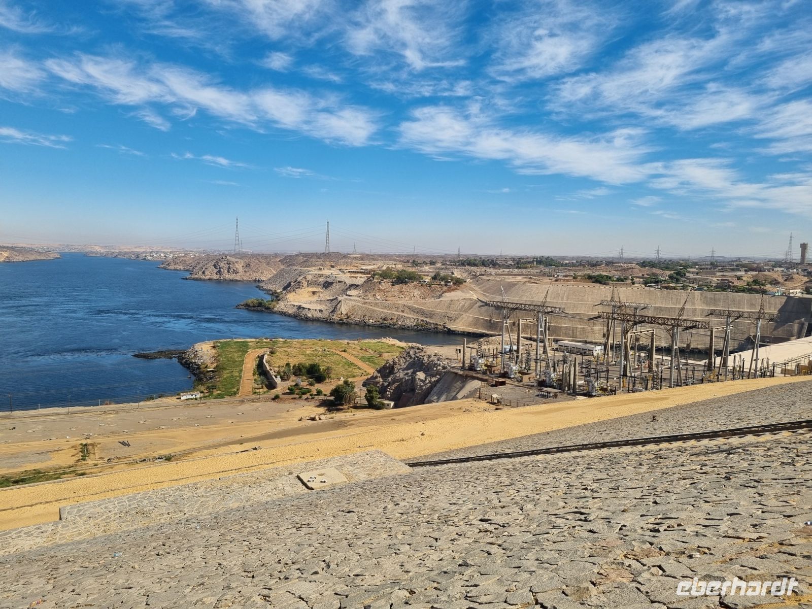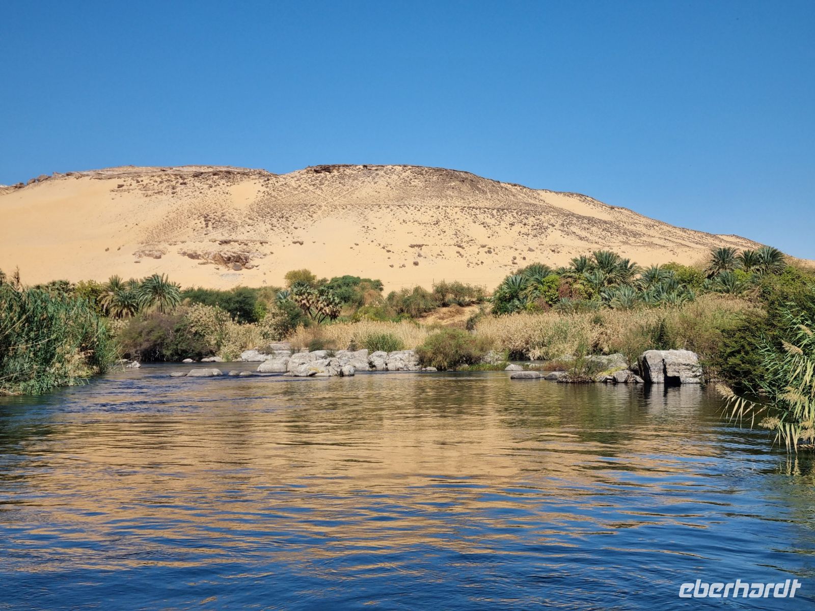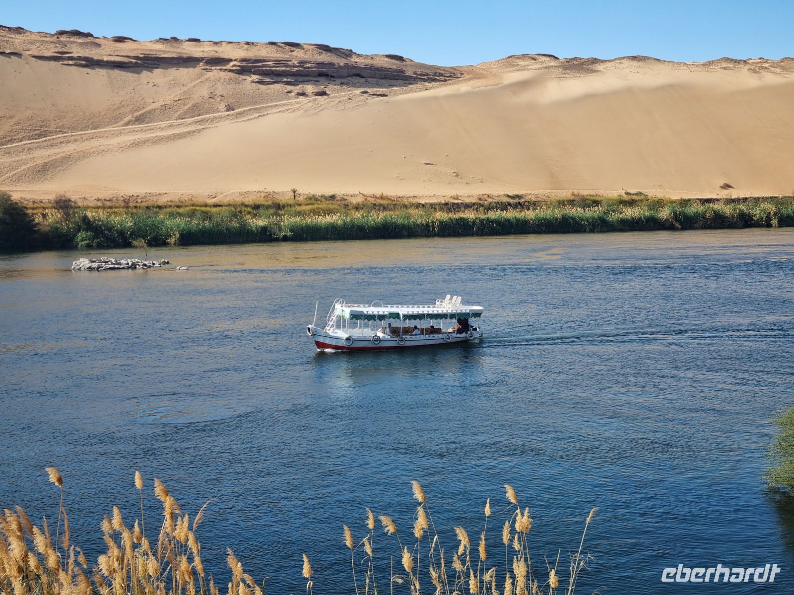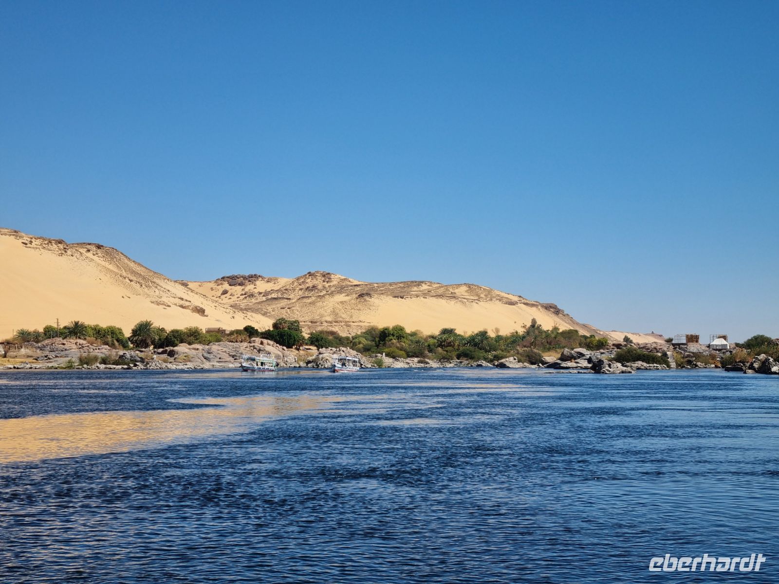 Wir frühstückten, wie nun schon gewohnt, sehr zeitig. Bereits um 6.30 Uhr verließen wir das Schiff und begaben uns mit dem Bus zur Anlegestelle eines Motorbootes, welches uns in nur etwa 10 Minuten zur Insel Philae brachte. Der hier befindliche Tempel drohte in den Fluten des angestauten Nils unterzugehen, denn bereits nach dem Bau des ersten Staudamms überflutete das Wasser teilweise die Insel, aber der neue Hochdamm gefährdete den Tempel ernsthaft. Daraufhin wurde beschlossen, den Tempel auf die höher gelegene Insel Agilkia umzusiedeln. So kann man nun ungefährdet zunächst den malerischen Kiosk aus dem 4. Jh. v. Chr. ansehen, um sich danach den aus der Zeit des römischen Kaisers Augustus stammenden Kolonnaden-Reihen zu widmen. An den Wänden des Geburtshauses des Gottes Horus sind Szenen aus seinem Leben dargestellt, u. a. sieht man Horus als Säugling zusammen mit seiner Mutter Isis. Am zierlichen Trajan-Kiosk vorbei ging es wieder zurück zum Boot, denn wir hatten ja noch so einiges vor. Mit dem Bus fuhren wir über den Staudamm, mit dessen Bau Ägypten nicht nur das Wasserproblem löste, sondern auch einen großen Teil der benötigten Elektrizität aus Wasserkraft gewinnt. Am Projekt waren sowohl Deutschland als auch die damalige Sowjetunion beteiligt. Der 1971 fertiggestellte Damm ist immerhin knapp vier Kilometer lang und einfach ein sehr imposantes Bauwerk! Unser nächstes Ziel war wenig später eine Papyrus-Galerie in Assuan, wo wir ausführlich erklärt bekamen, wie Papyrus zu Papier verarbeitet wird. Hier konnten wir zudem auch schön bemalte Blätter mit unseren Namen in Hieroglyphen-Schriftzeichen erwerben. Übrigens feierte man heute den Ägyptischen Muttertag und jede Frau unserer Gruppe erhielt daher ein Papyrus-Lesezeichen als Geschenk von Essam. Mittlerweile war es schon recht warm geworden, aber wir wollten trotzdem noch einen Steinbruch mit einem unvollendeten Obelisken besichtigen. Beim Rundgang durch den Steinbruch konnten wir uns lebhaft vorstellen, wie anstrengend die Arbeit hier in sengender Sonne gewesen sein muss. Wir hingegen konnten uns nun auf ein gutes Mittagessen auf unserem Schiff freuen. Danach genossen wir eine kleine entspannende Auszeit, bevor es am Nachmittag mit einer Feluke zum Botanischen Garten auf Kitchener Island ging. Die Feluken sind eine sehr umweltfreundliche Beförderungsart, die kleinen Segelschiffe, ursprünglich im Mittelmeer beheimatet, nutzen nur die Windkraft als Antrieb. Dennoch sind wir schnell auf Kitchener Island. Lord Kitchener ließ Ende des 19.Jahrhunderts viele tropische Pflanzen auf die Insel bringen und schuf so einen kleinen Botanischen Garten. Neben den aus Kuba stammenden Königspalmen findet man auch die heimische Doumpalme, erkennbar an der Verzweigung des Stammes, was sonst bei Palmen nicht vorkommt. Nach einem gemütlichen Bummel über die Insel kehrten wir zurück auf unser Schiff und bereiteten uns auf ein erneutes frühes Aufstehen vor.